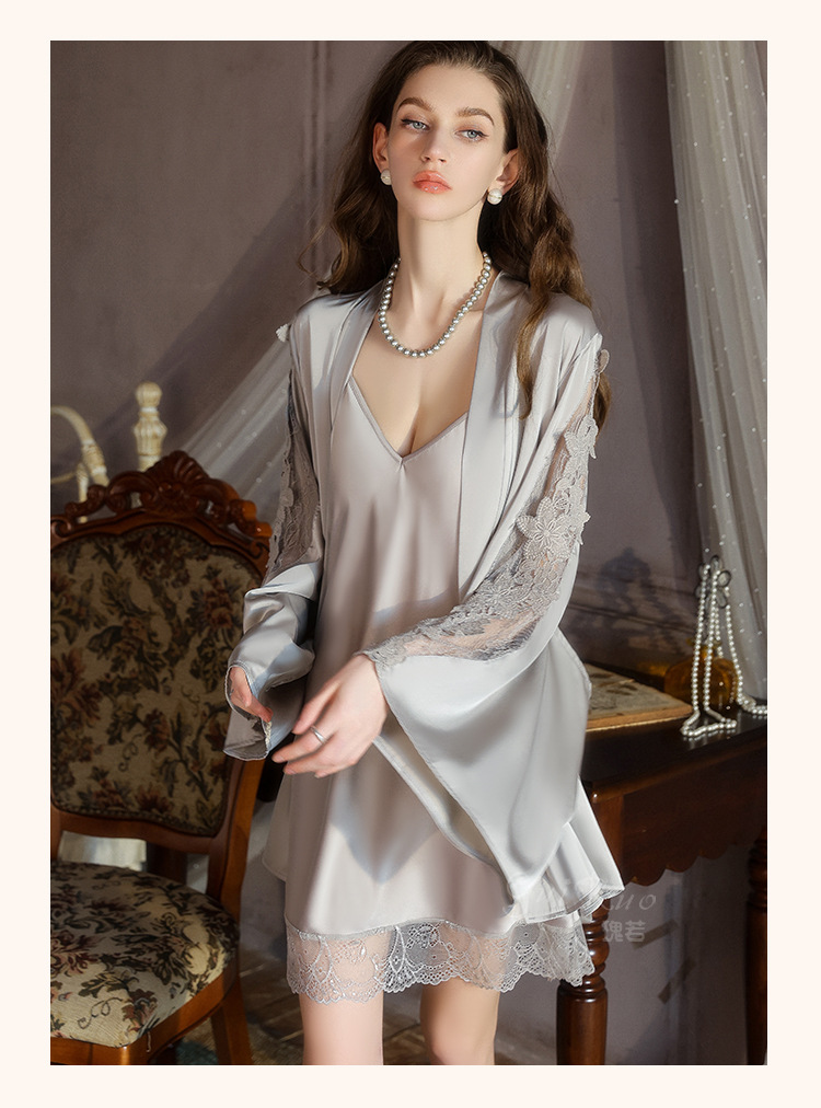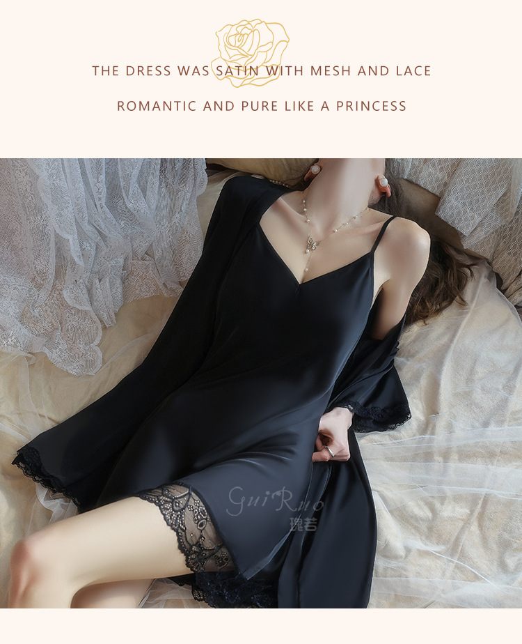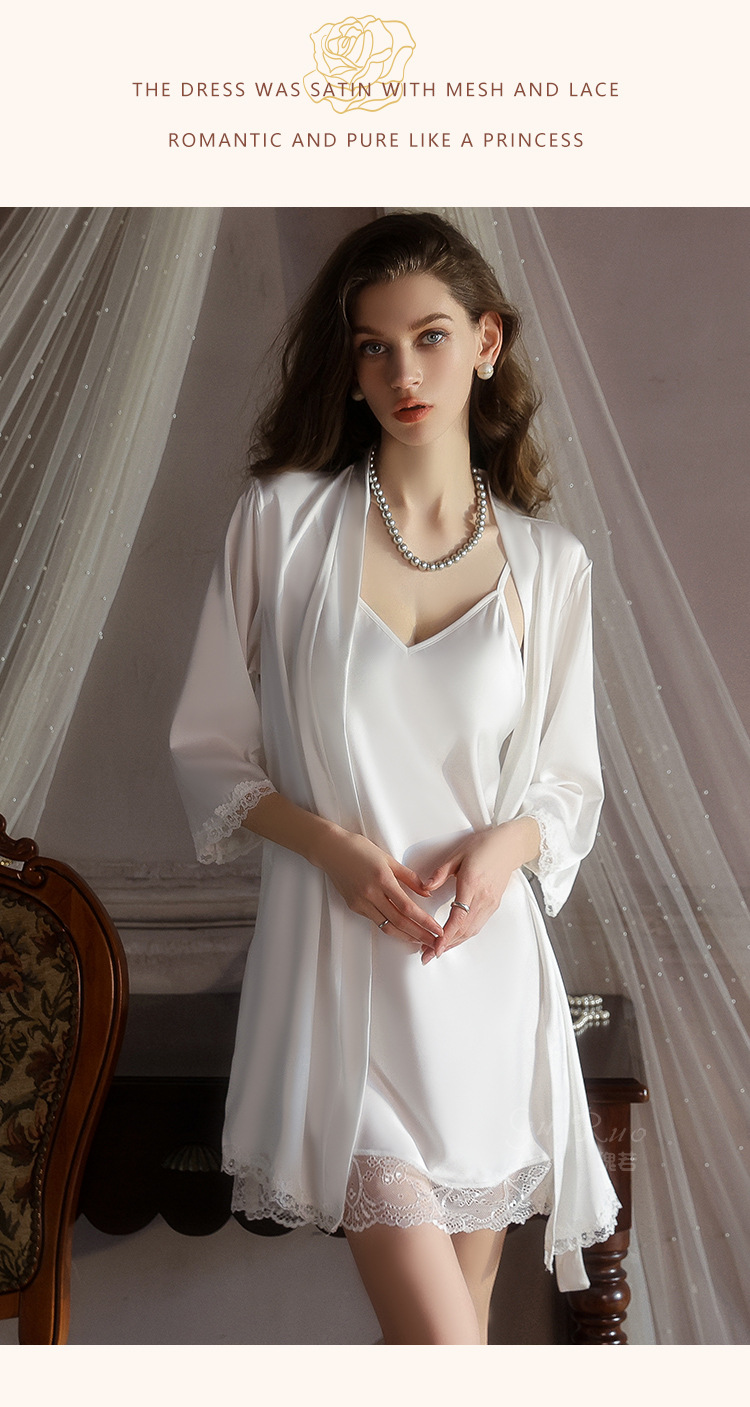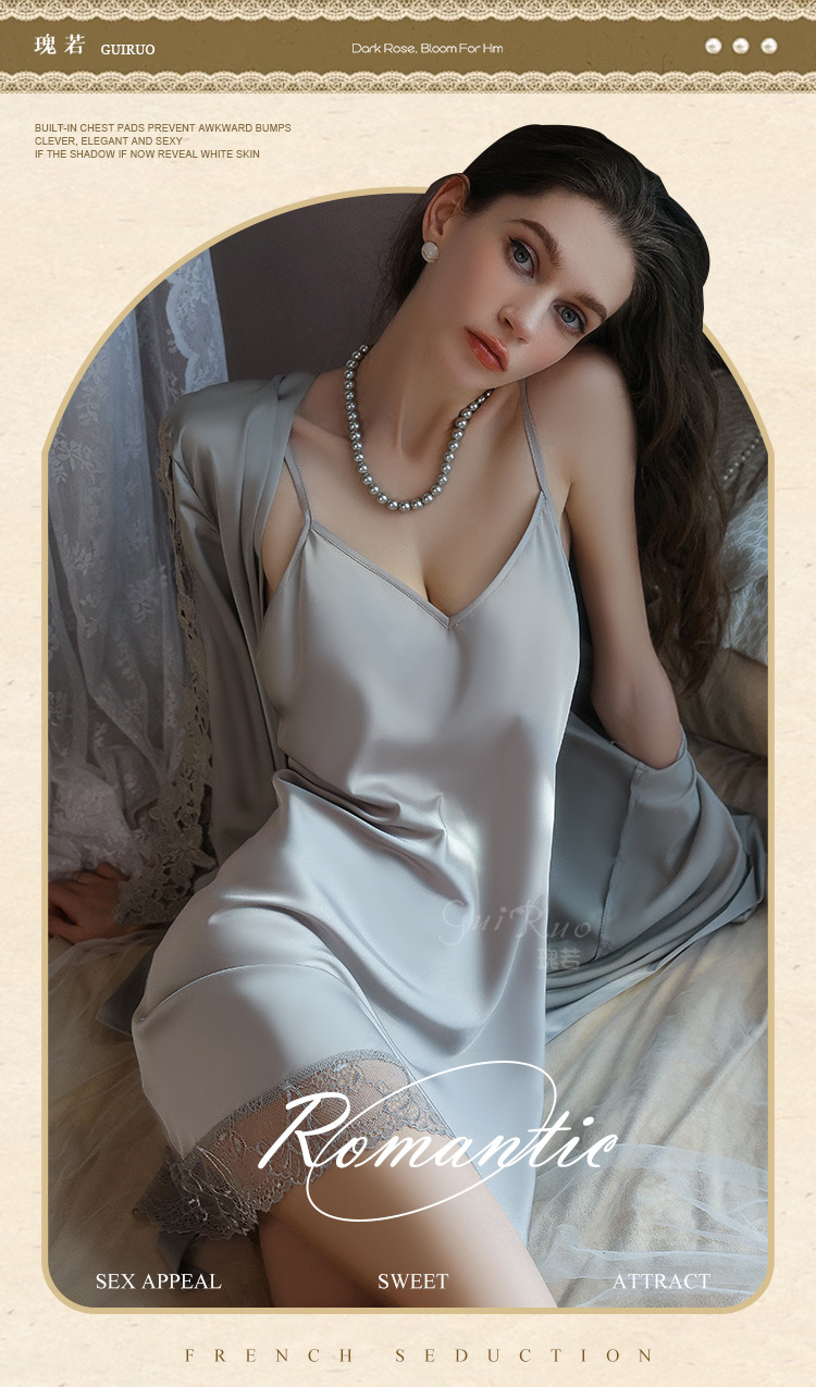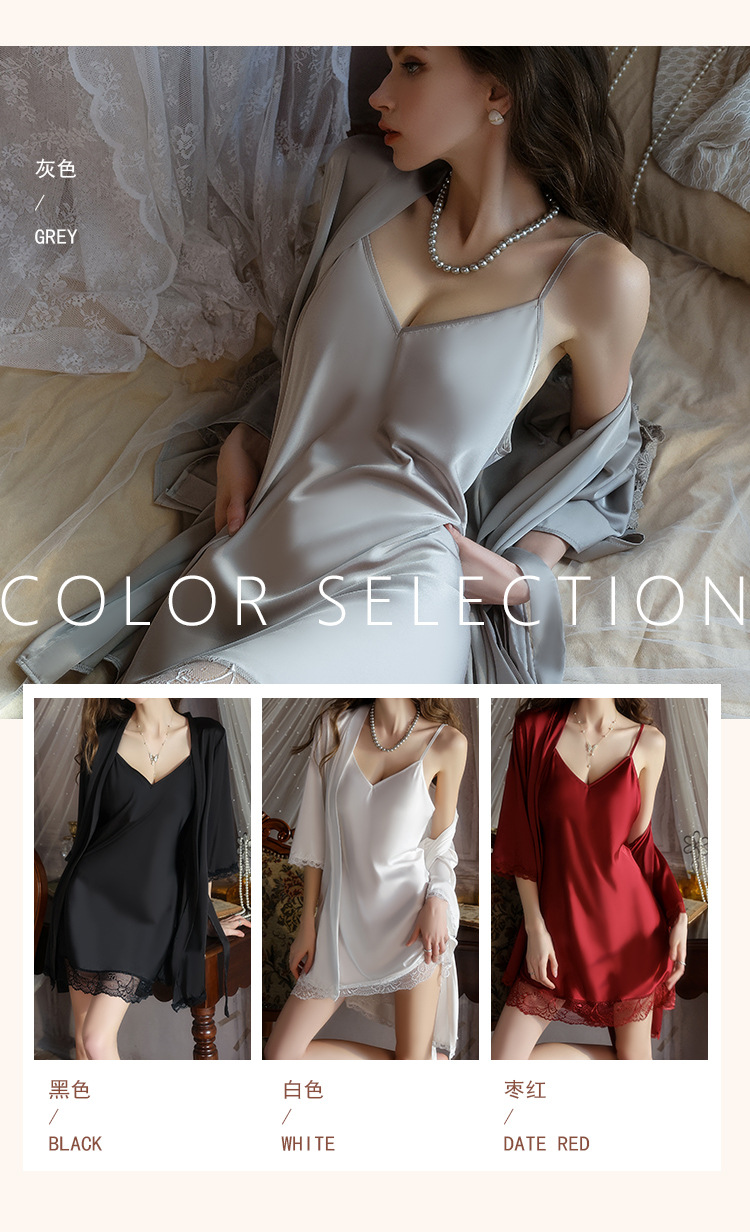 【YW】无忧购深V聚拢加胸垫纯欲顺滑缎面睡裙舒适外袍套装5610(截单后3-5天发货)