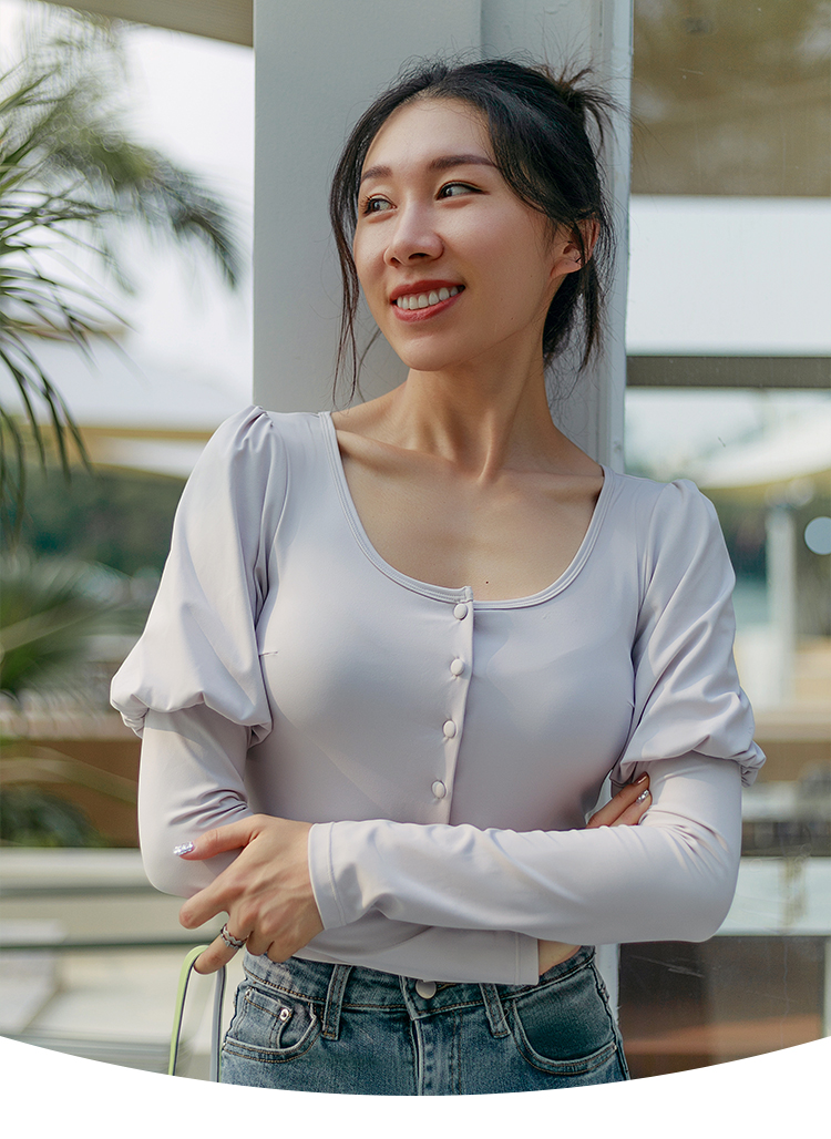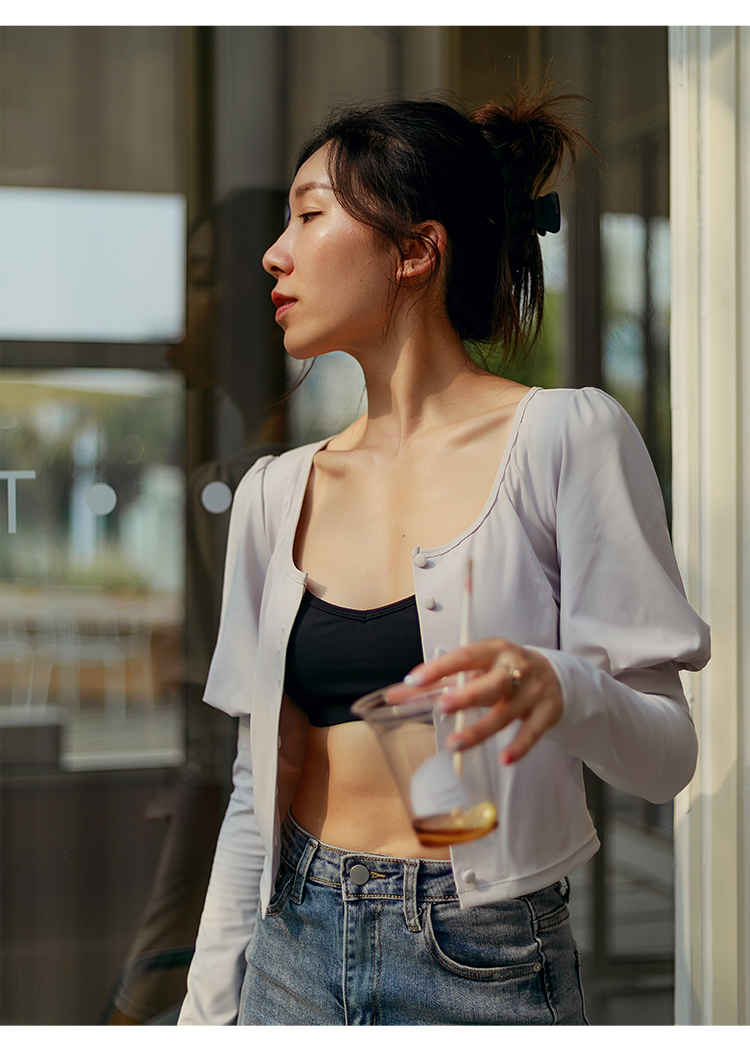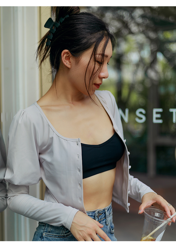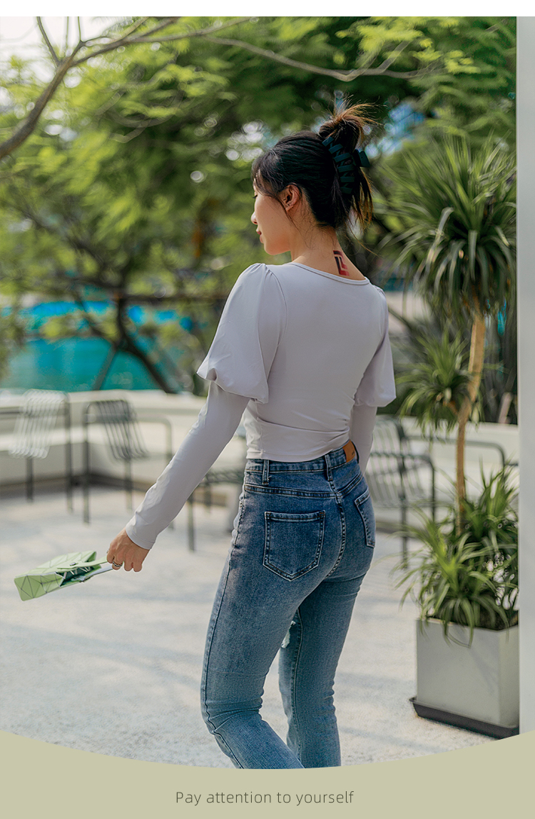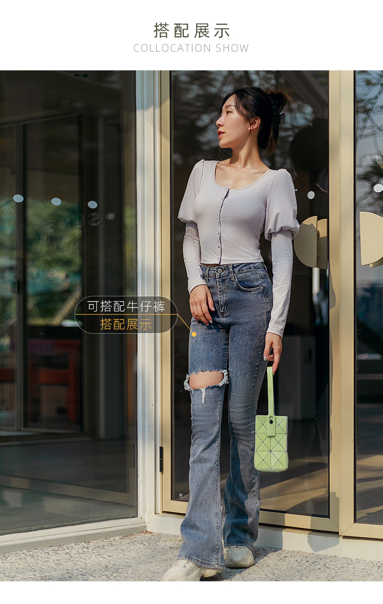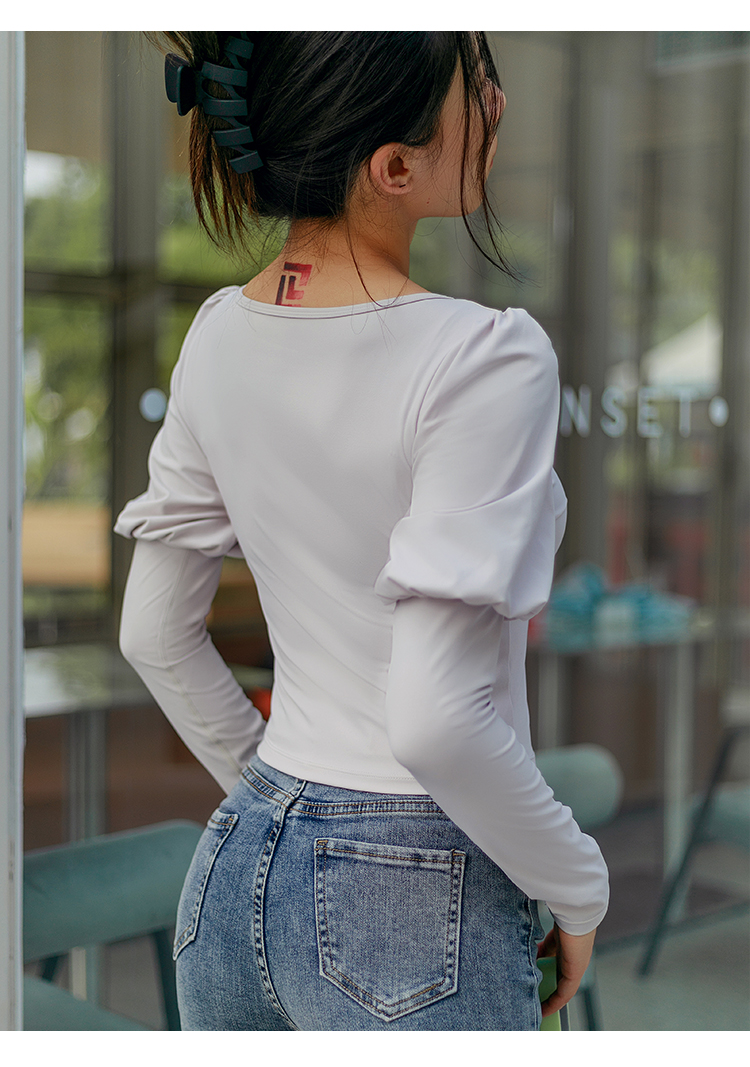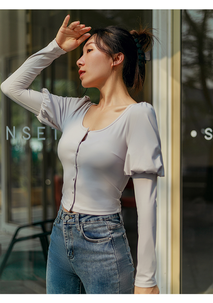 【裸感】大圆领前排扭扣泡泡袖运动上衣女长袖T恤