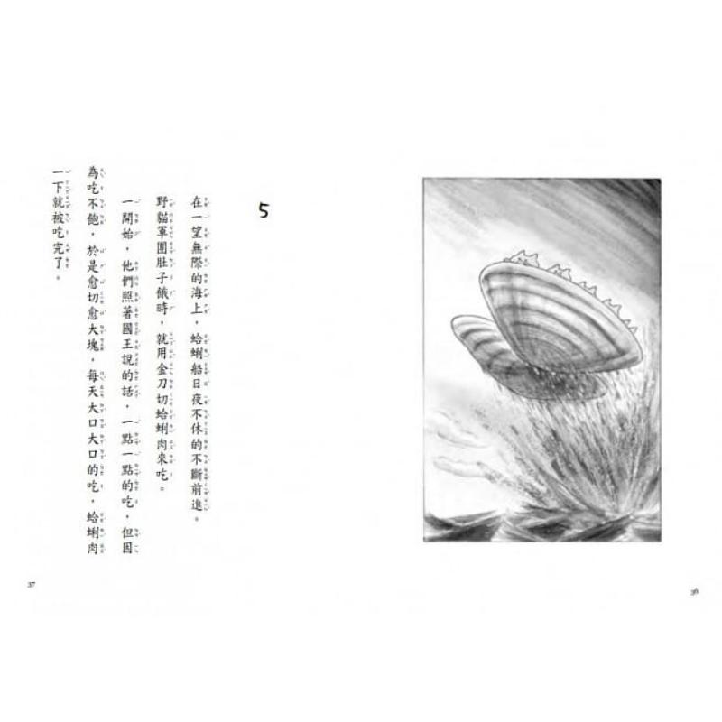 于是野猫军团乘着蛤蜊船前往海的尽头,可是,野猫军团因为吃不饱,每天大口大口的吃,蛤蜊肉一下就被吃完了。