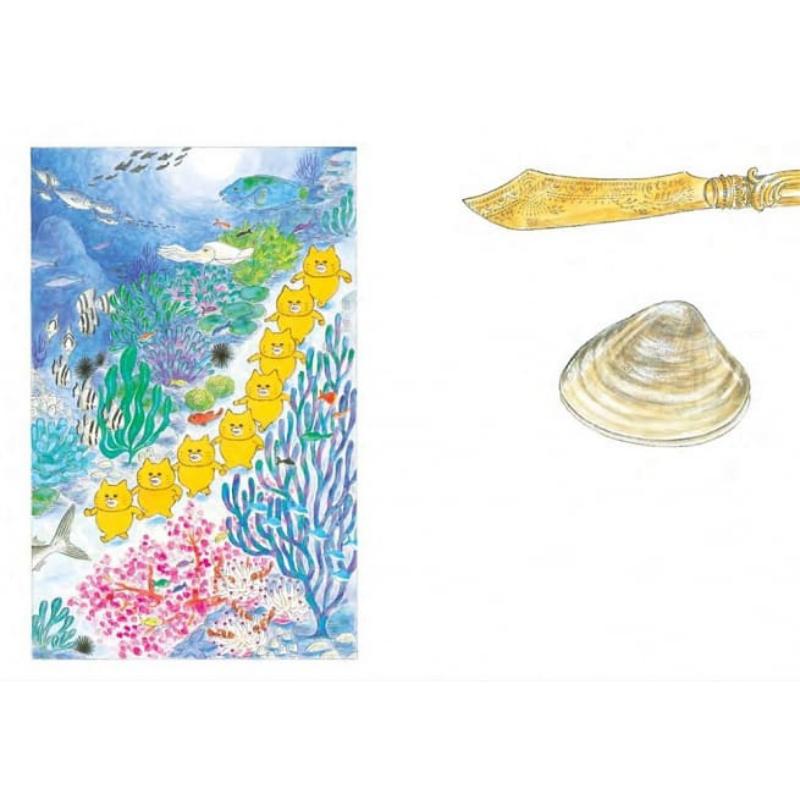 国王对野猫军团说:「野猫军团啊,你们是生活在陆地上。说不定你们可以打倒大海怪。如果将怪物打倒,把公主带回来,我就饶你们一命!」「坐上这艘蛤蜊船,念着想要去的地方,就会载你们前往。带上这个用水晶做成的水壶,这把金刀也赐给你们。水晶壶的水,不管怎么喝都喝不完。如果肚子饿了,就用这把金刀切蛤蜊的肉来吃。请你们珍惜的一点一点的吃,全部吃完的时候应该就到海的尽头了。」