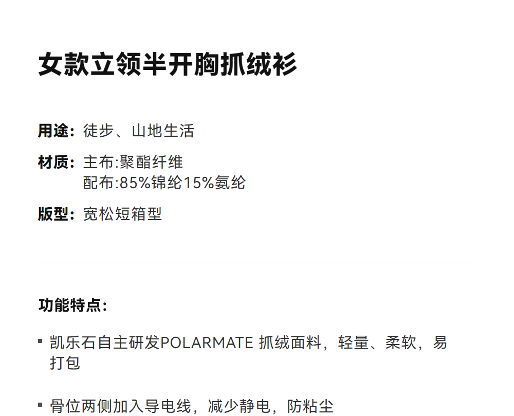 KAILAS凯乐石 女款立领半开胸抓绒衫 KG2532213