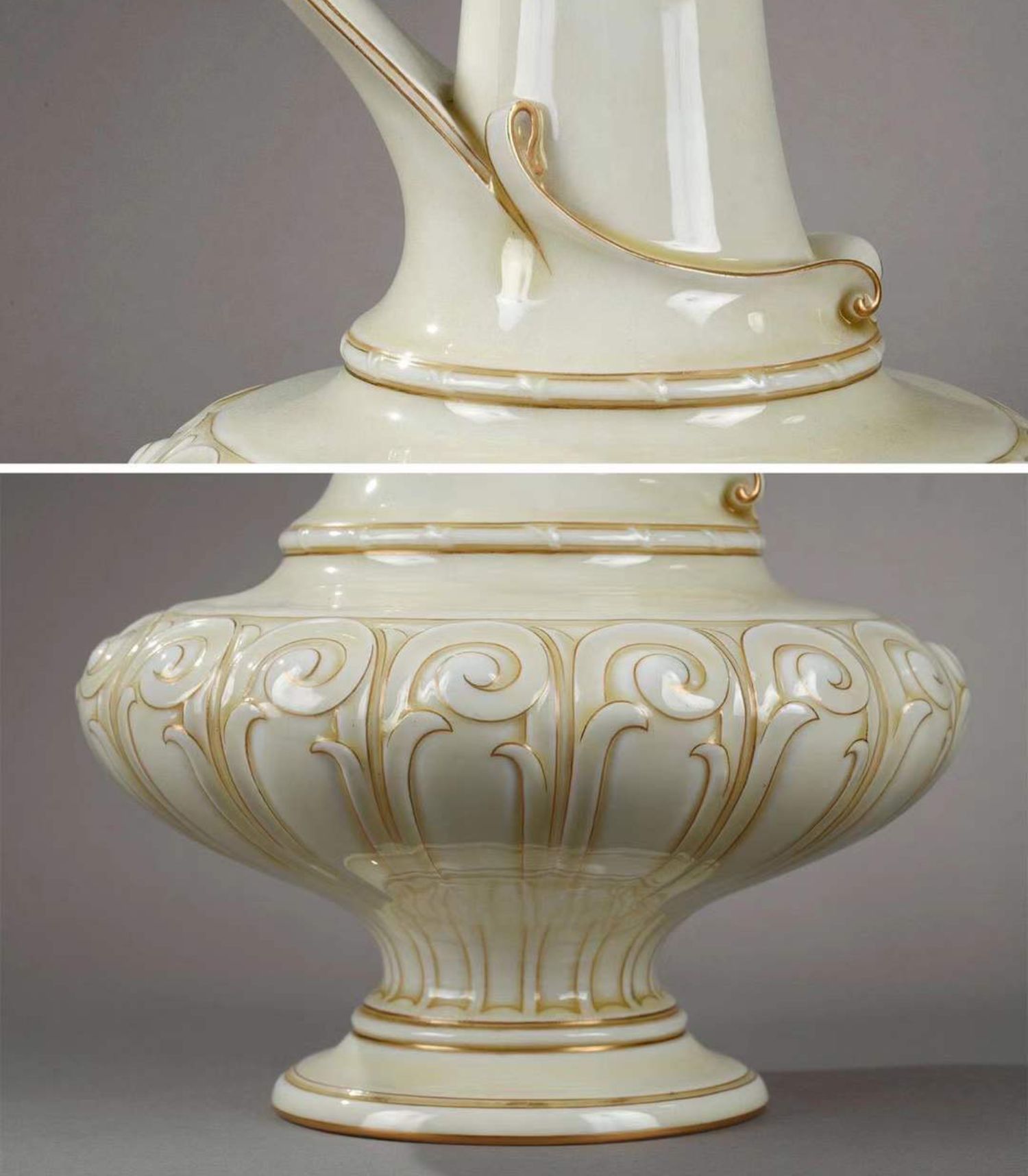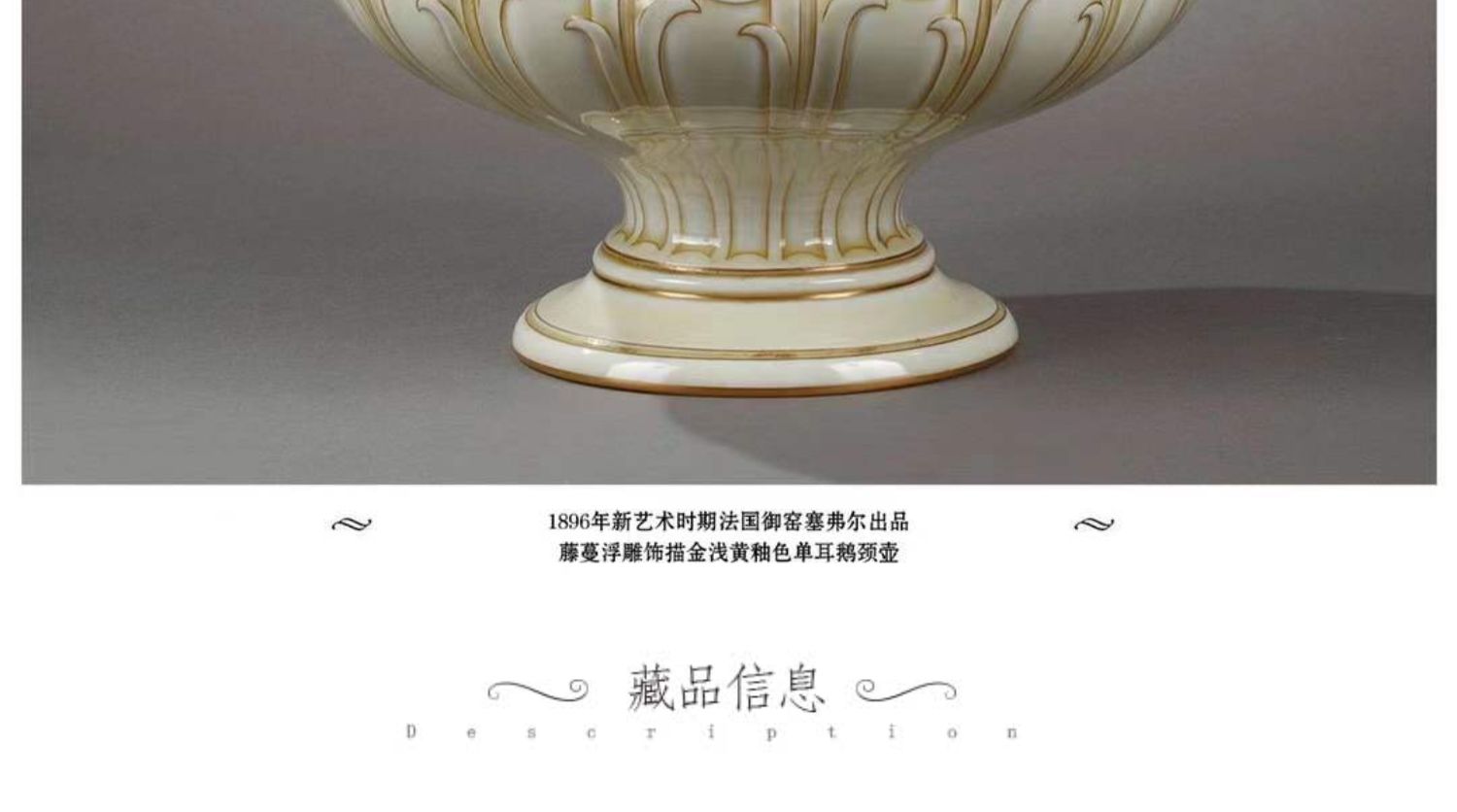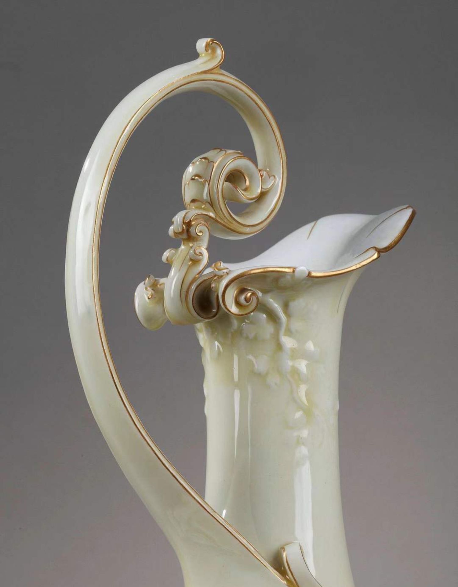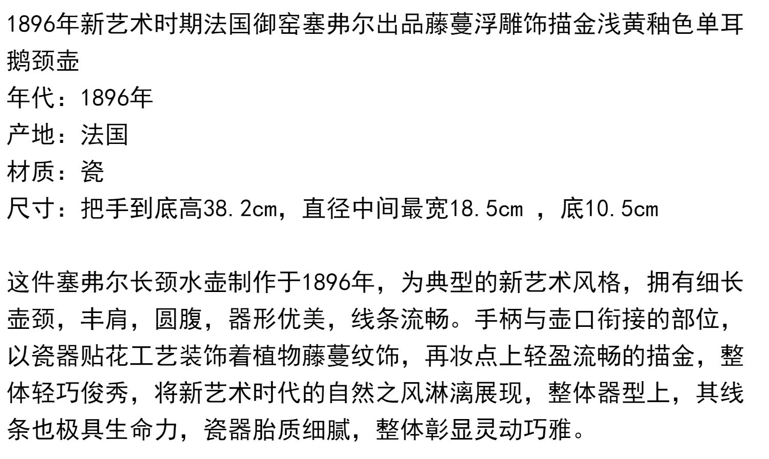 独角鹿西洋古董赛弗尔瓷器藤蔓浮雕饰描金浅黄釉色单耳鹅颈壶