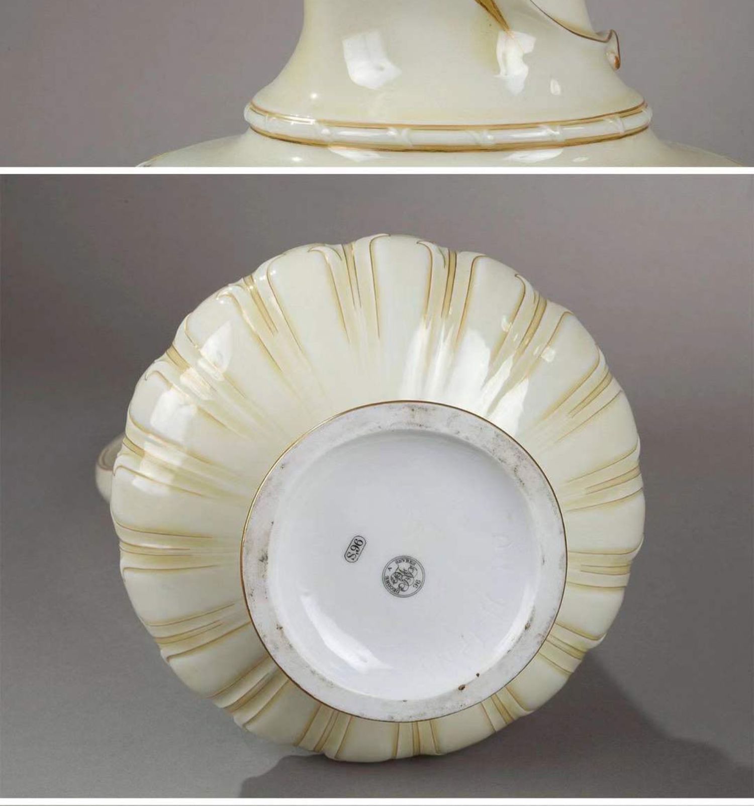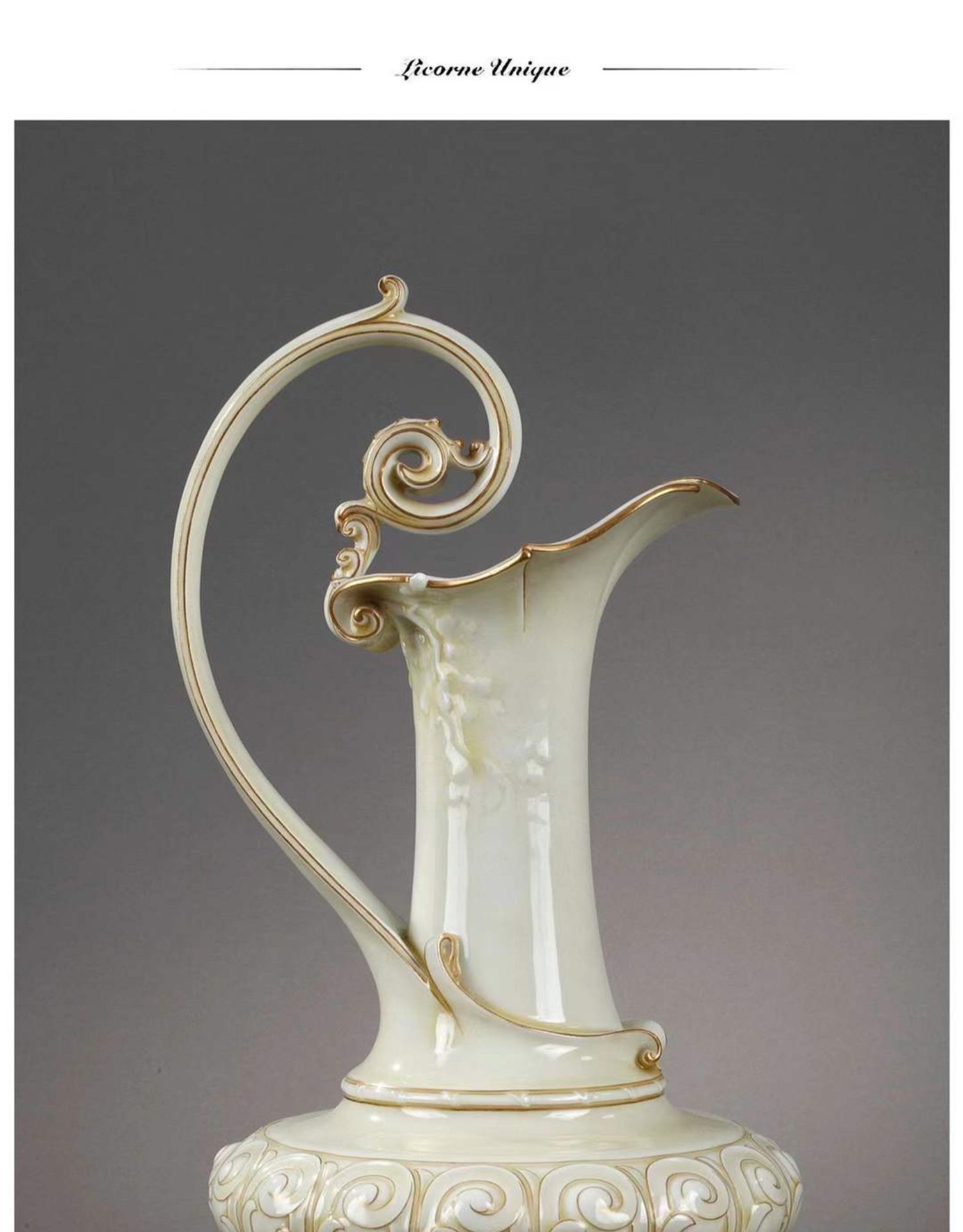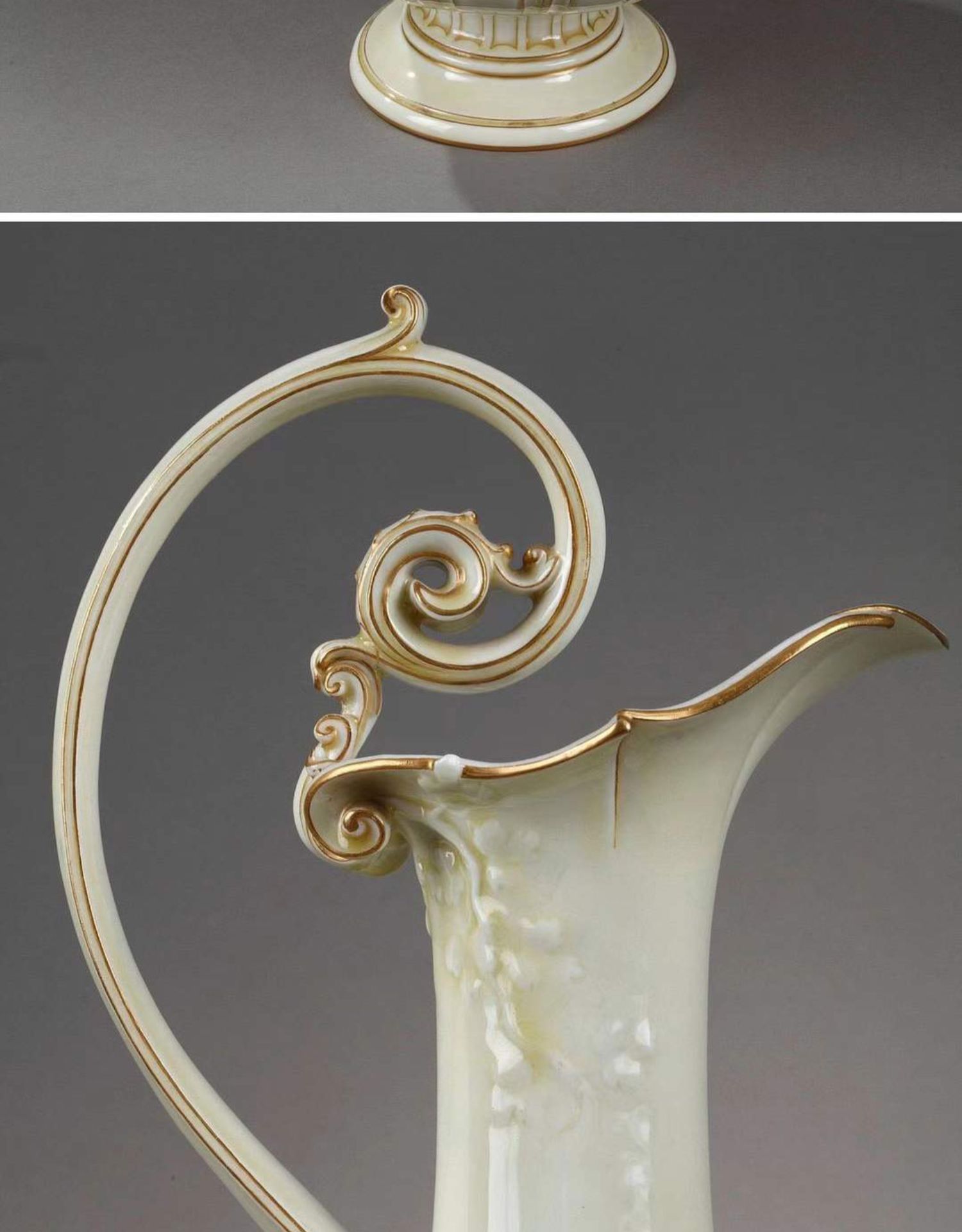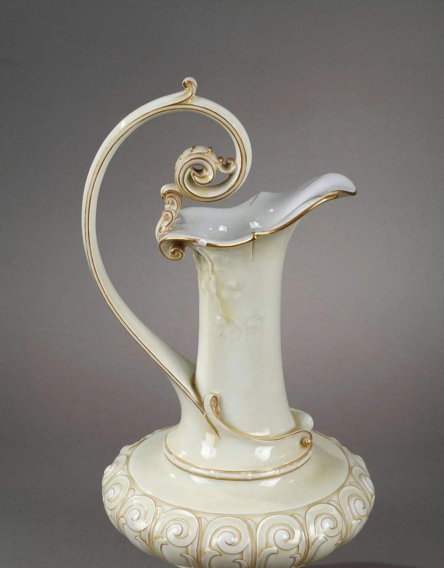 独角鹿西洋古董赛弗尔瓷器藤蔓浮雕饰描金浅黄釉色单耳鹅颈壶