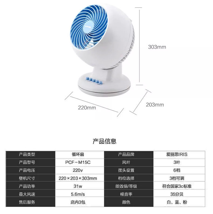 爱丽思(IRIS)(508789)电风扇 PCF-M15C 粉色 空气循环 机械控制 3档风力 左右自动摆头 自然风