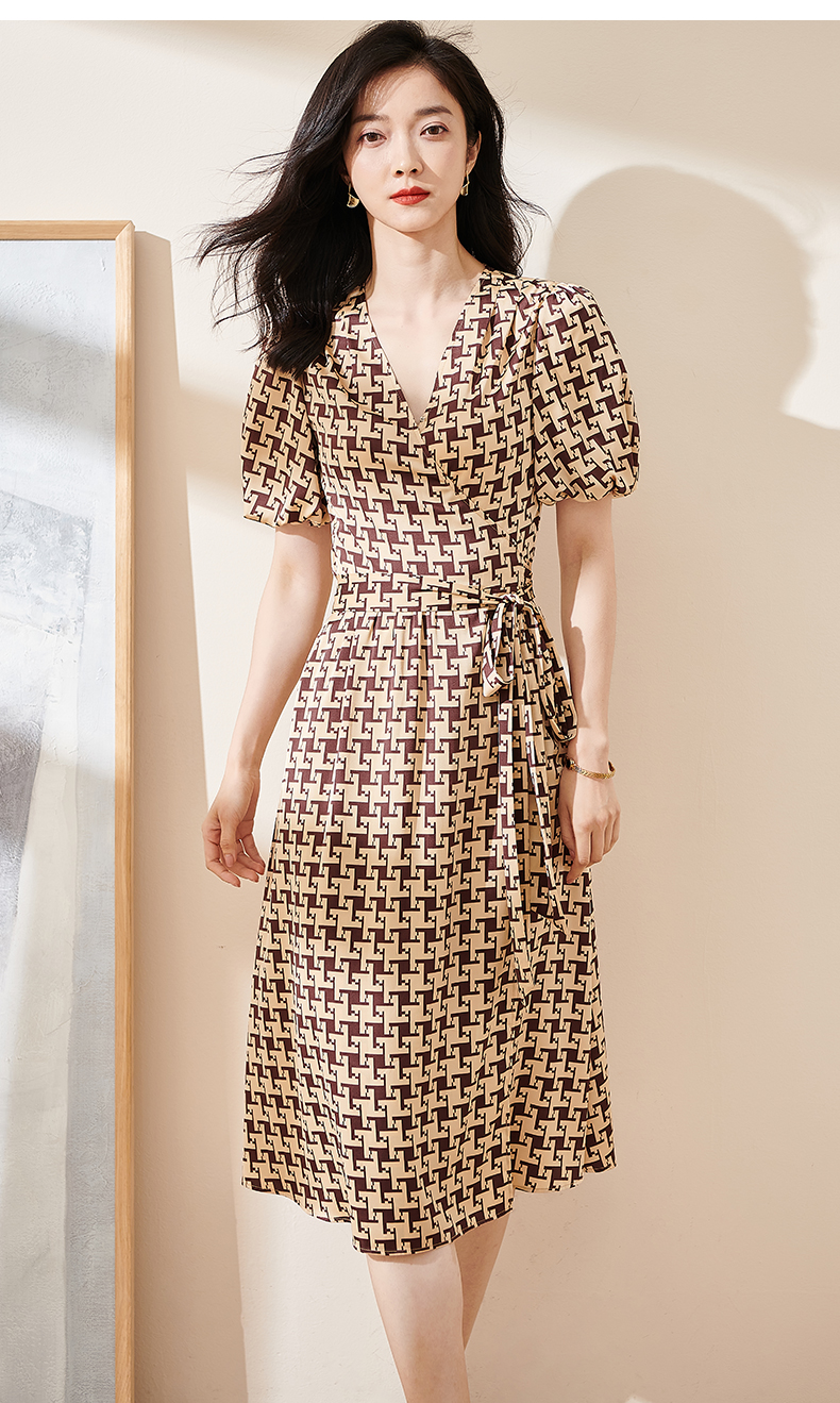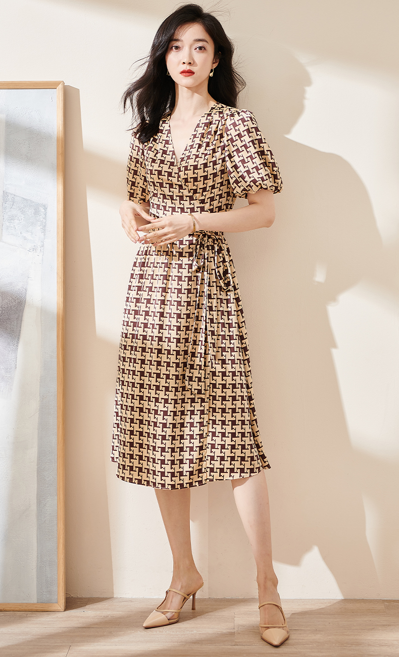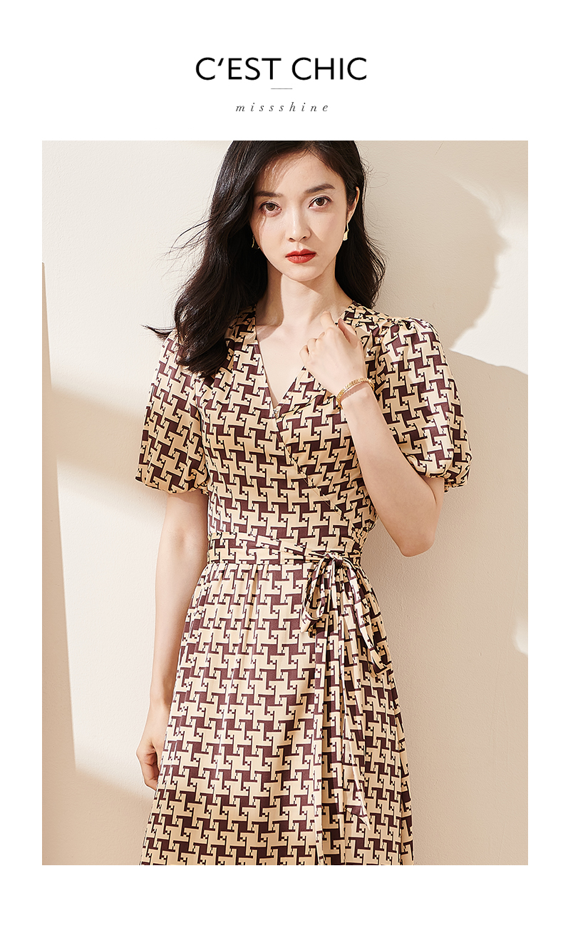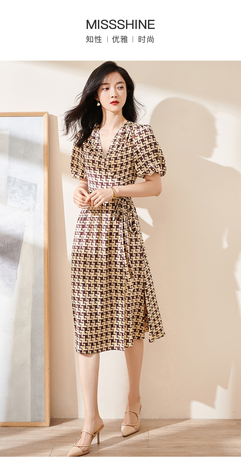 剩S/M/L/XL 米思阳2025夏季新款时尚气质印花连衣裙薄款灯笼袖V领中长裙1217
