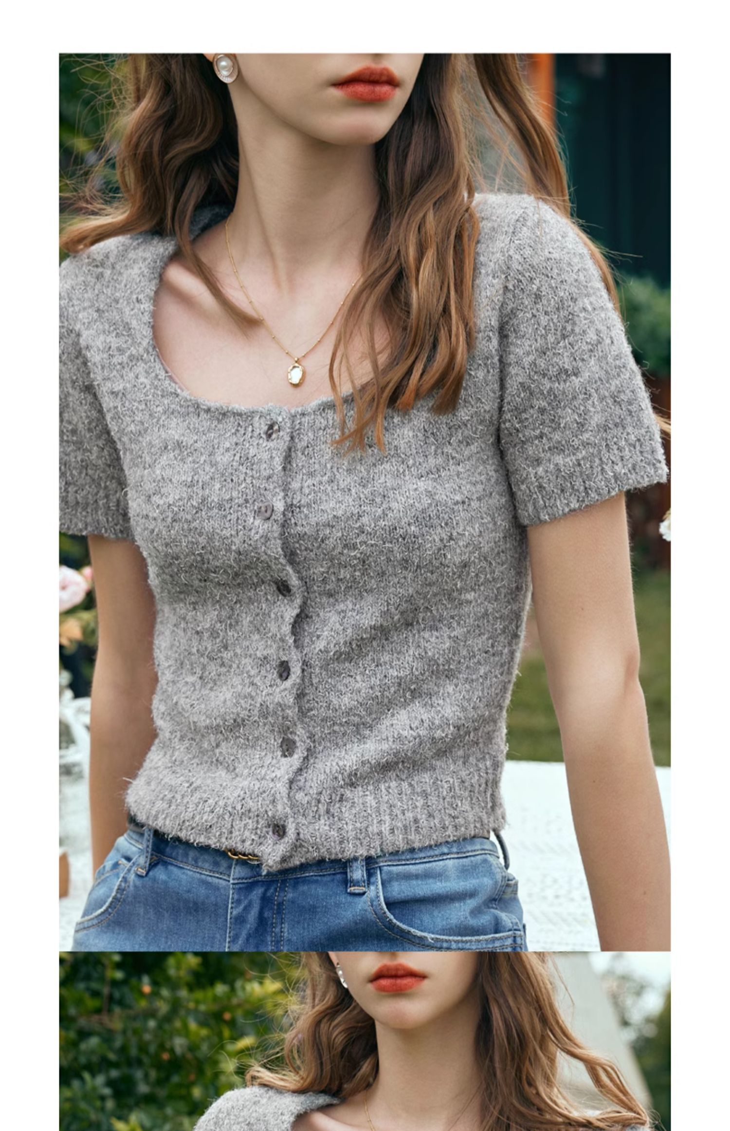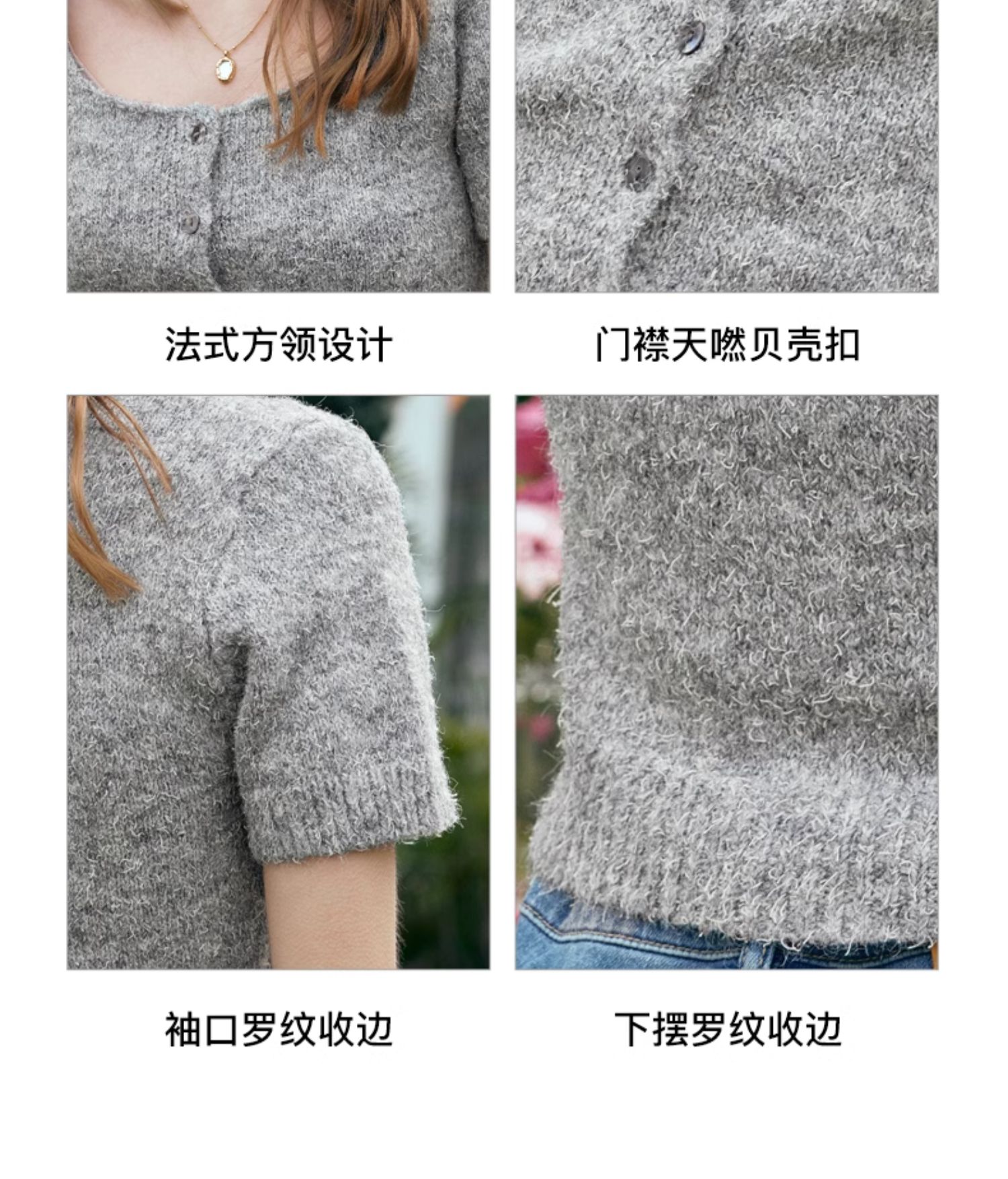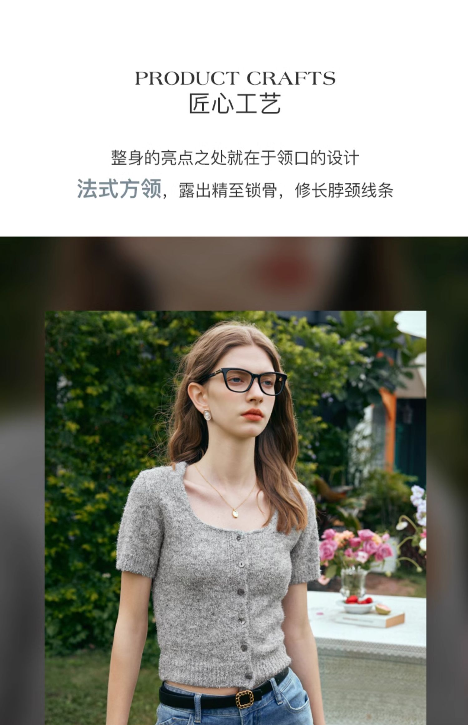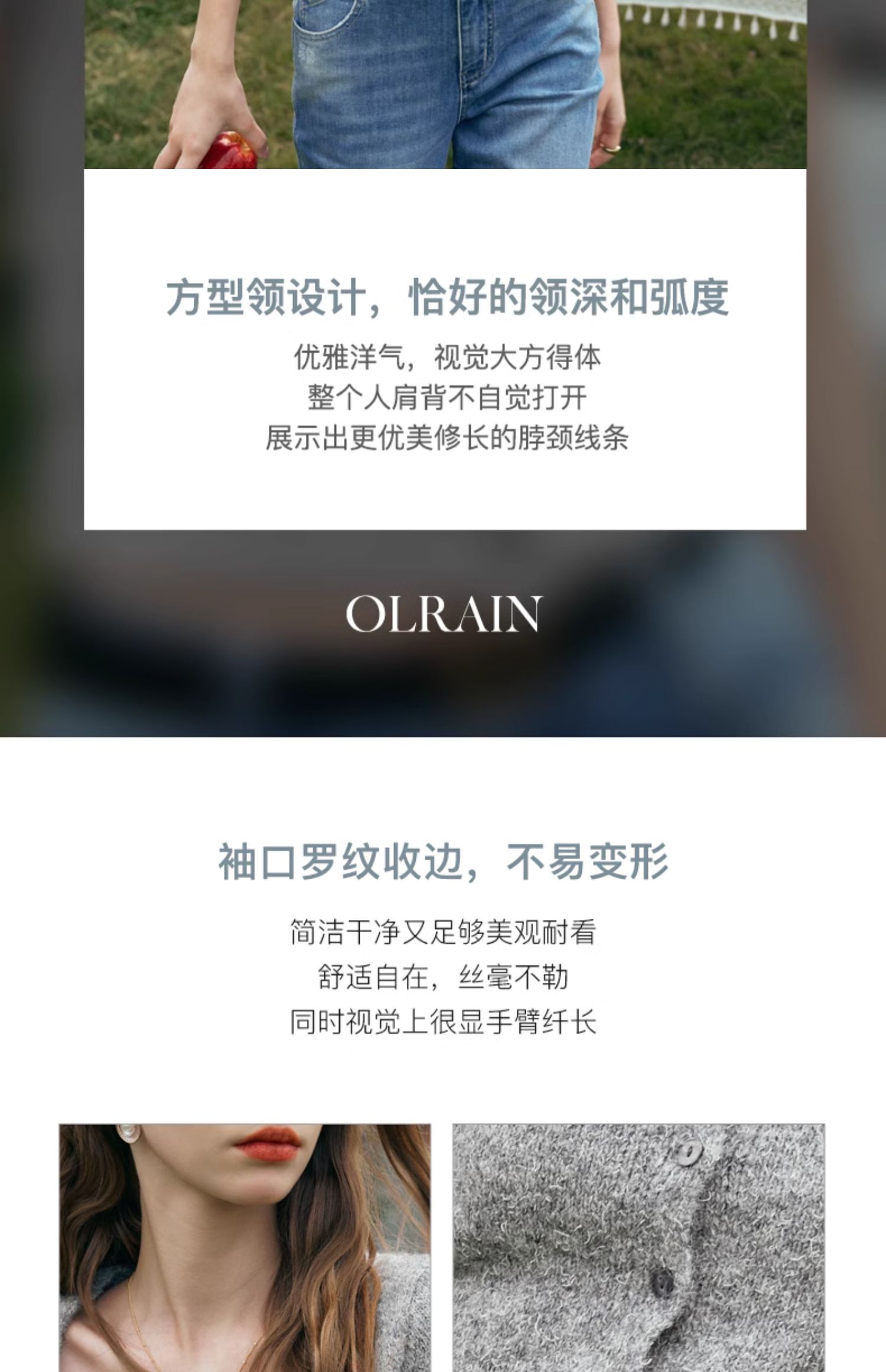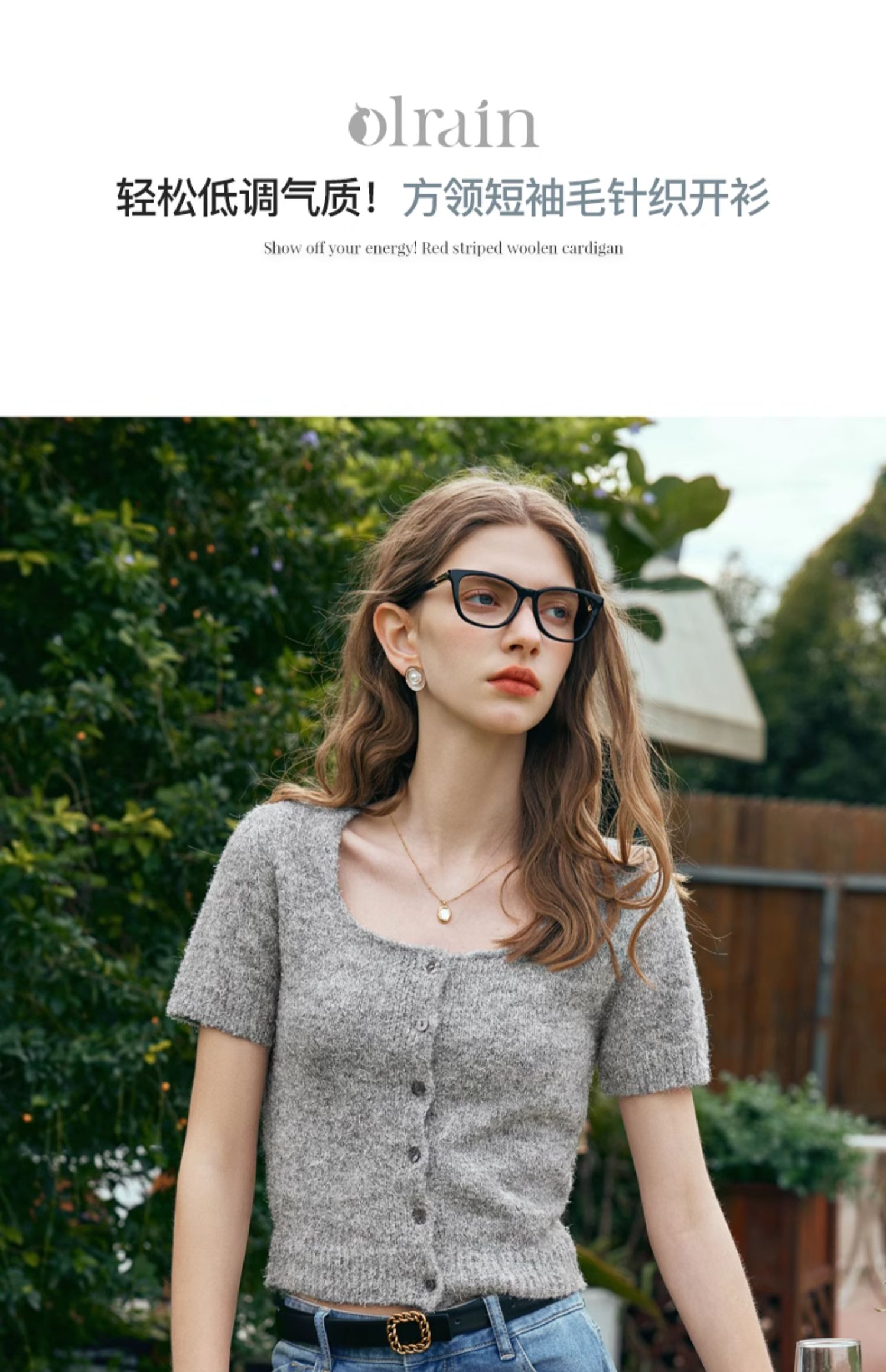 OLrain欧芮儿灰色针织衫女早春2024年新款方领气质高级感短袖上衣