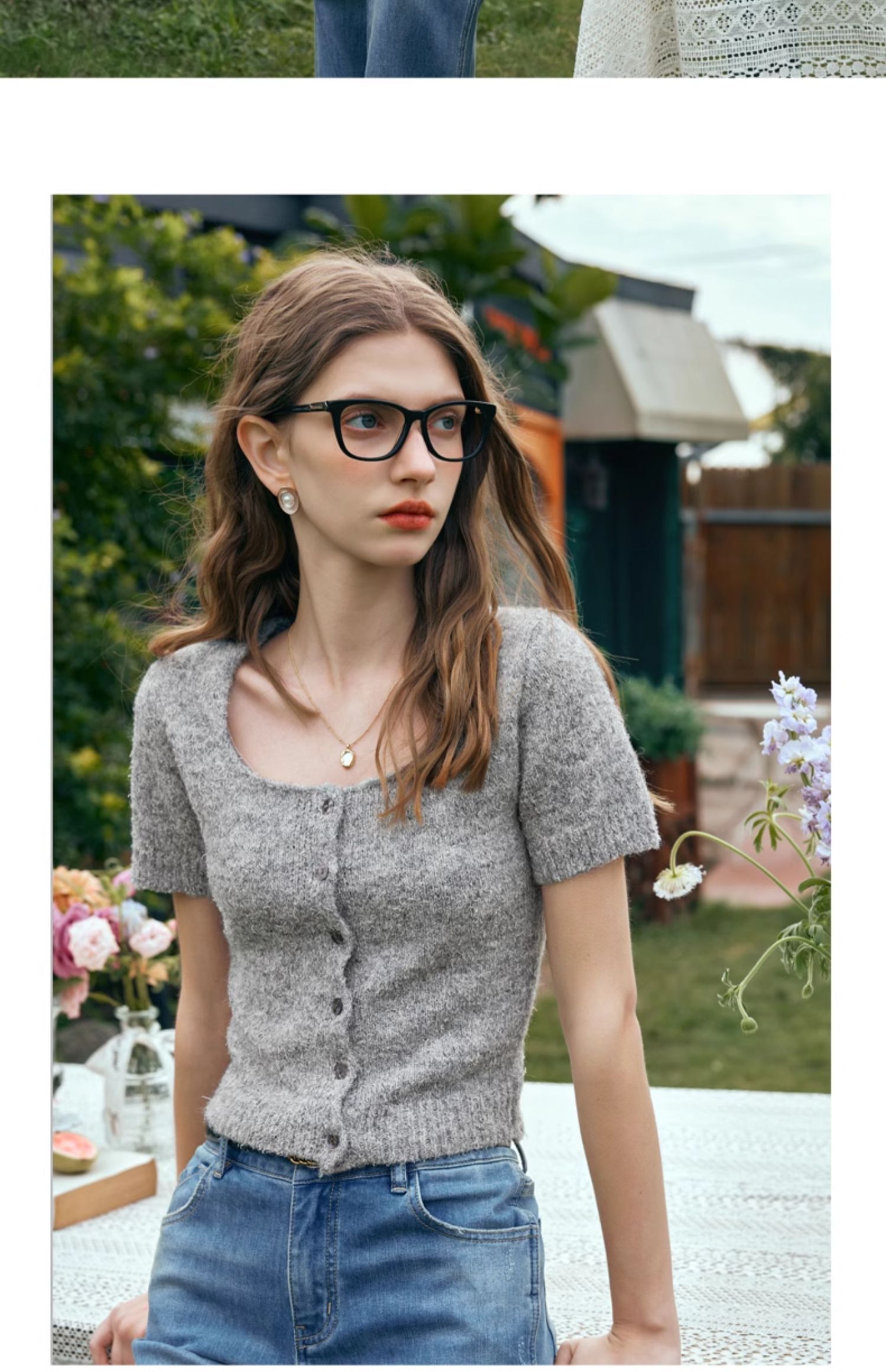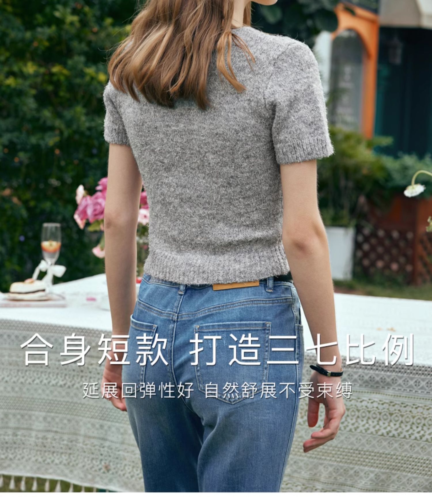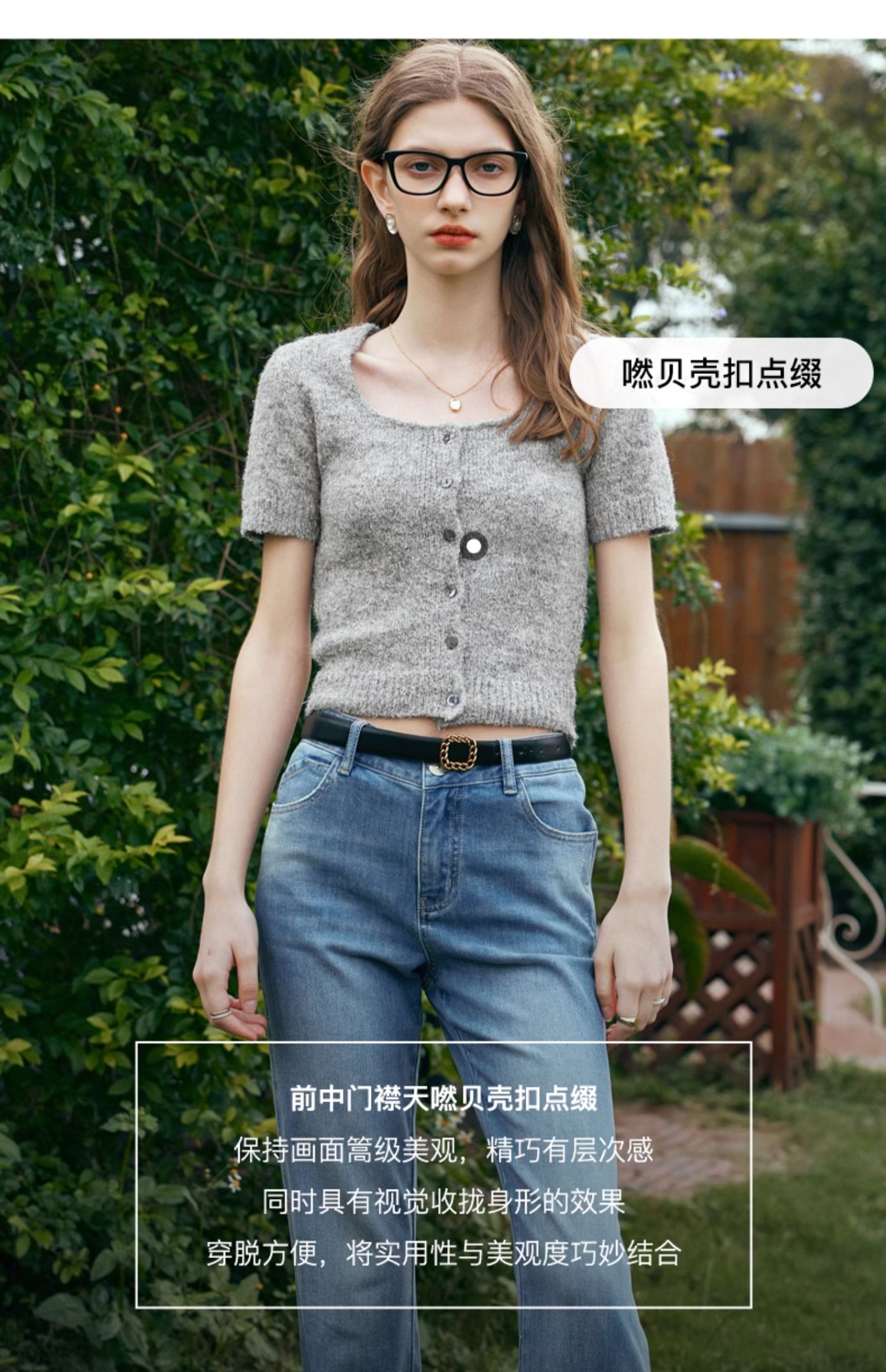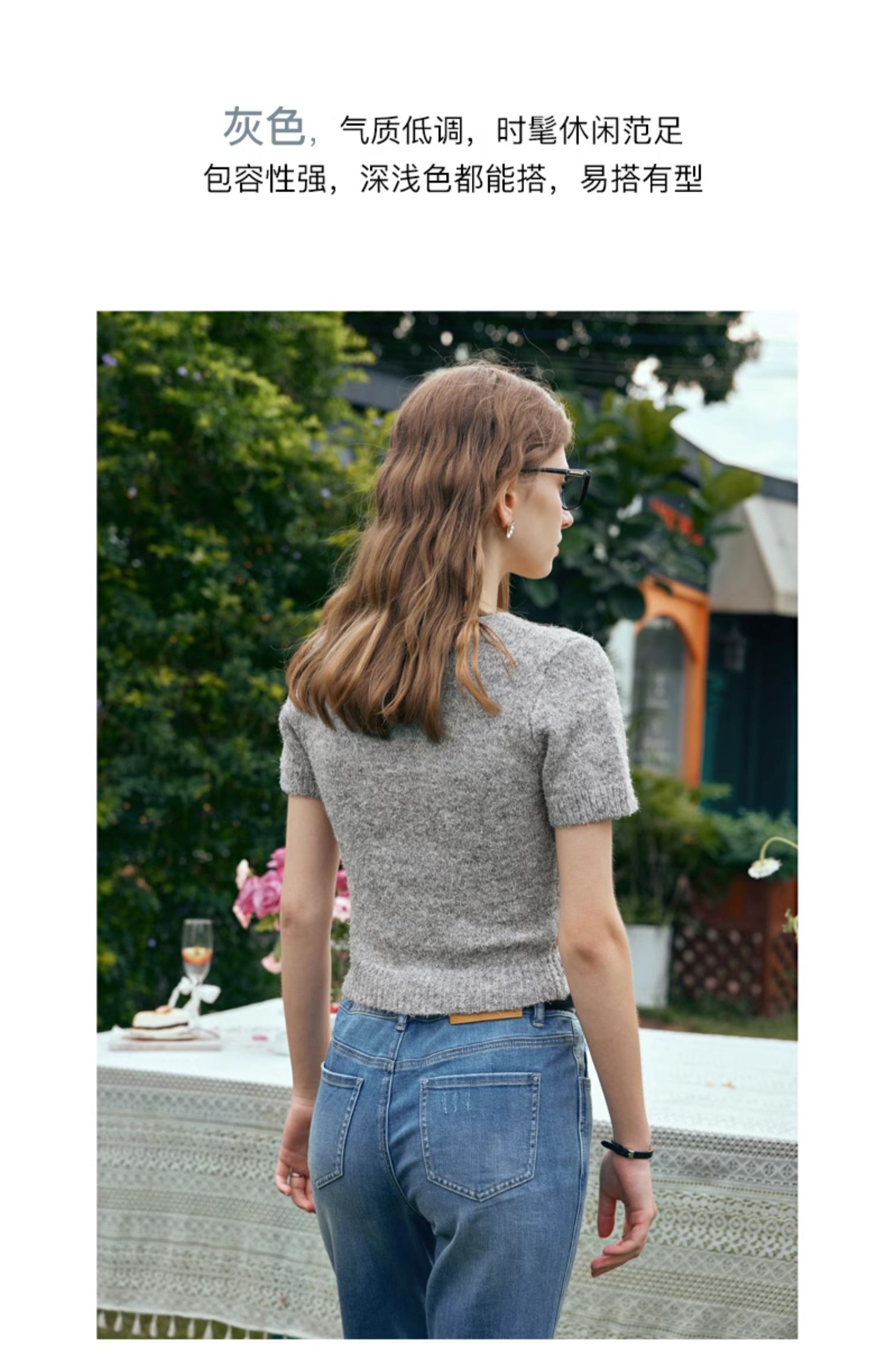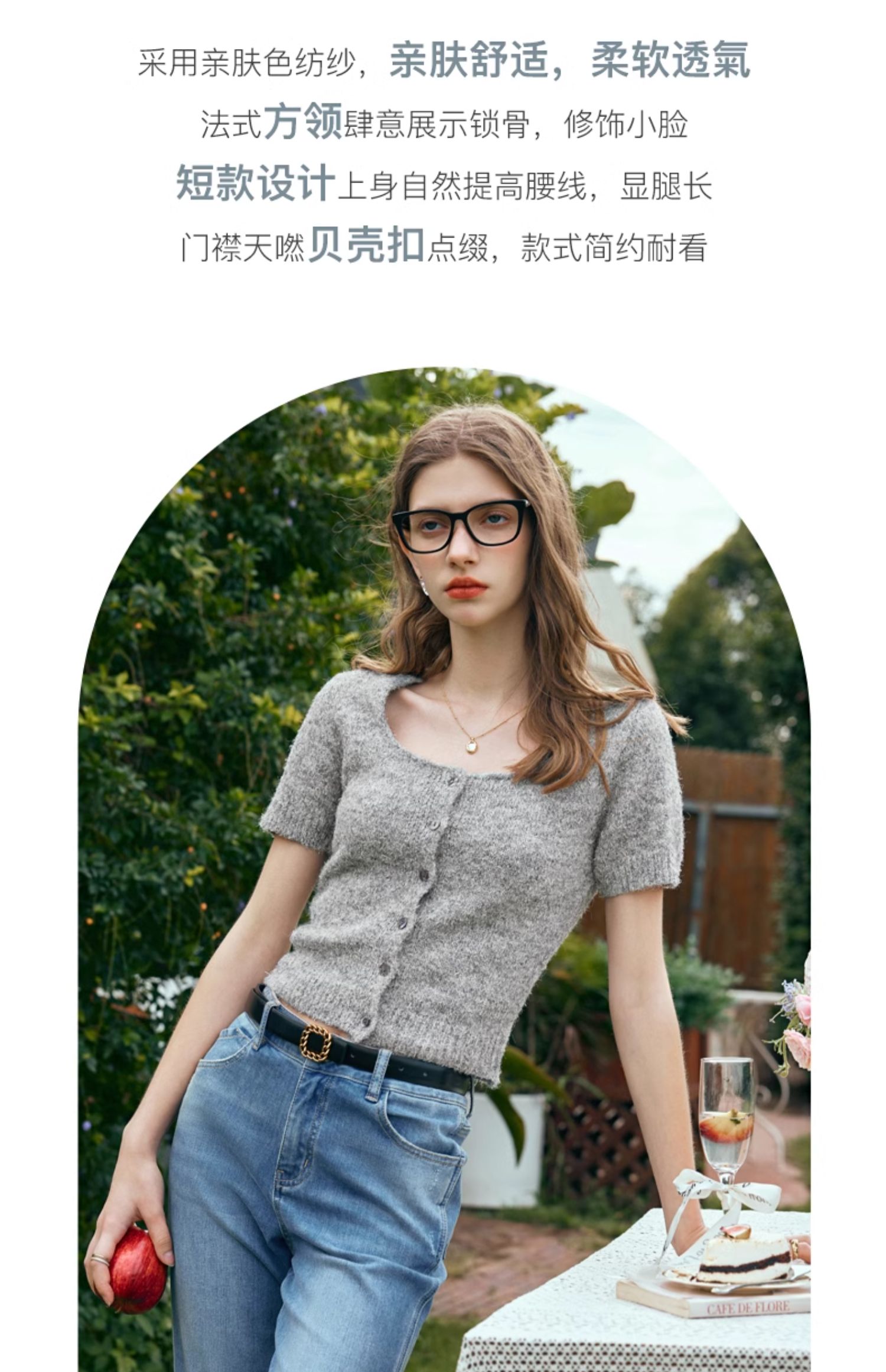 OLrain欧芮儿灰色针织衫女早春2024年新款方领气质高级感短袖上衣