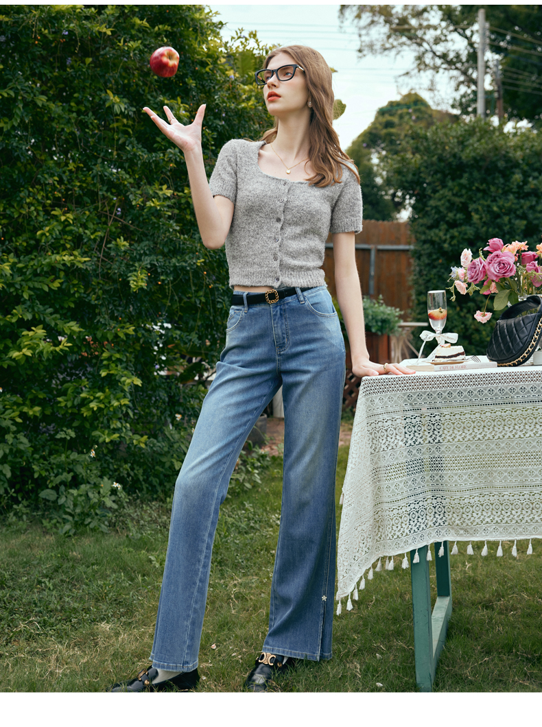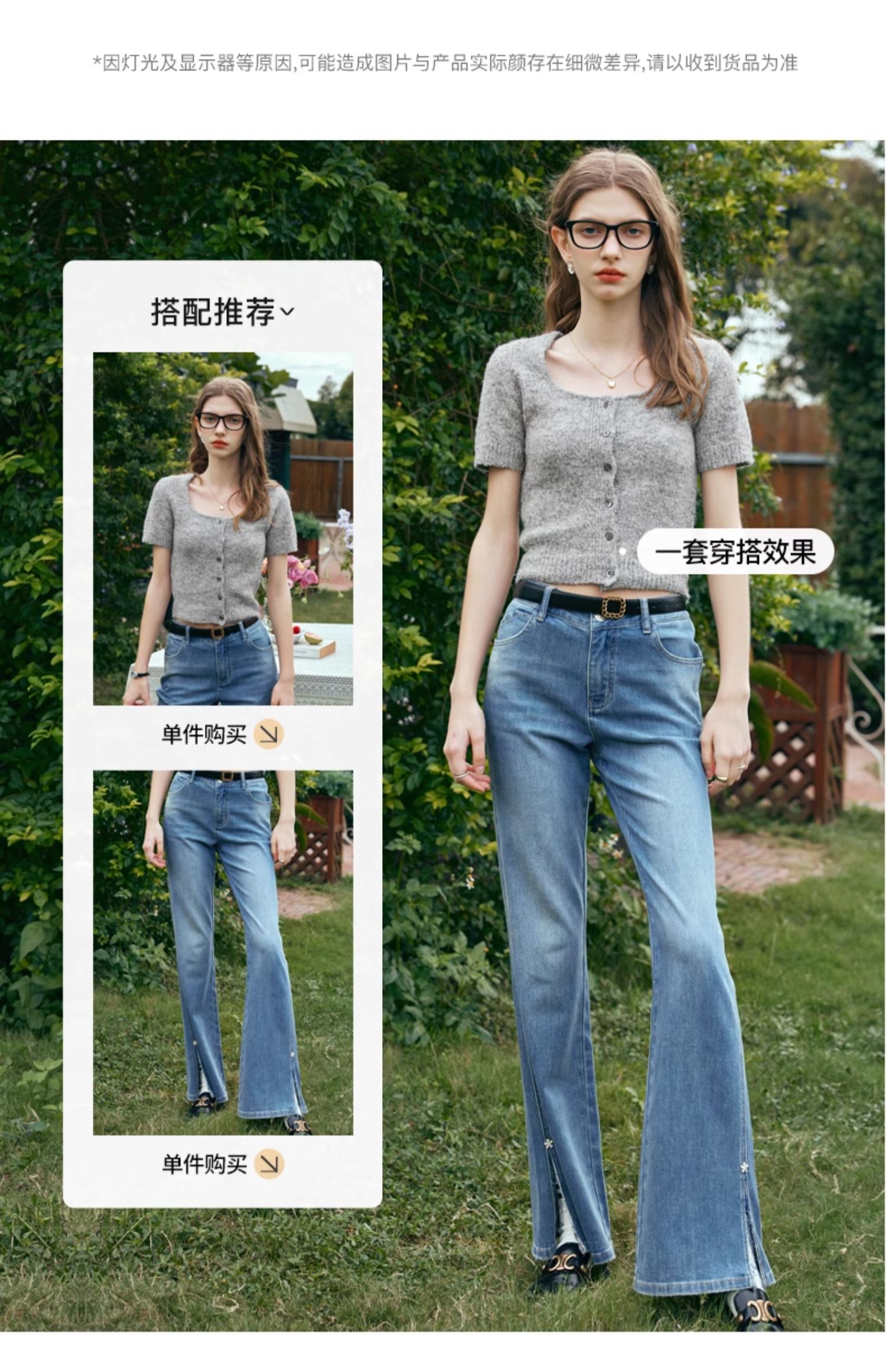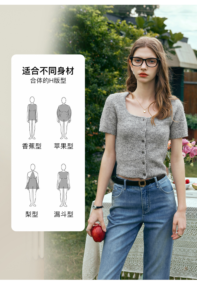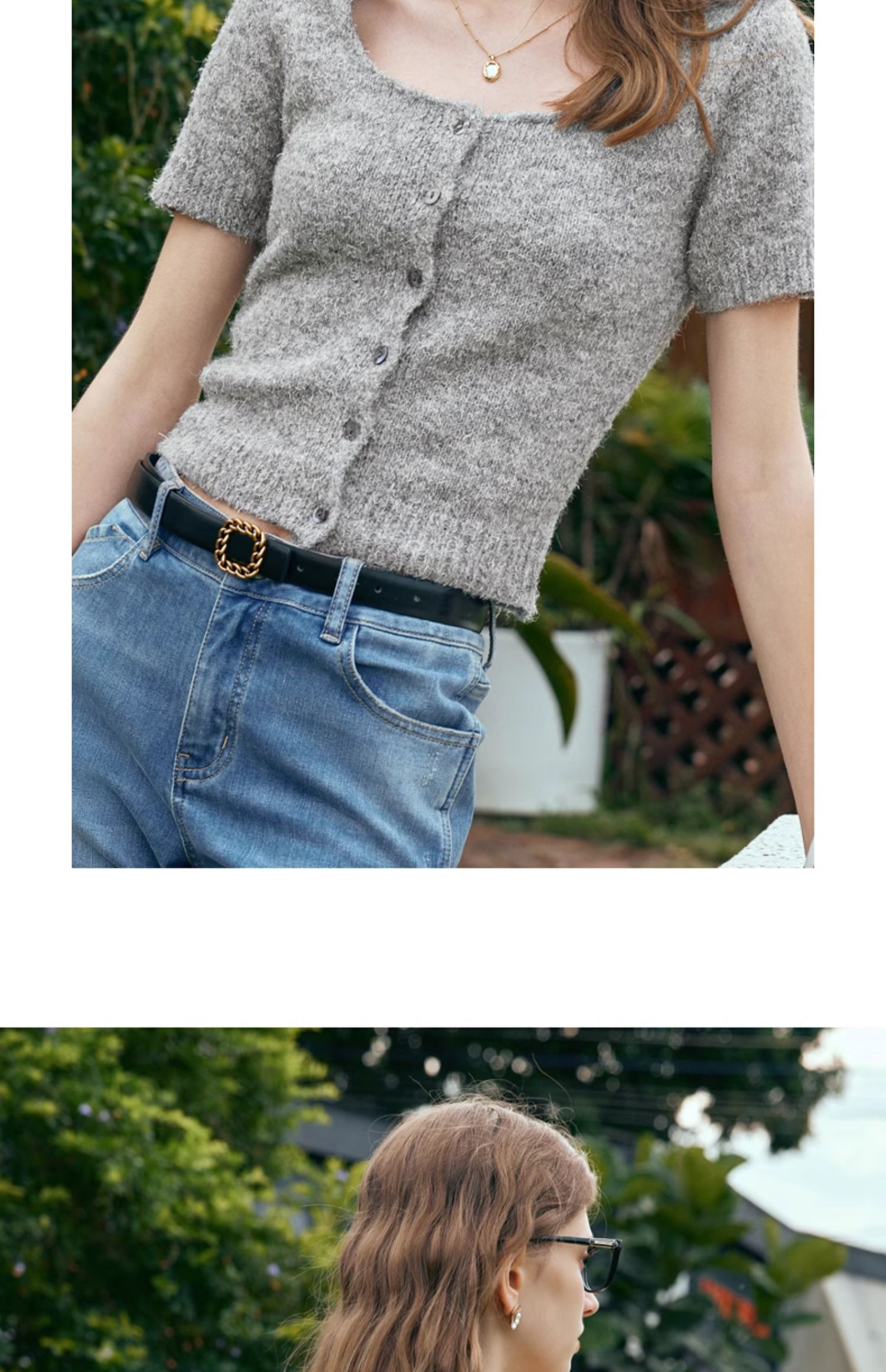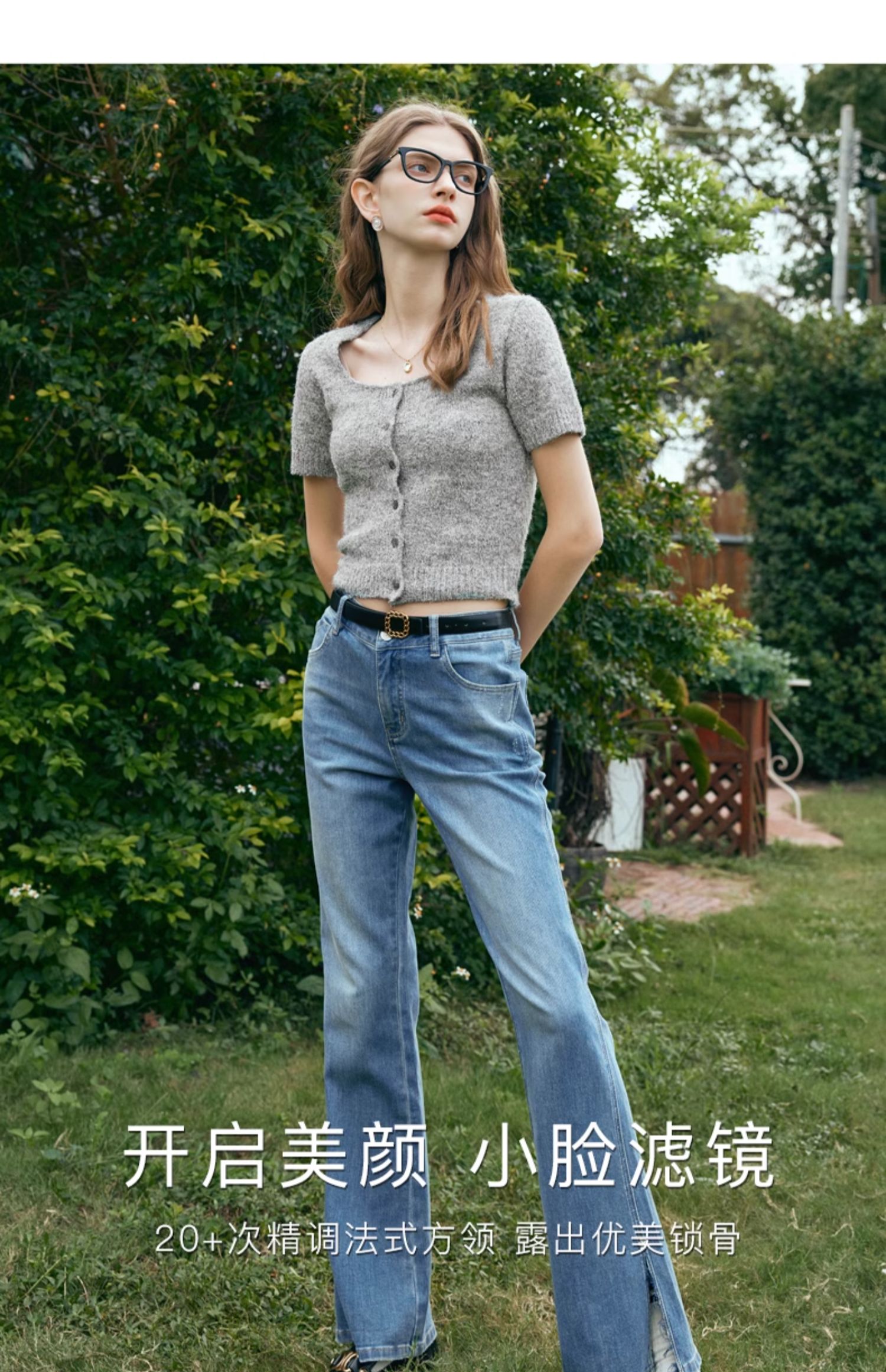 OLrain欧芮儿灰色针织衫女早春2024年新款方领气质高级感短袖上衣