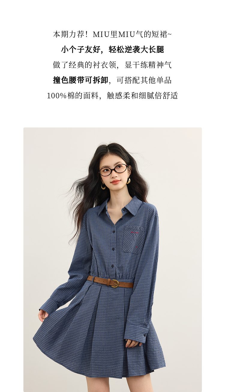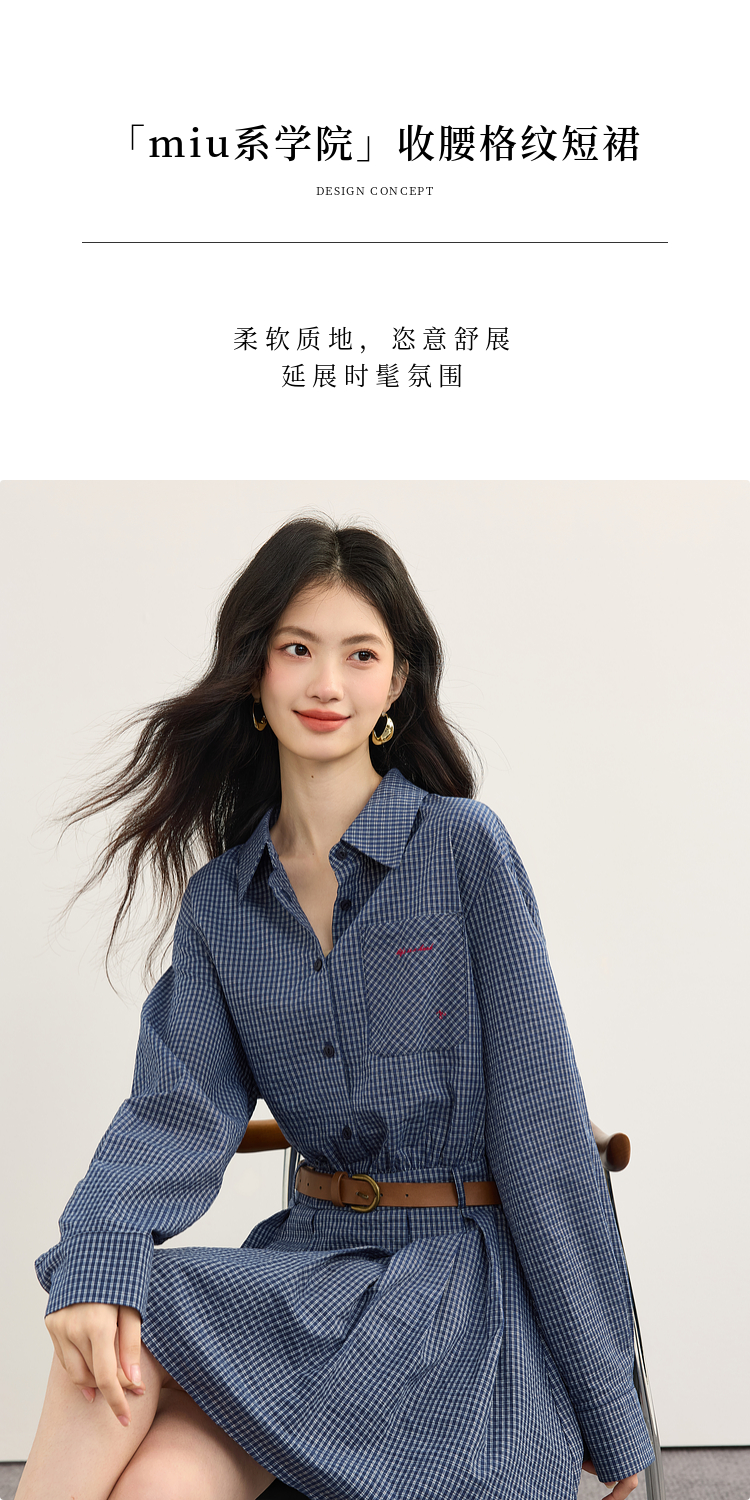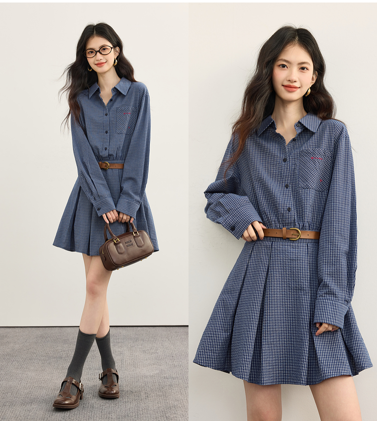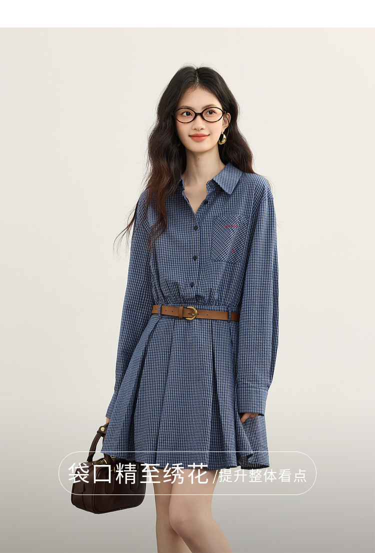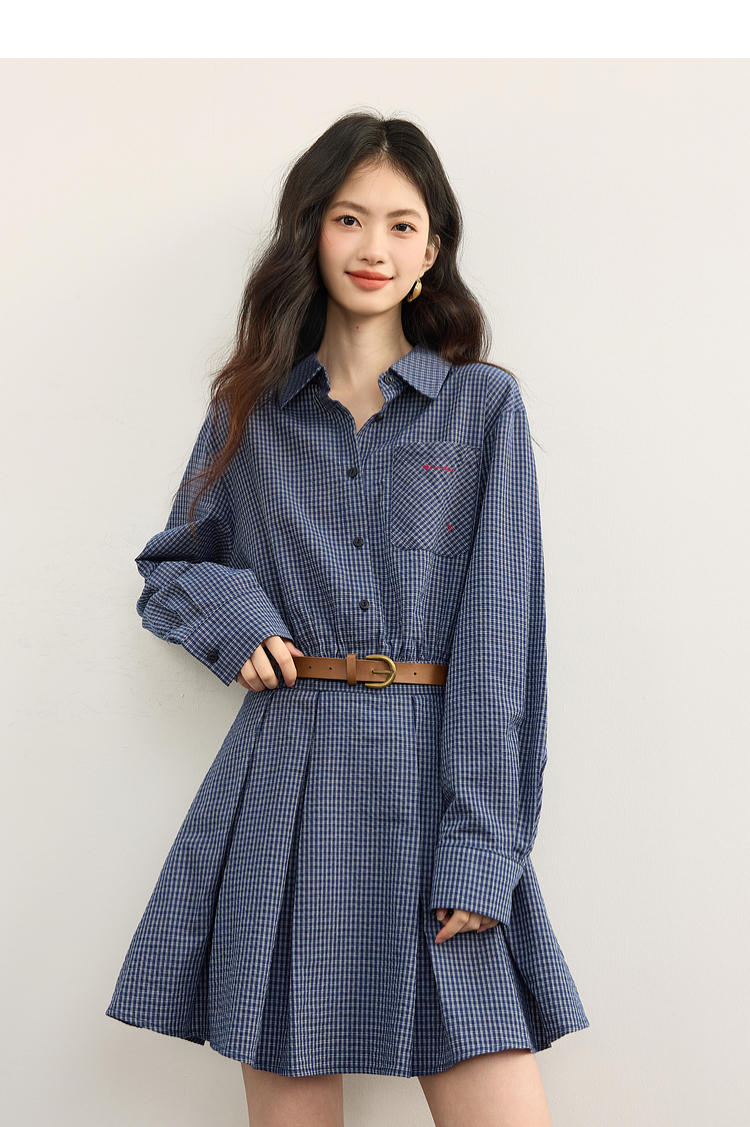 【08/19新品】熙世界学院风蓝色格子衬衫连衣裙女2025秋季新款长袖收腰百褶短裙