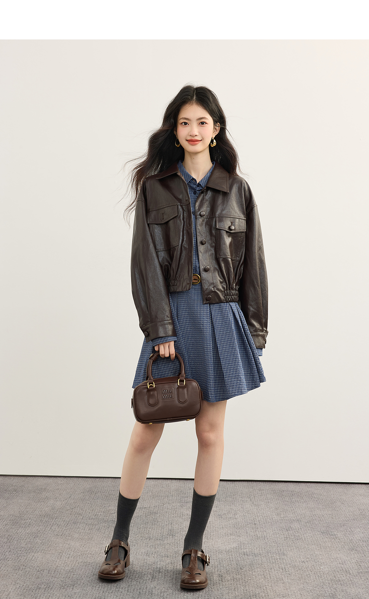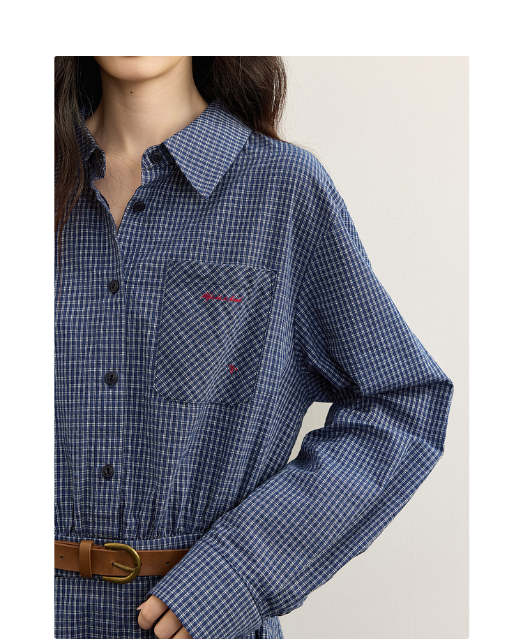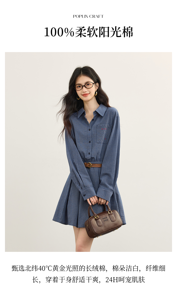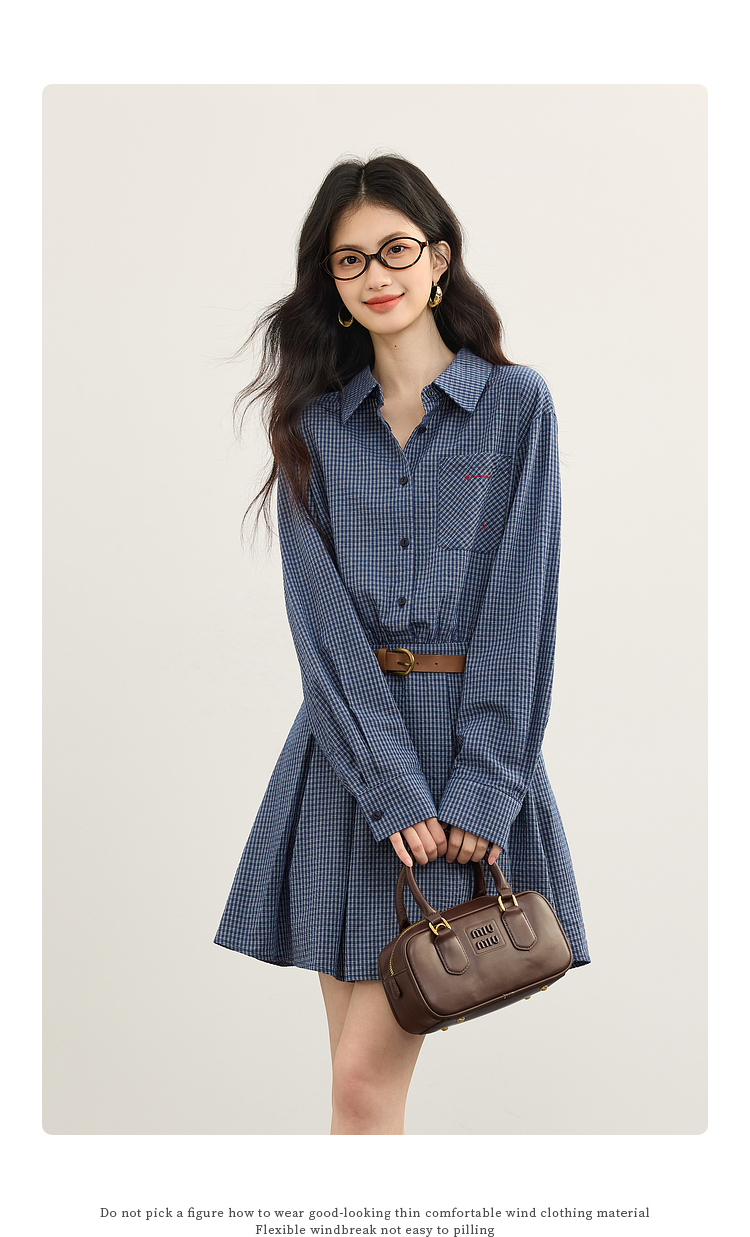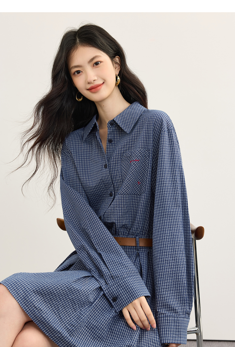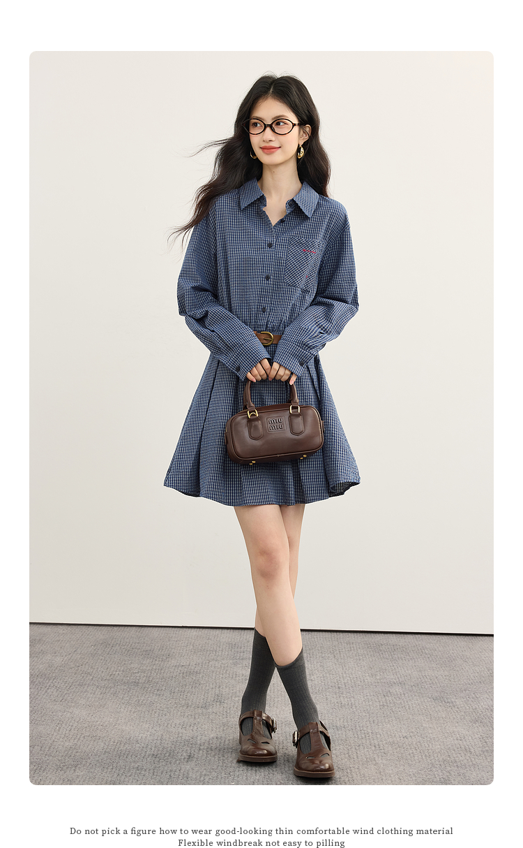 【08/19新品】熙世界学院风蓝色格子衬衫连衣裙女2025秋季新款长袖收腰百褶短裙