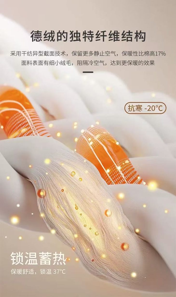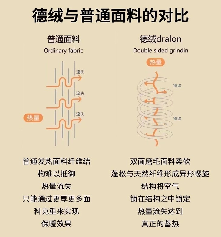对于保暖,德国人是专业的 在零下十几度出门滑雪的时候 他们厚厚的滑雪服里穿着的就是德绒保暖衣 德绒,也被称为“数秒热” 体积轻、薄,却有着胜似羊绒的保暖效果 是服装界炙手可热的保暖材料
