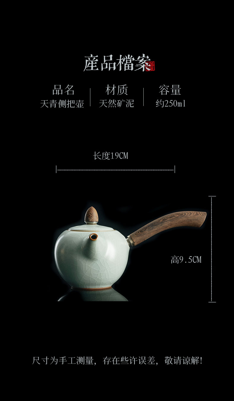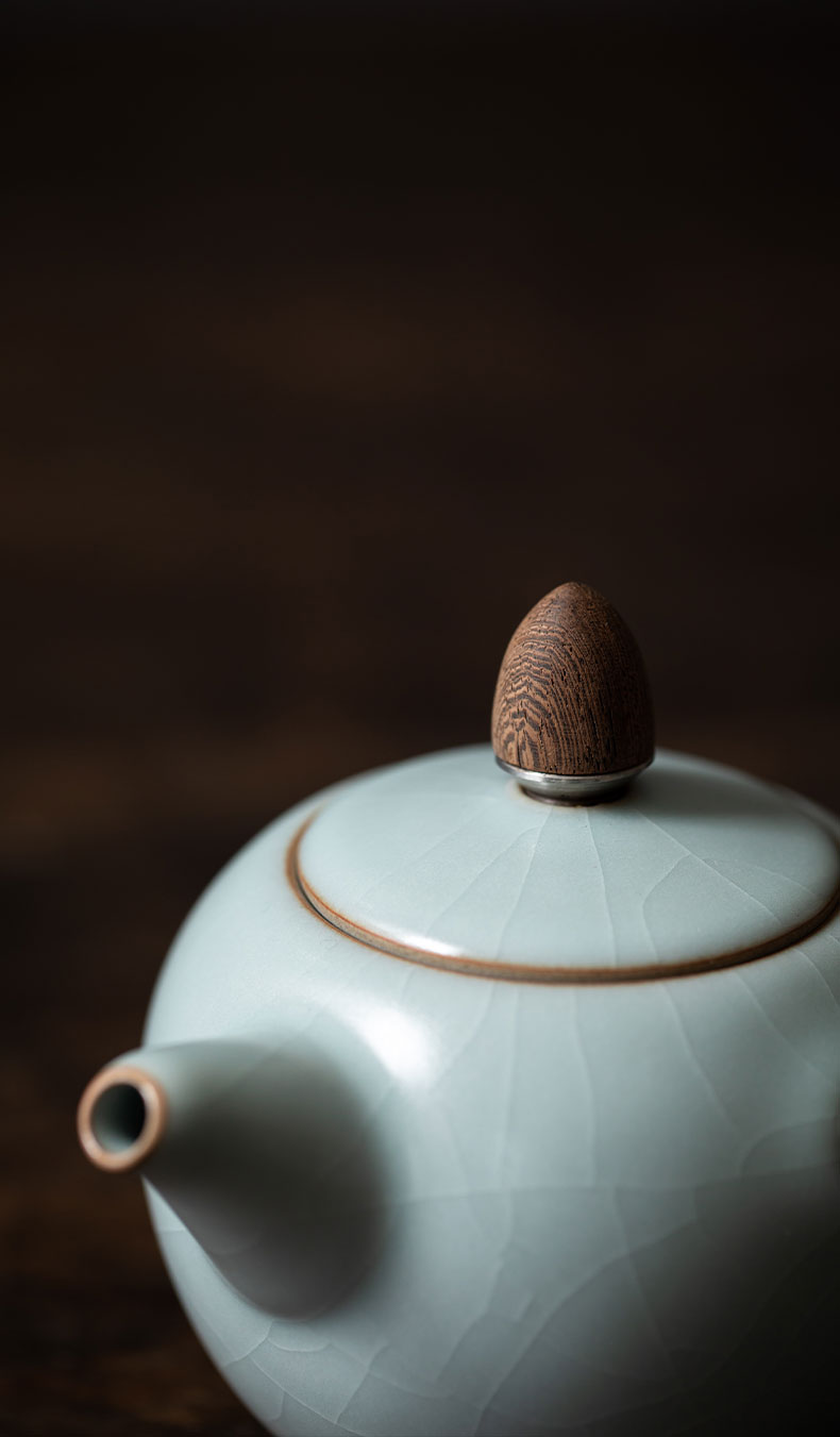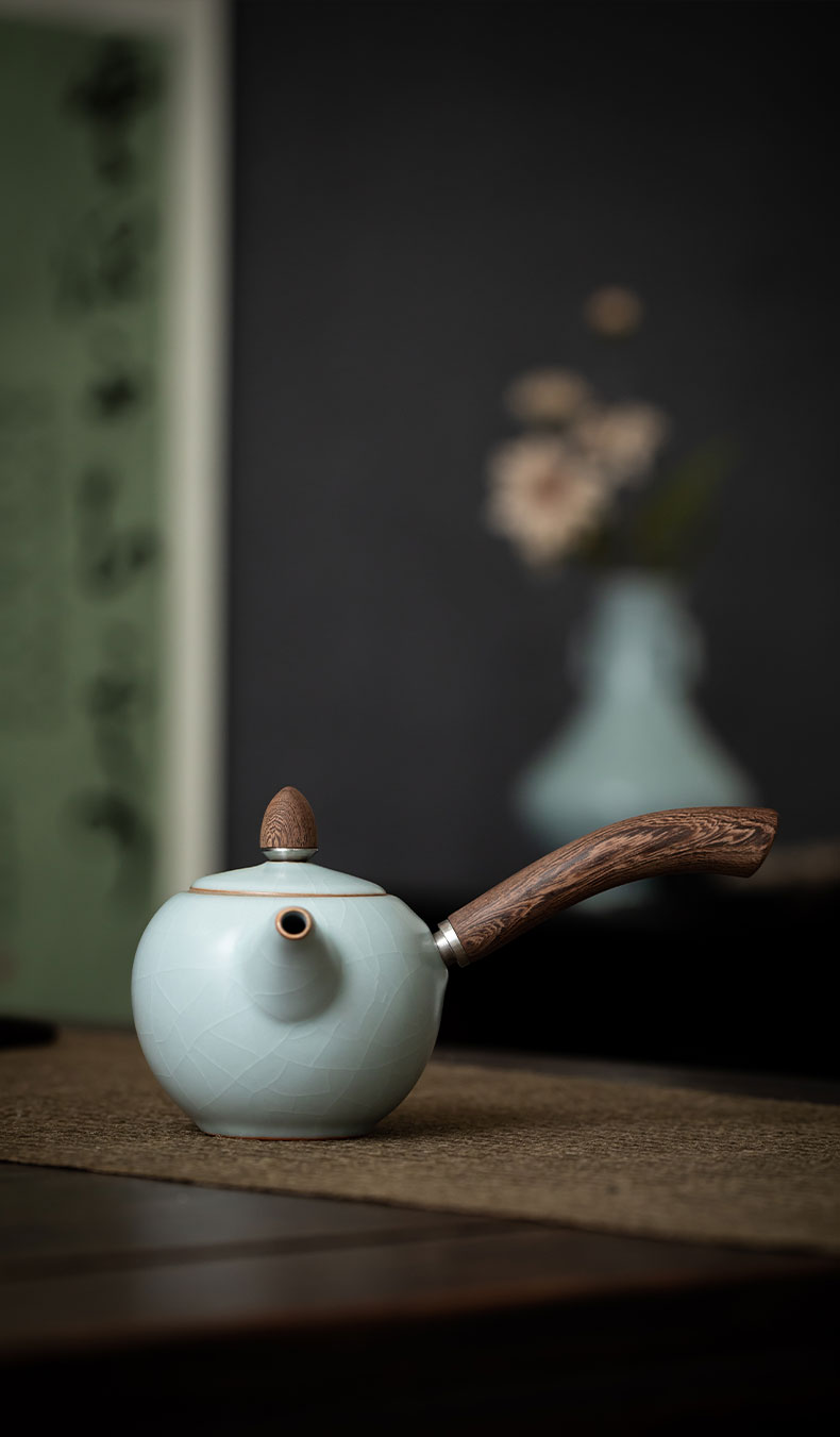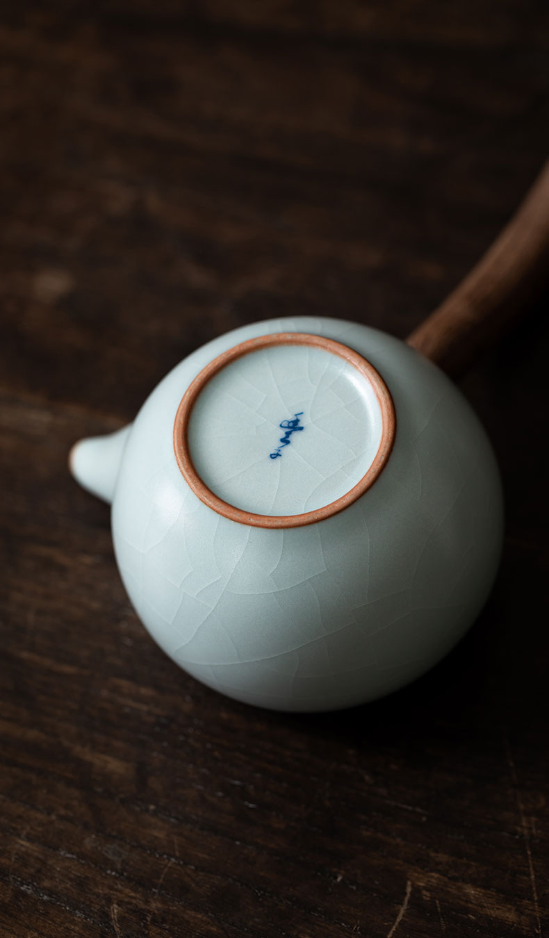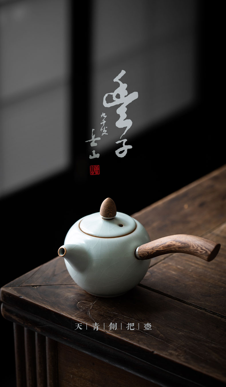 丰子汝窑 【天青侧把壶】泡茶单壶陶瓷大号开片可养木柄茶壶