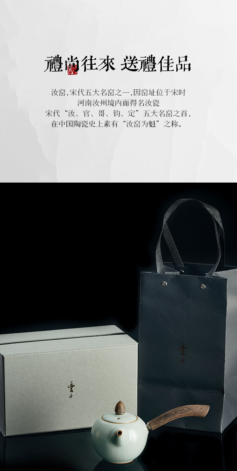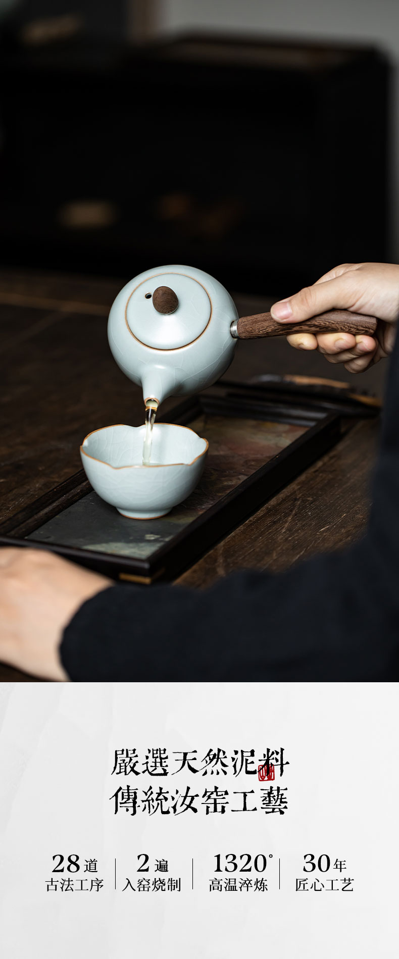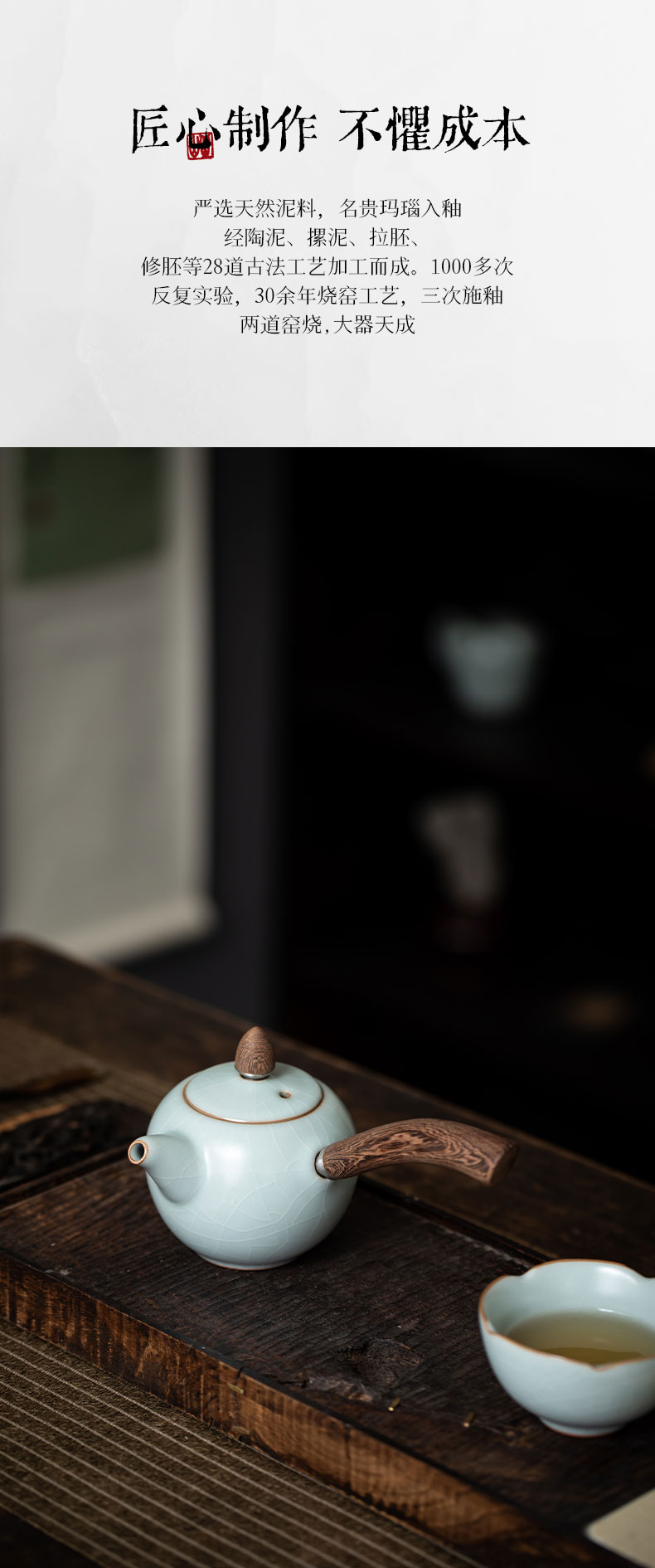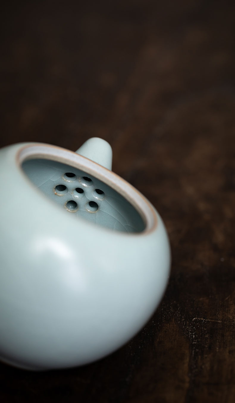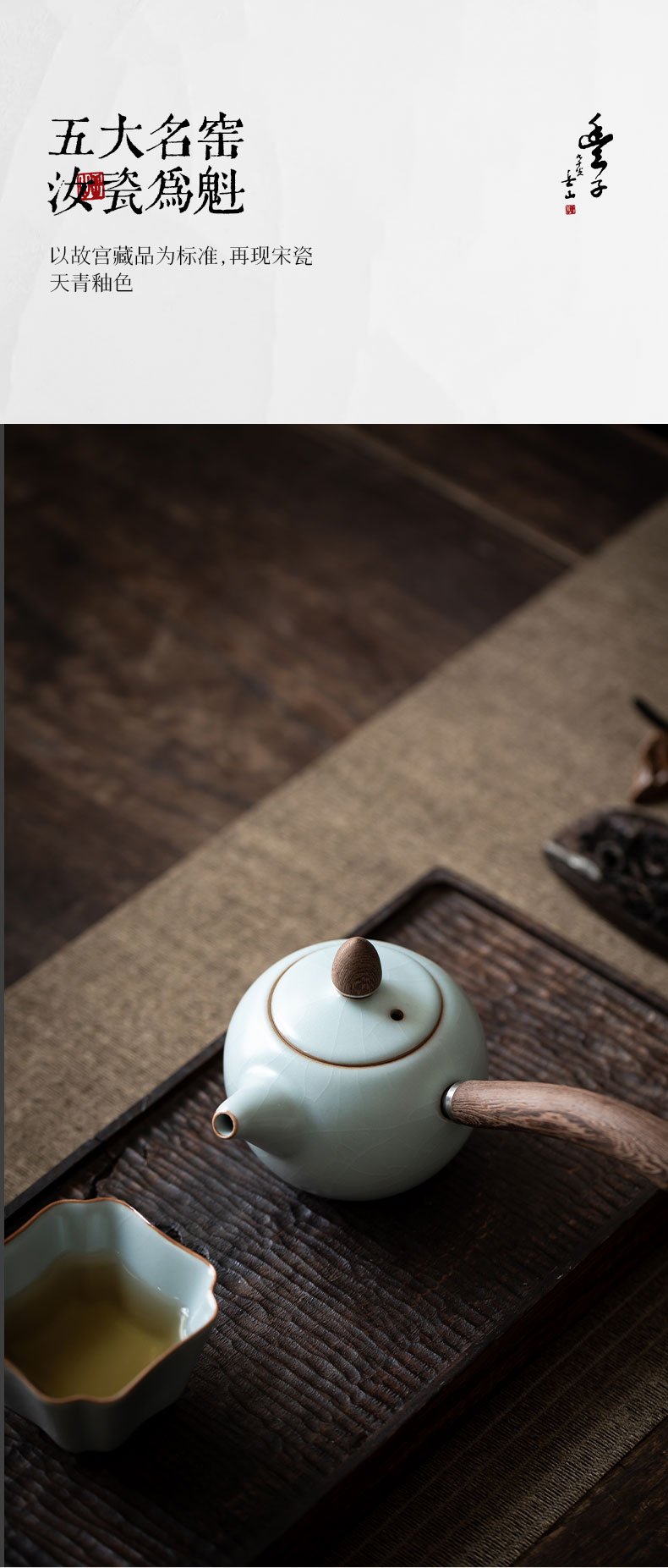 丰子汝窑 【天青侧把壶】泡茶单壶陶瓷大号开片可养木柄茶壶