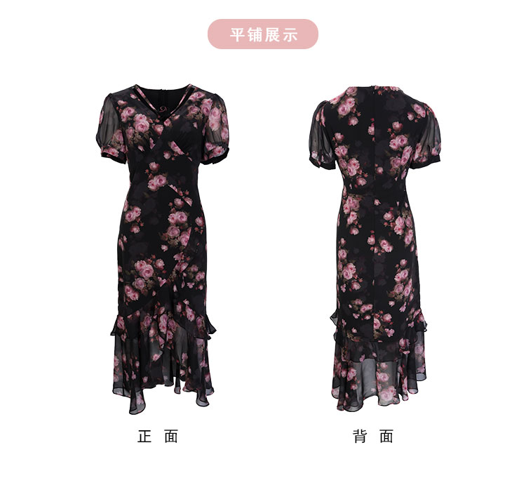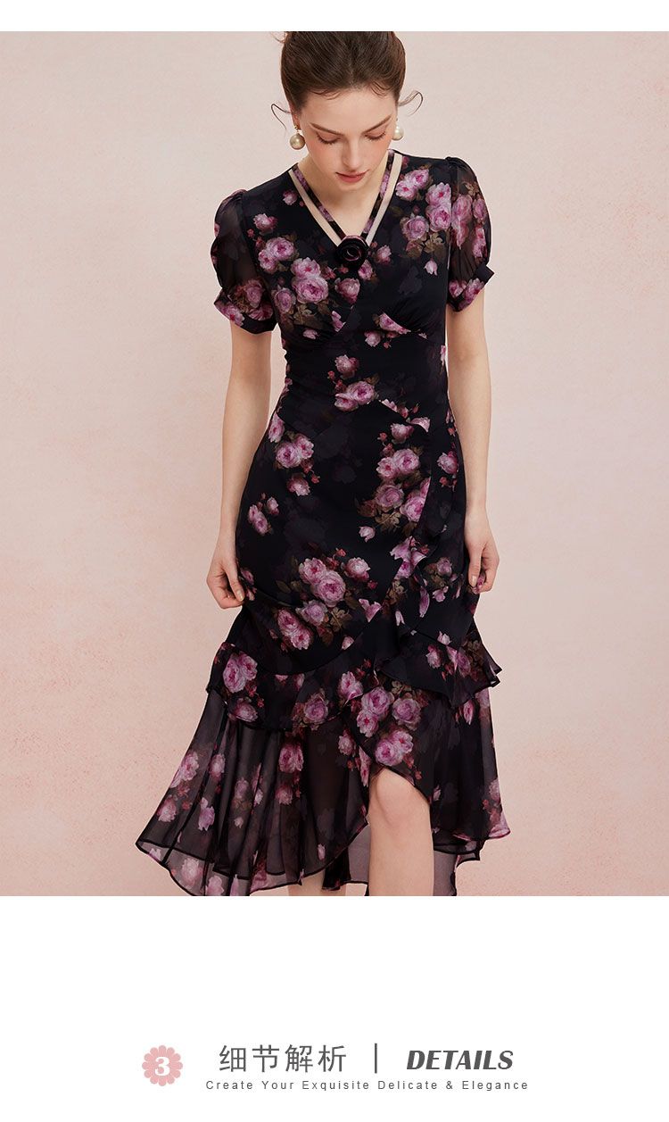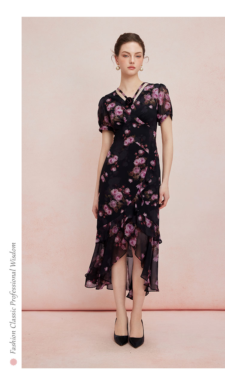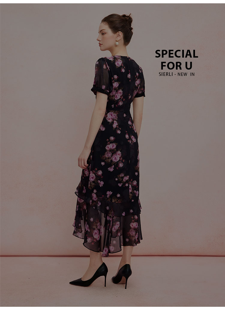 QF886斯尔丽25新款法式优雅度假风浪漫轻奢印花荷叶波浪边长款连衣裙