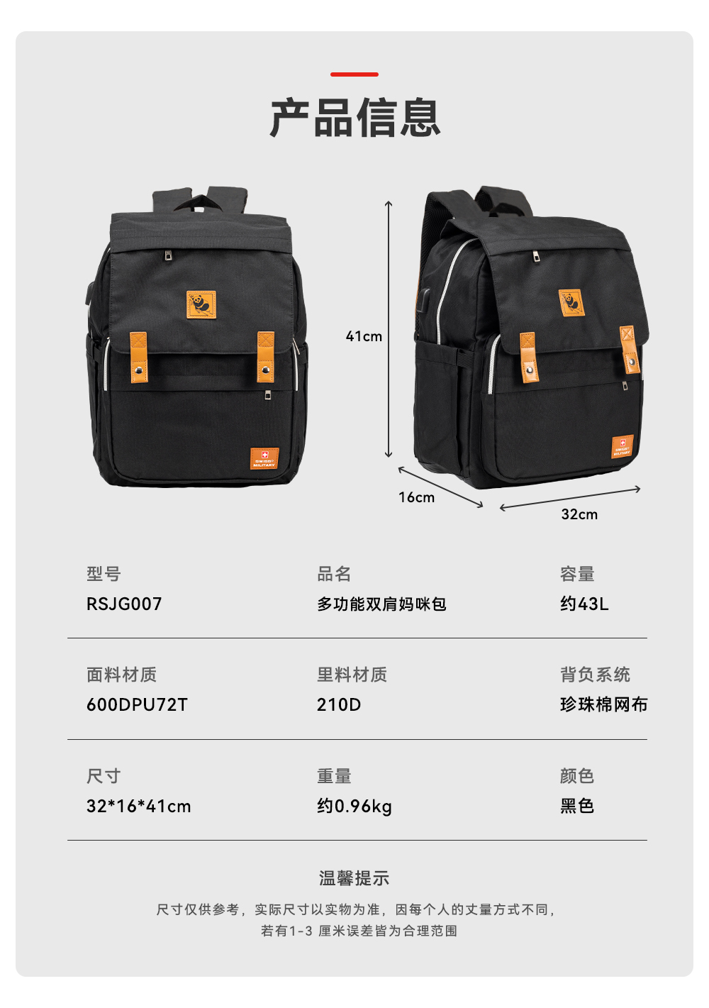 瑞士军工大容量双肩妈咪包RSJG007 规格:32*16*41cm