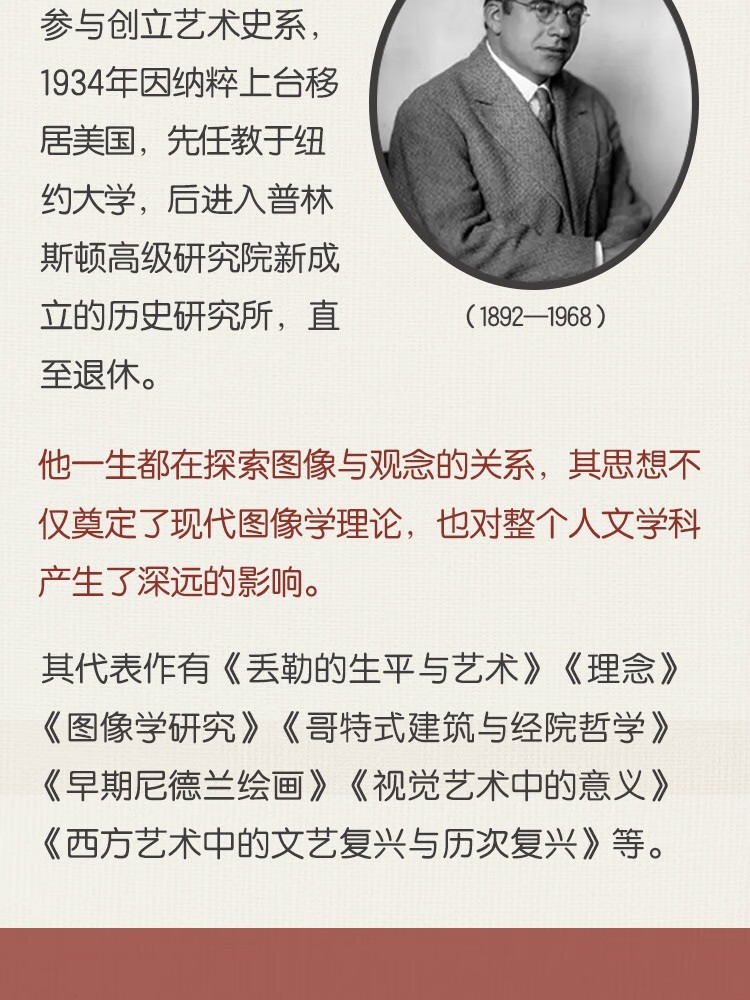欧文•潘诺夫斯基(Erwin Panofsky,1892—1968),出生于德国汉诺威,1921年进入汉堡大学参与创立艺术史系,1934年因纳粹上台移居美国,先任教于纽约大学,后进入普林斯顿高级研究院新成立的历史研究所,直至退休。他一生都在探索图像与观念的关系,其思想不仅奠定了现代图像学理论,也对整个人文学科产生了深远的影响。他培养了一大批优秀的艺术史学者,使艺术史学科受到世人尊敬。英国学者肯尼斯•克拉克把他描述为“那个时代最伟大的艺术史家”。其代表作有《图像学研究》《理念》《丢勒的生平与艺术》《哥特式建筑与经院哲学》《早期尼德兰绘画》《视觉艺术中的意义》《西方艺术中的文艺复兴与历次复兴》等。