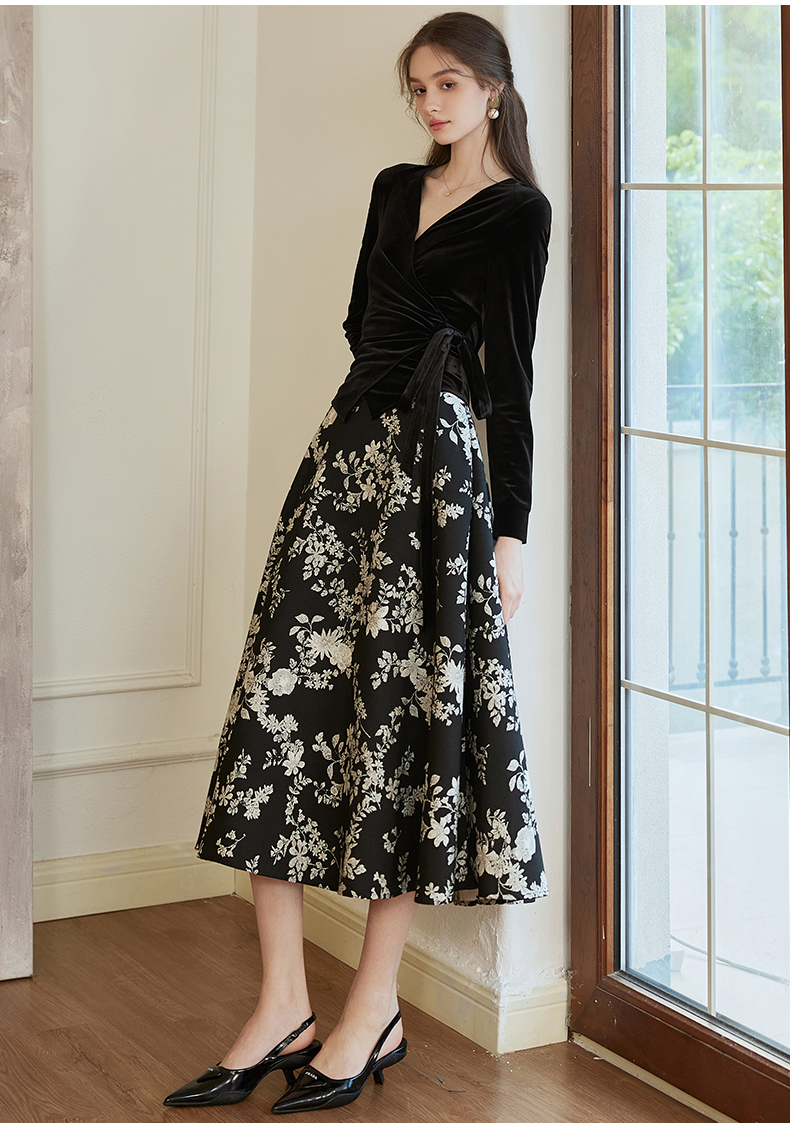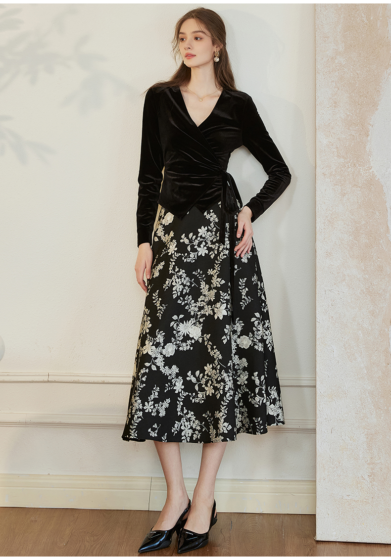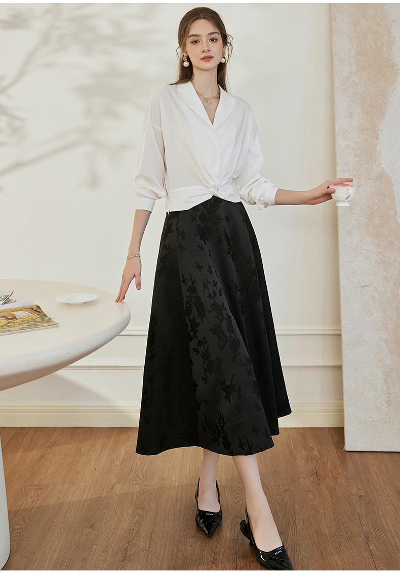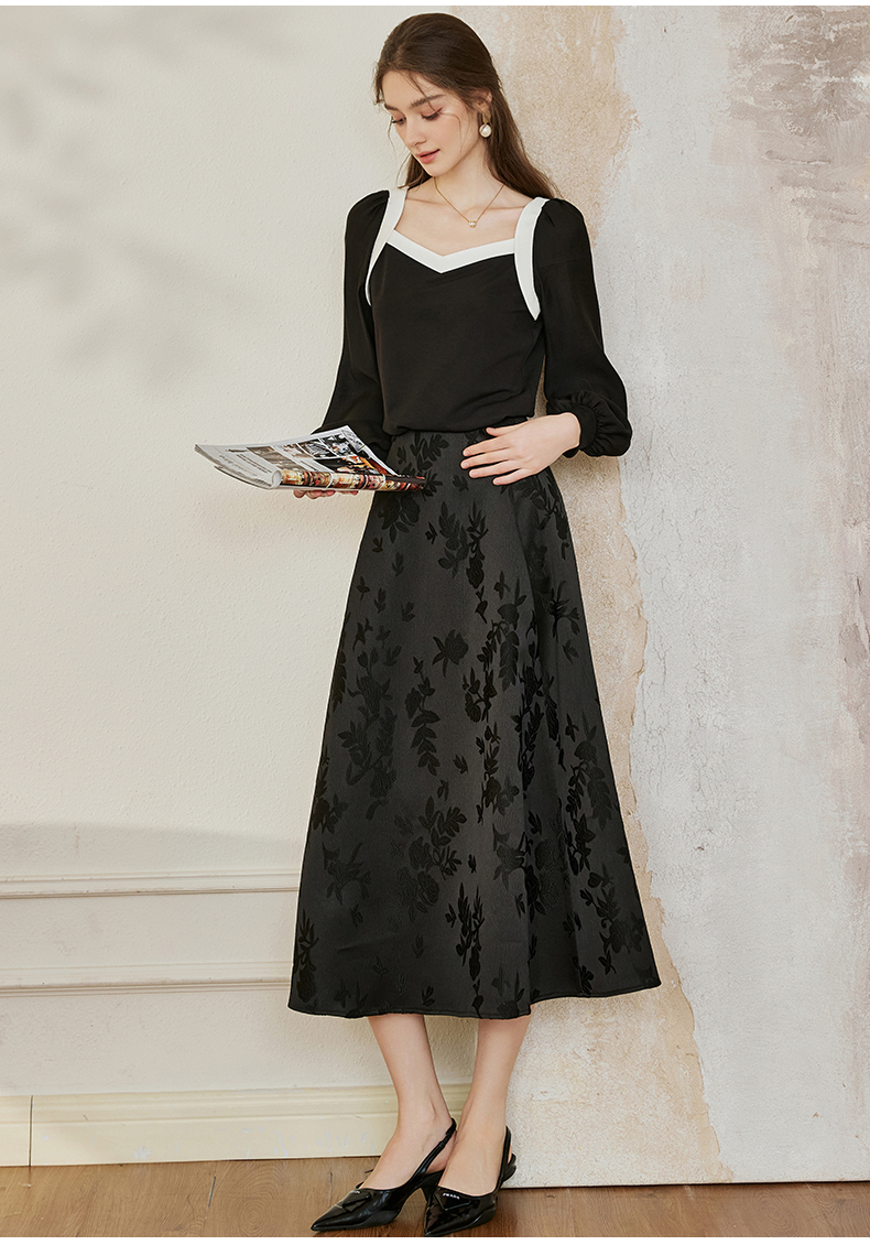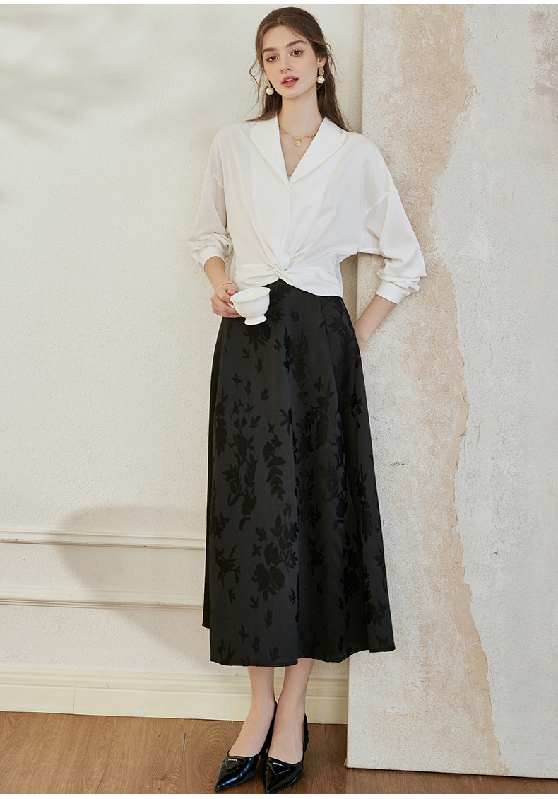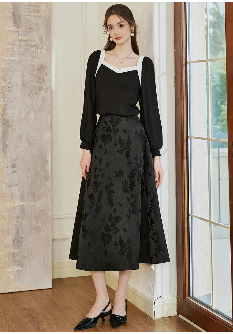 罗衣新中式中国风提花半身裙2024秋季新款高腰黑色大摆长裙10039