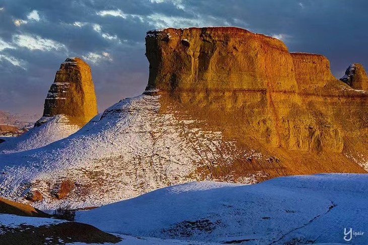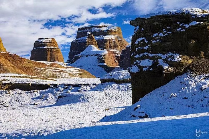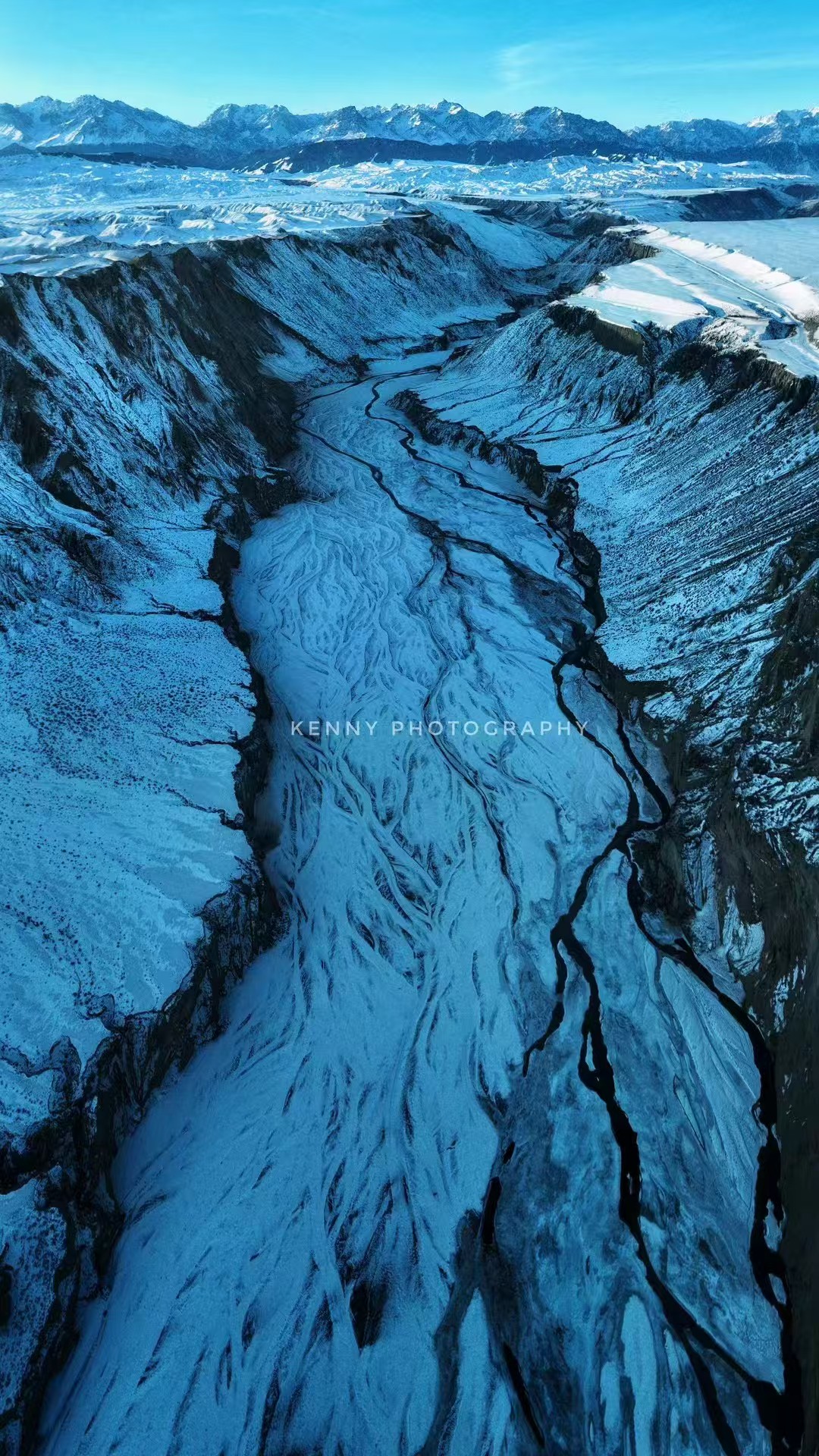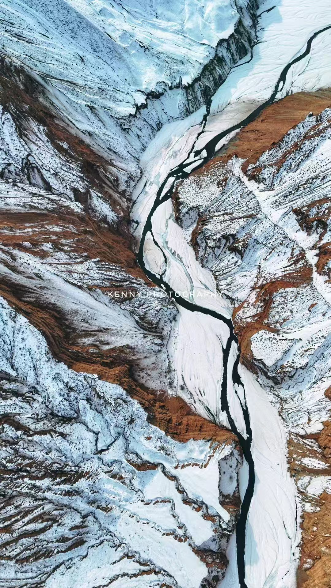 安集海大峡谷,这是一幅银装素裹的冬日画卷,白雪覆盖的沟壑与裸露的砂石形成明暗对比,展现出独特的视觉效果。