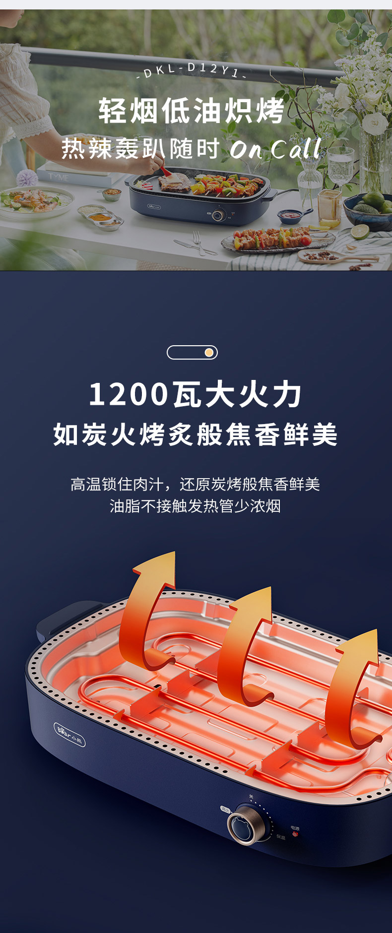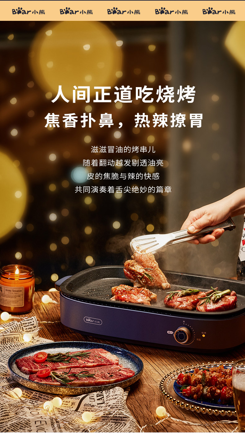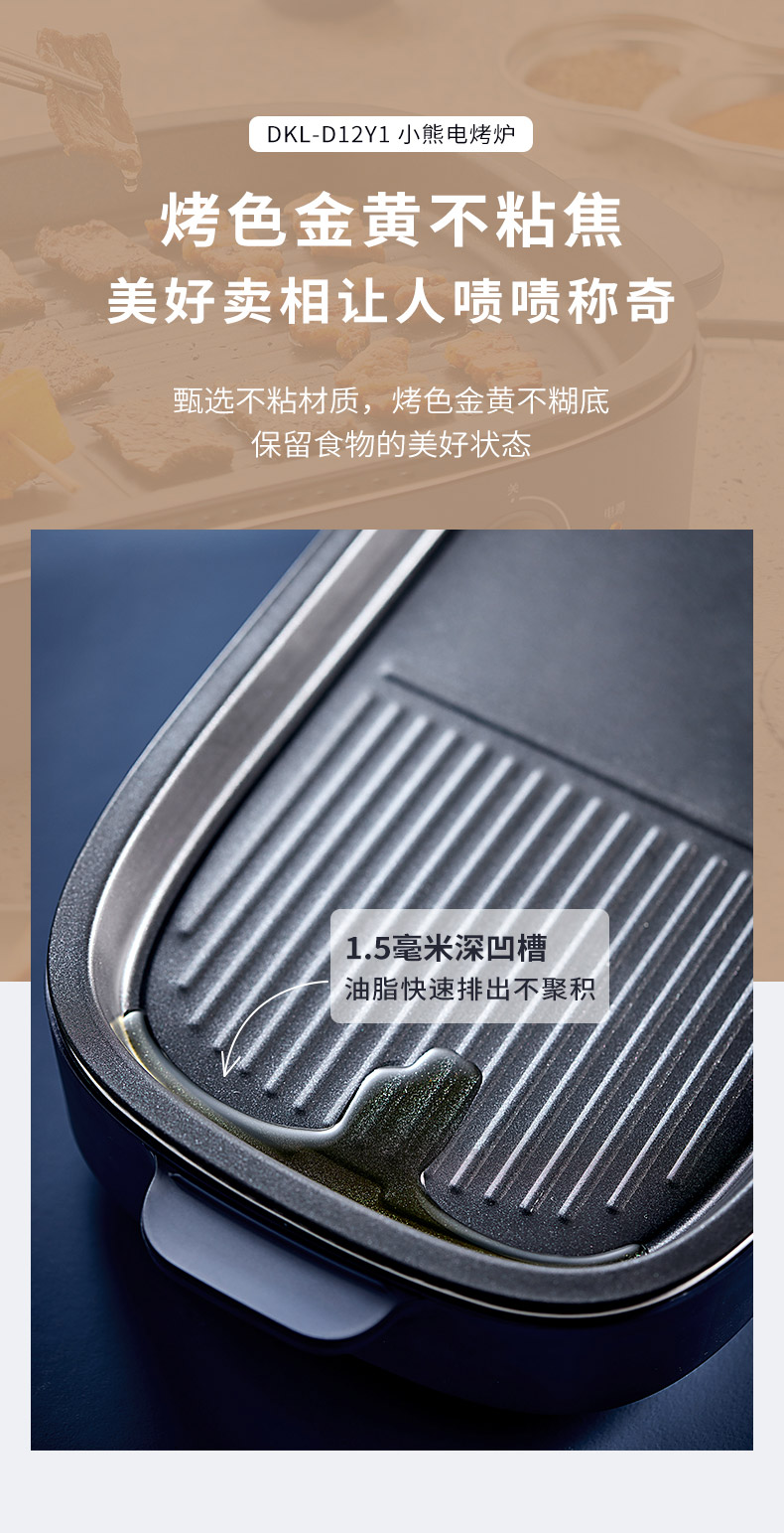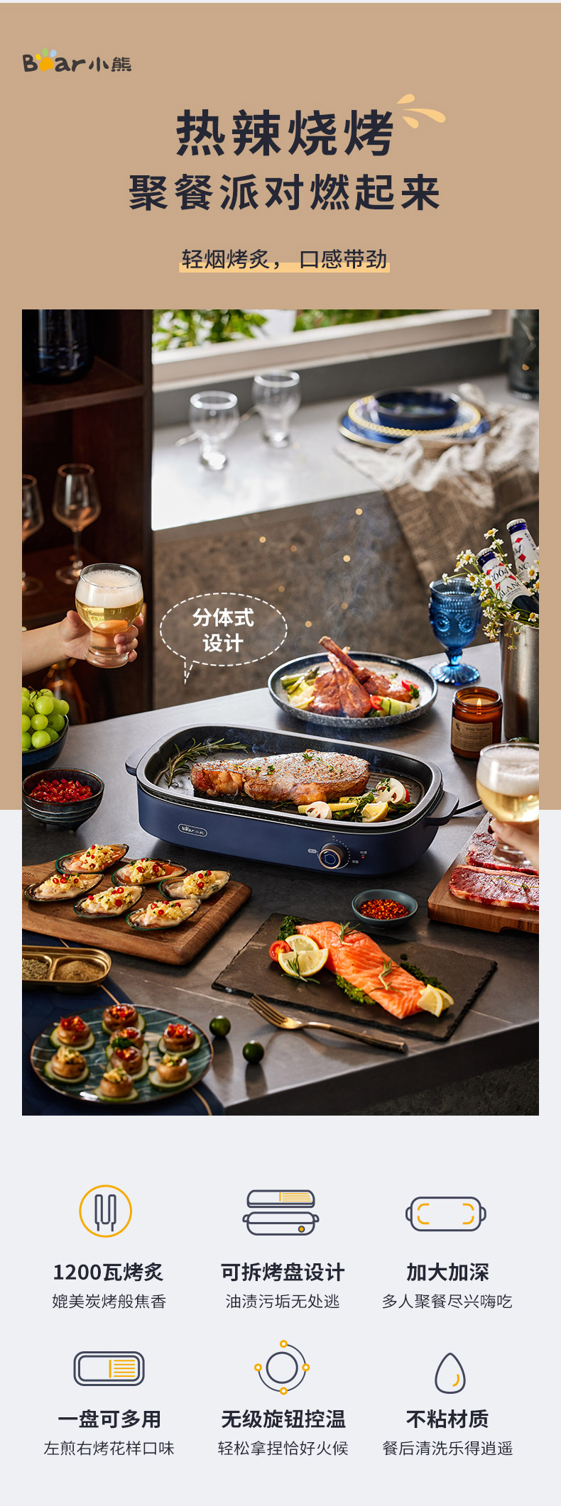 【小程序】小熊烤肉锅家用烤肉盘电烤盘一体多功能新款家庭室内可拆卸电烤炉 DKL-D12Y1 分离式烤盘+木铲(双色可选)