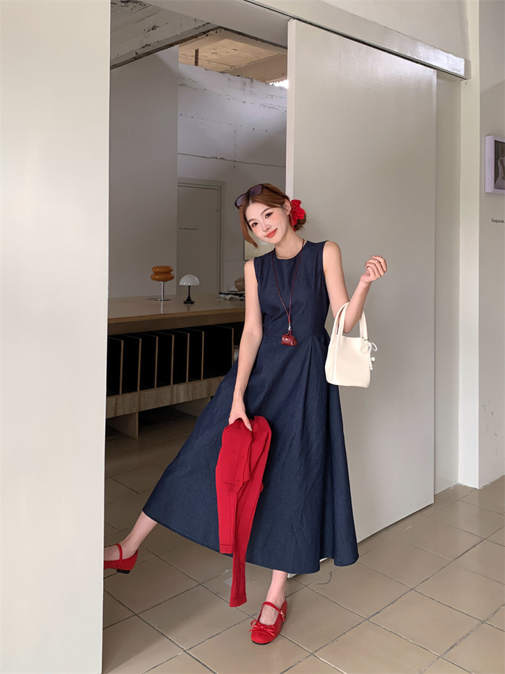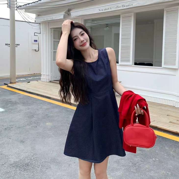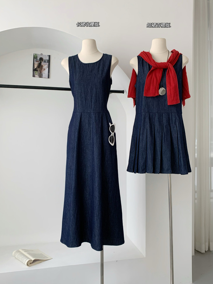 牛仔背心裙: 收腰设计: 高腰线剪裁,拉长腿部线条,显高显瘦,带抽绳。 A字裙摆: 自然散开,修饰臀腿曲线,适合多种身材。 复古圆领: 简约大方,凸显锁骨线条,增添优雅气质。