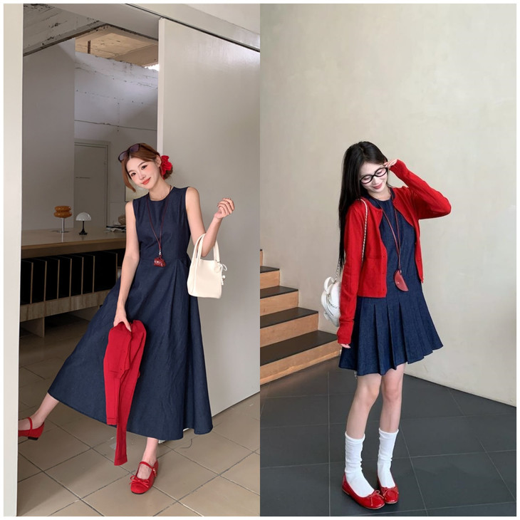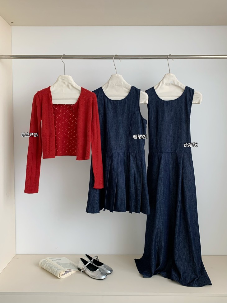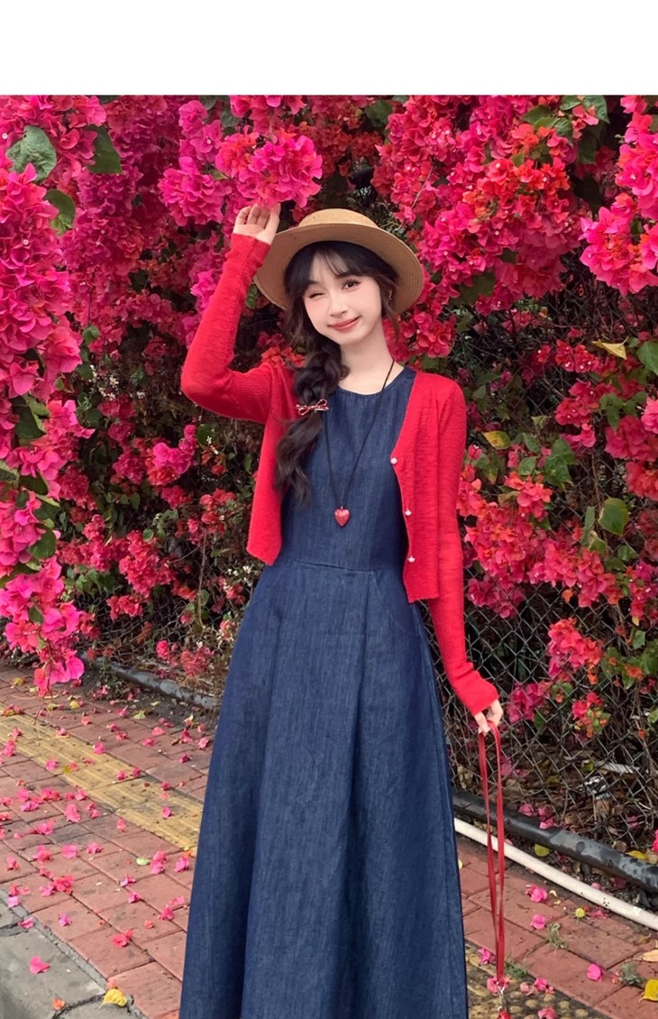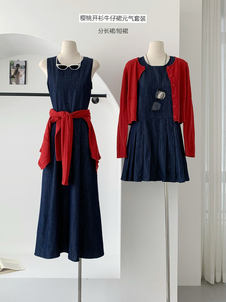 🌸【丹宁少女 樱桃开衫牛仔裙元气套装】🌈这套“复古设计感圆领收腰长款牛仔背心裙+针织开衫”👏🏻的丹宁套装, 🔥~结合了经典牛仔元素与柔软针织材质的碰撞