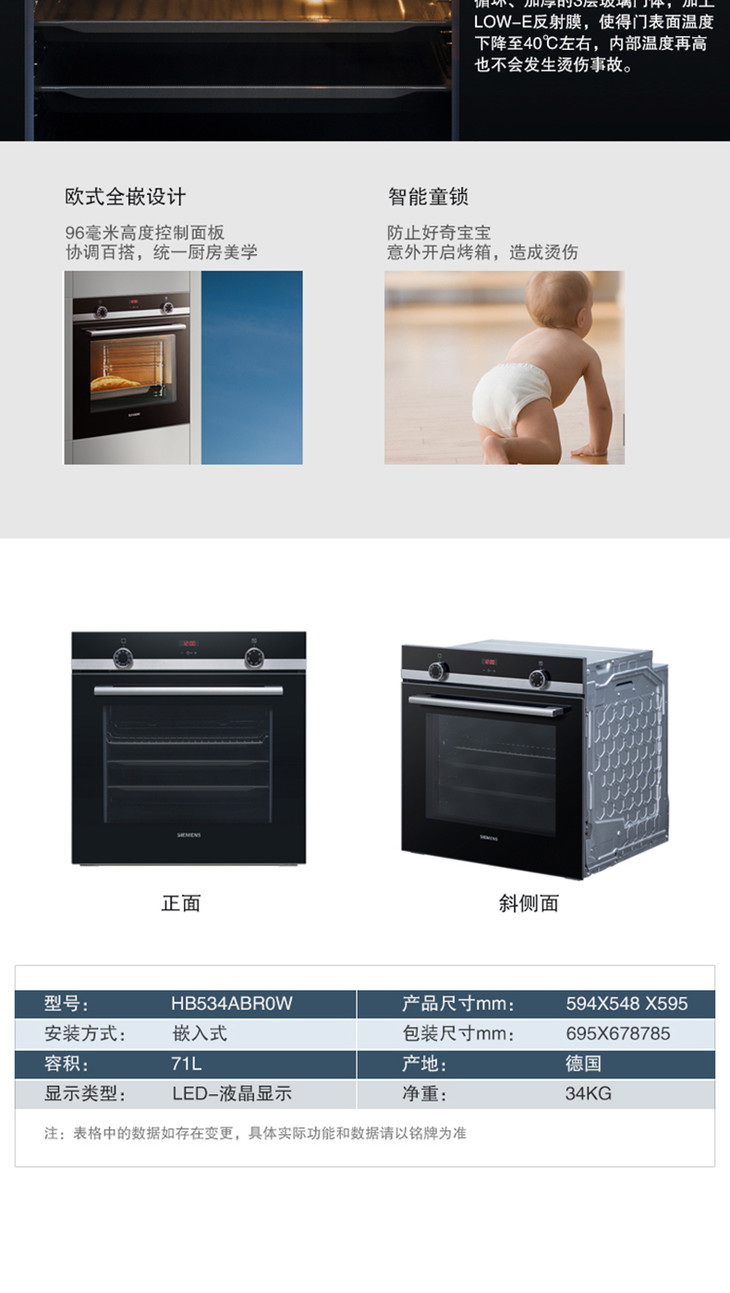 西门子(508595 ) HB534ABR0W 家用嵌入式电烤箱自清洁多功能烤箱