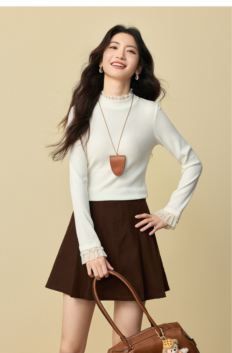 【12/31新品】熙世界云朵白色坑条针织打底衫女2025秋冬新款半高领内搭长袖毛衣