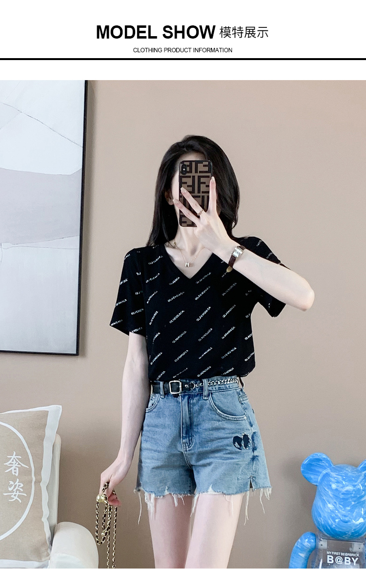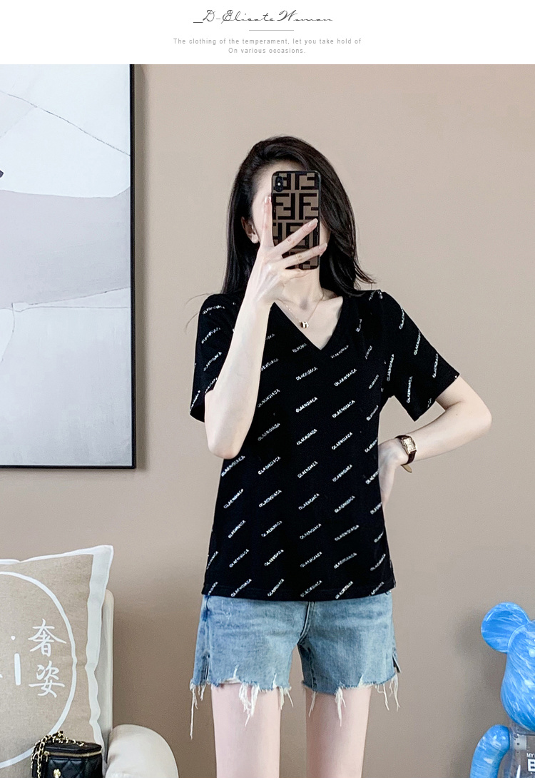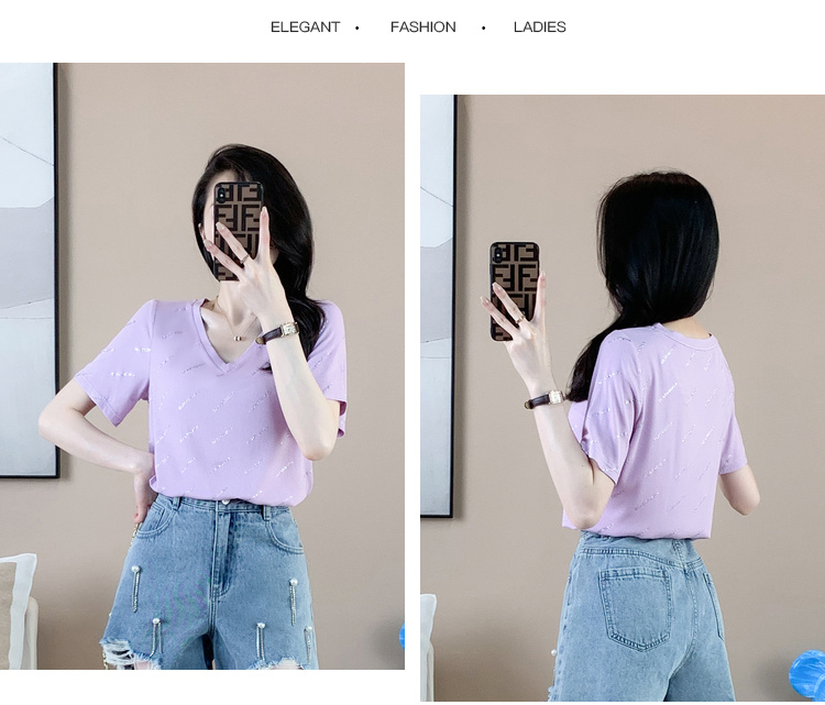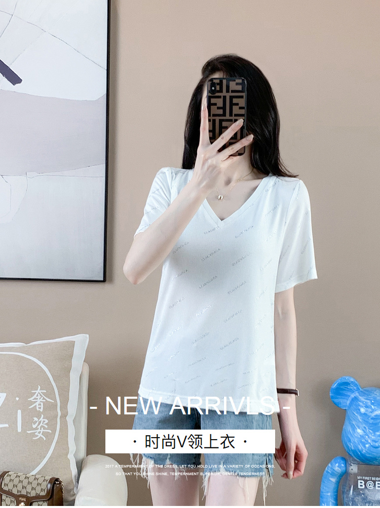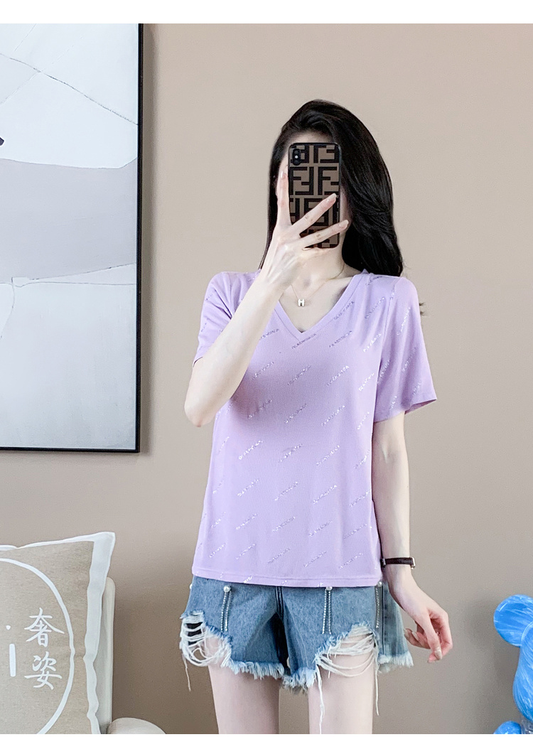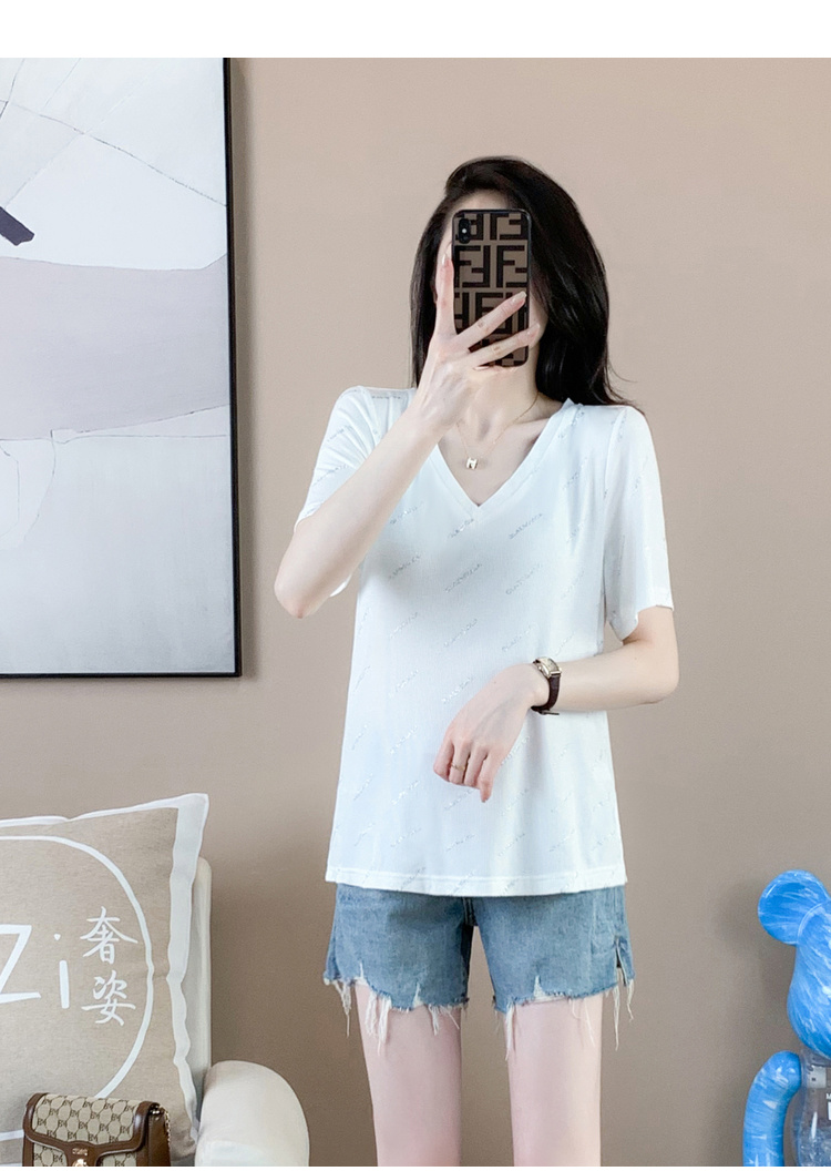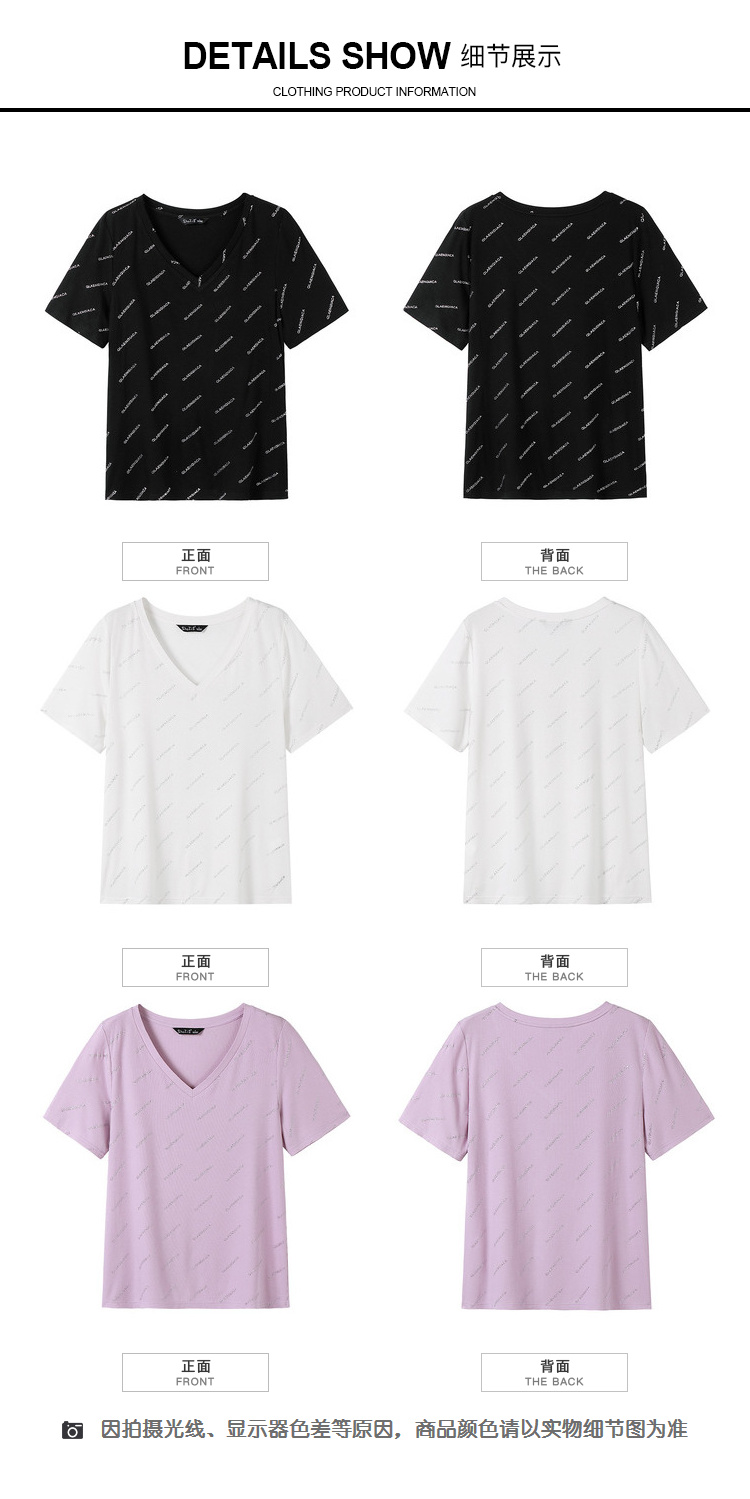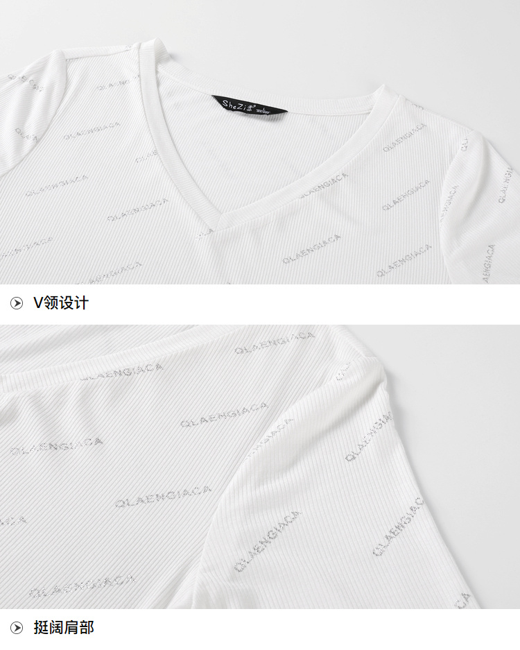 【清仓价】奢姿2023年夏装新款大码女装减龄字母烫银时尚T恤胖妹妹V领上衣9932152739