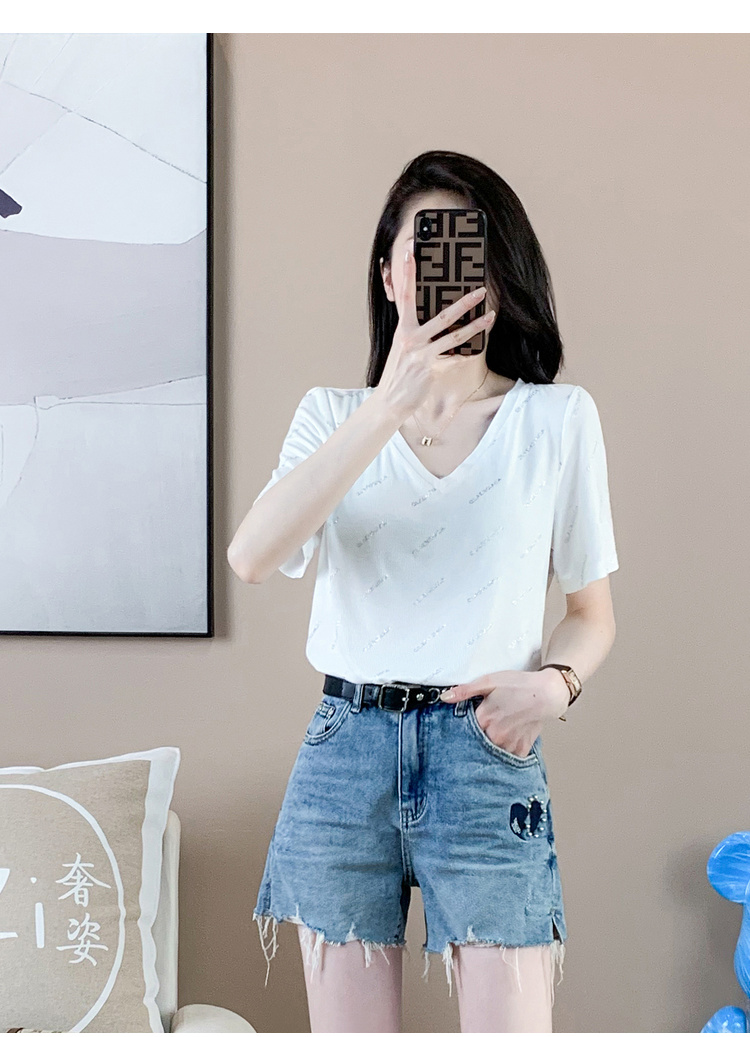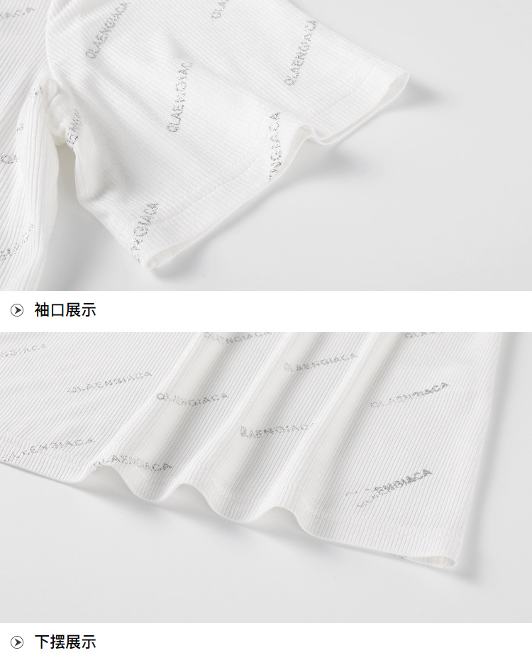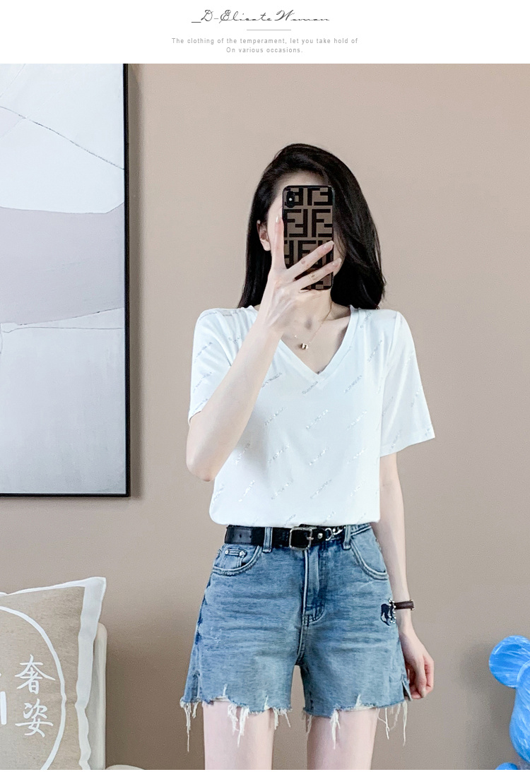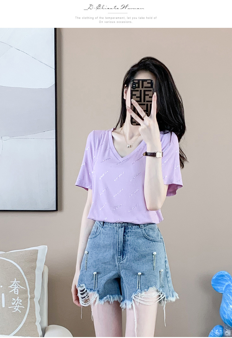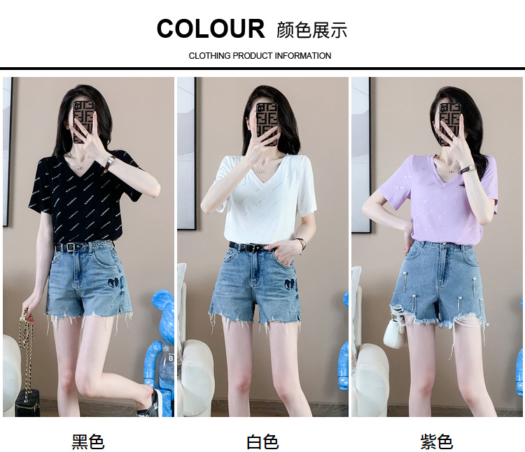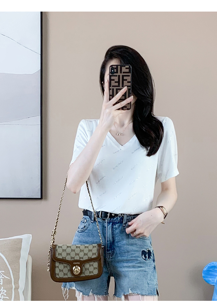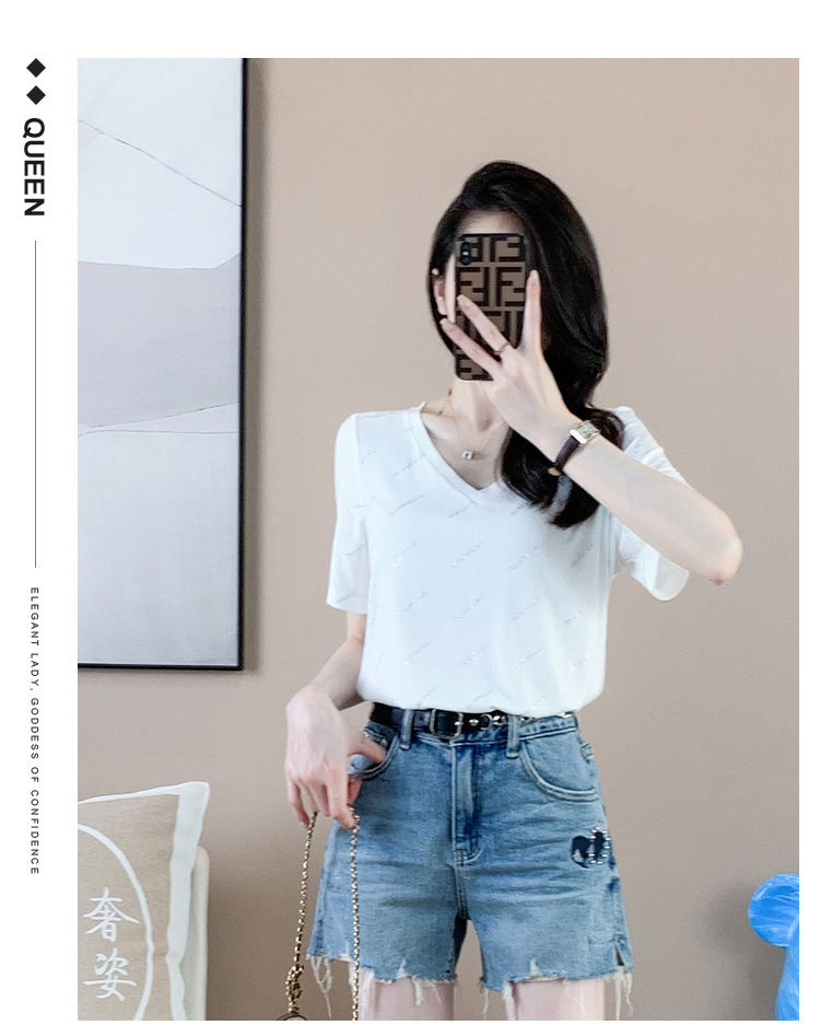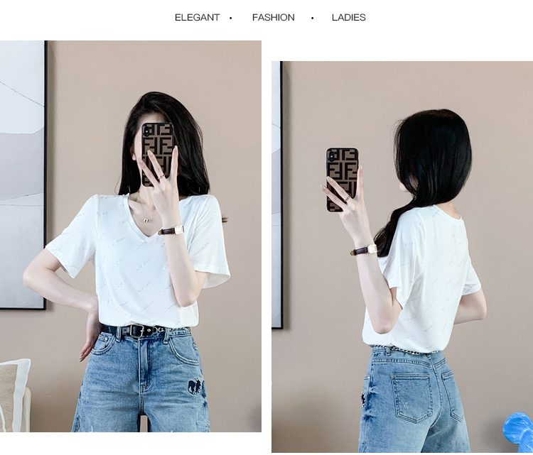 【清仓价】奢姿2023年夏装新款大码女装减龄字母烫银时尚T恤胖妹妹V领上衣9932152739