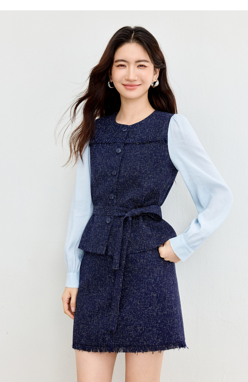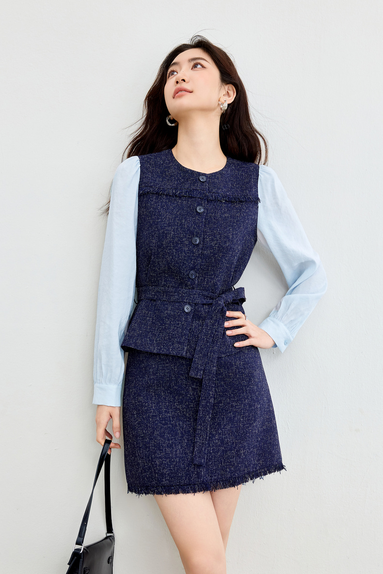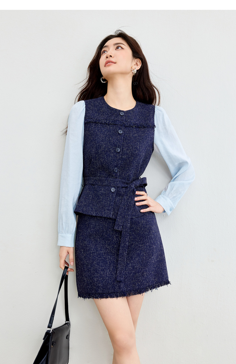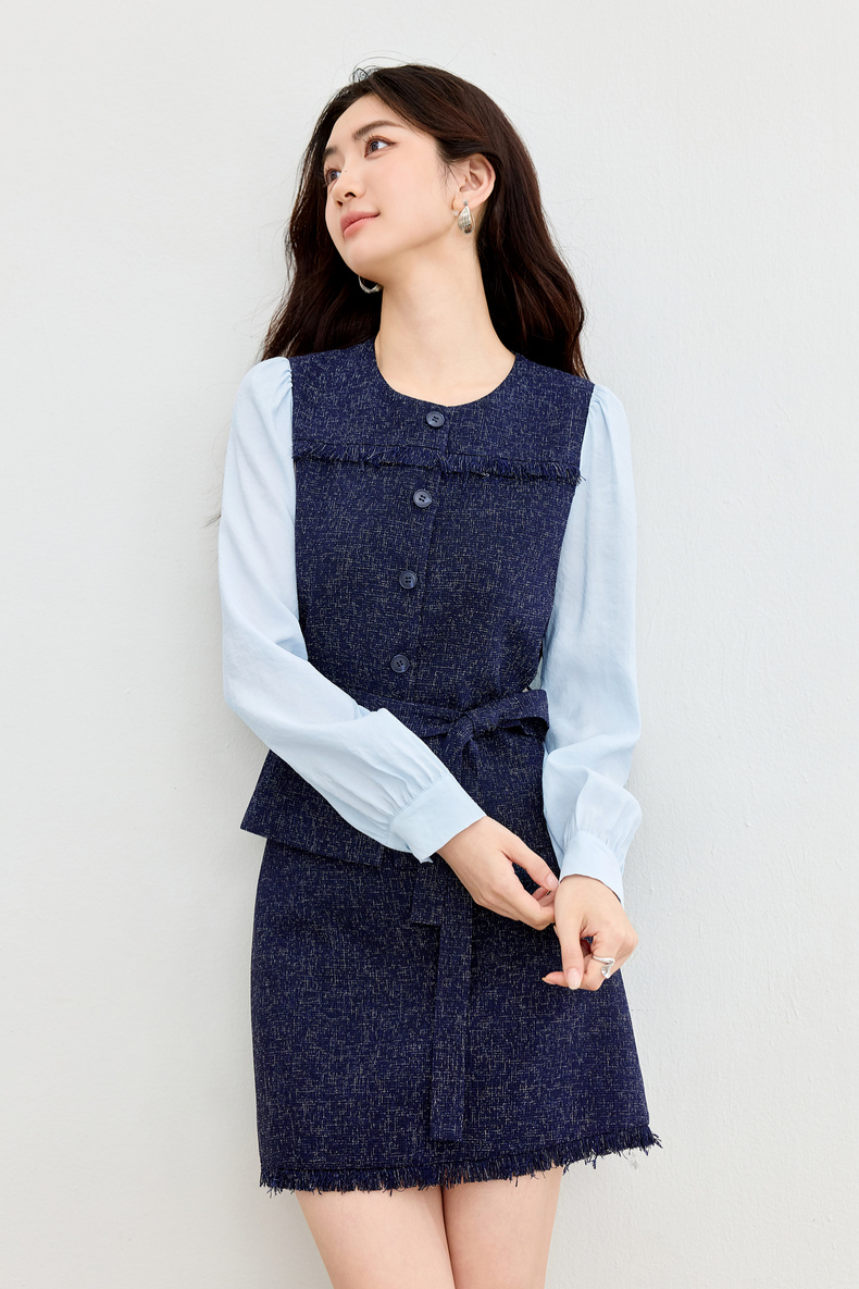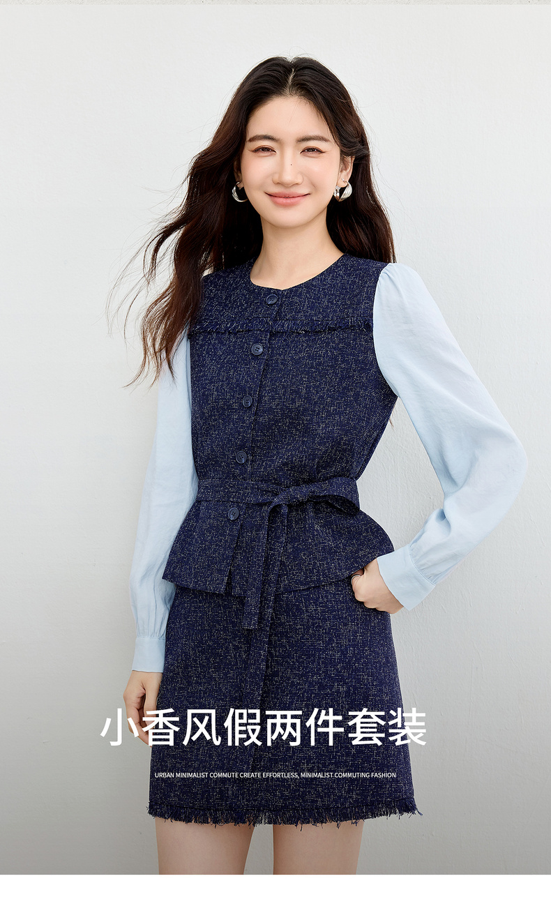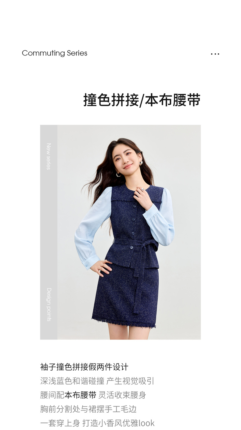 【内购】【免搭配套装】小香风圆领撞色拼接假两件可拆卸腰带上衣&A字短裙-153ZA3535