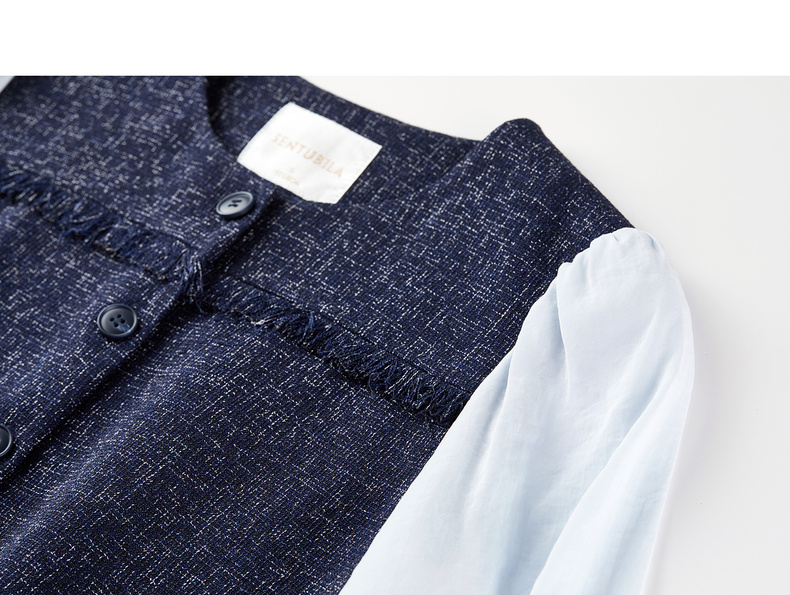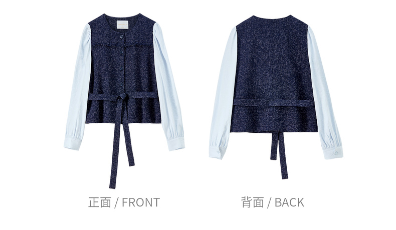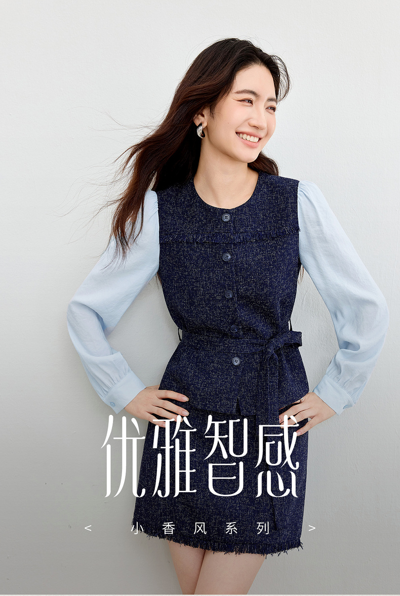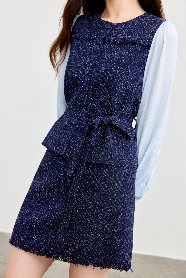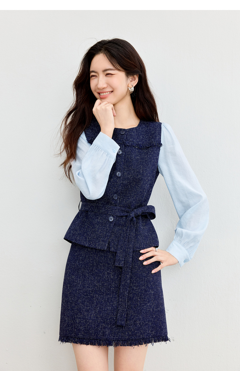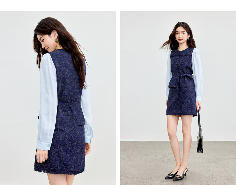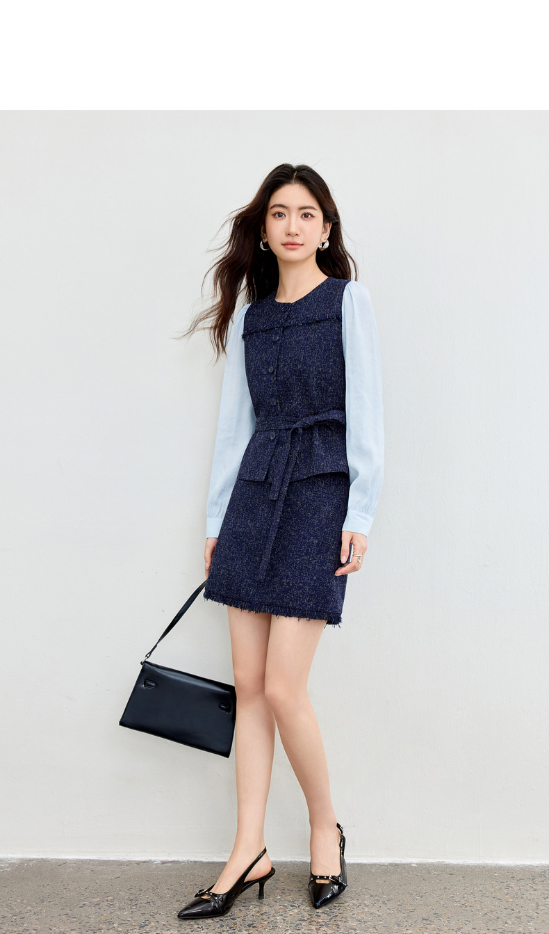 【内购】【免搭配套装】小香风圆领撞色拼接假两件可拆卸腰带上衣&A字短裙-153ZA3535