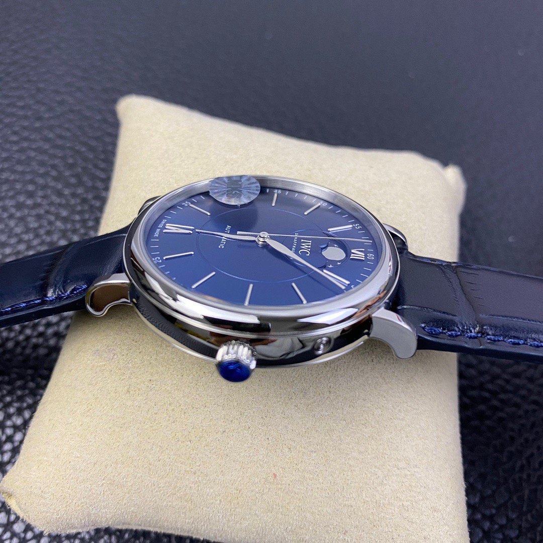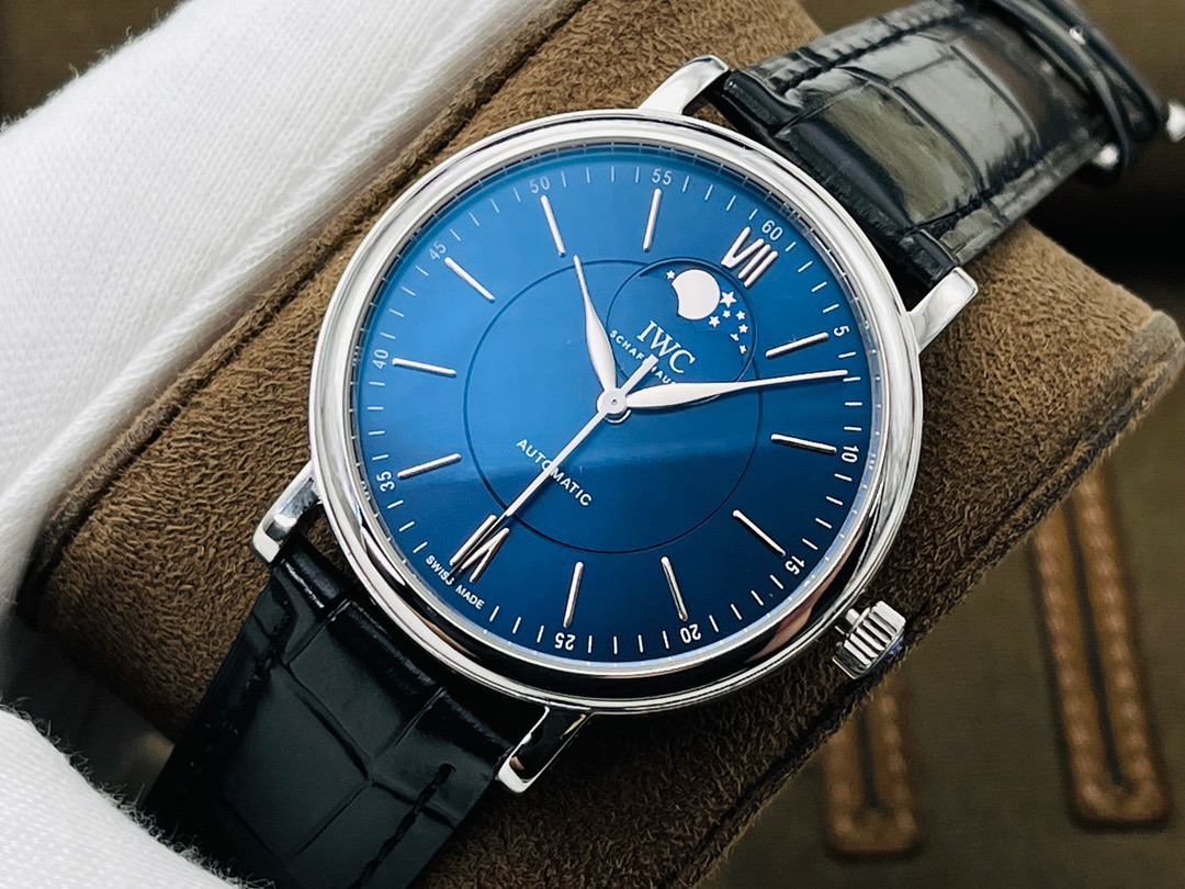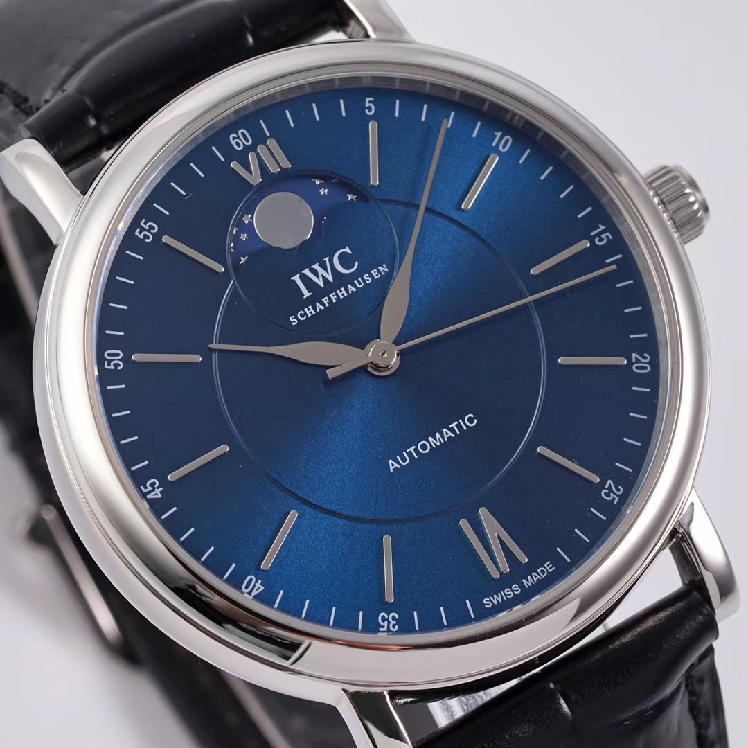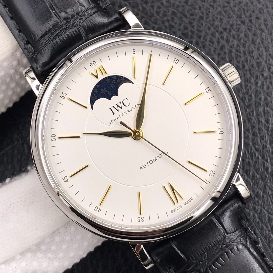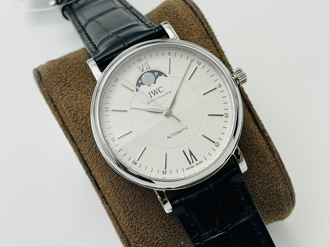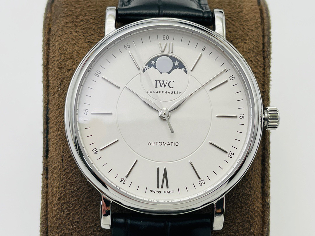波涛真月相 一天跳一小格 一个月走一圈 同步正品功能 IWC万国推出全新波涛菲诺系列40mm月相精钢机械男表IW459401,IW459402。月相显示无疑是所有复杂功能中最梦幻美丽的月相显示设计成一面繁星密布的夜空,月亮和星星仿若悬浮在无边无际的苍穹之中。月相以不同场景呈现于人们眼前——月亮时而闪现于云朵之中,时而悬浮于繁星闪烁的夜空之下。柳叶形指针以优雅的姿态勾勒出时间的神韵全新定制版原装进口全自动机械机芯,走时精准、稳定、耐用 腕表采用一枚造型精美的穹形蓝宝石水晶玻璃表镜,表镜经双面防眩处理偷光光清晰,边缘处圆润的弧度透着典雅的气息。表冠侧面饰以简洁的三角坑纹,结合相对较为突出的表冠设计,上链手感非常舒适不锈钢表壳造型圆润、精巧,其表耳微微弯曲的弧度符合人体工程学,贴合手腕,佩戴舒适。柏涛菲诺腕表系列一直是万国家族中的谦谦君子,是含蓄气质与高雅品味的完美化身。它以简洁、永恒的设计成为万国表最热卖的腕表系列之一,受到男士和女士的一致青睐。万国糅合精准无比的性能和独一无二的设计,为我们呈现了一场美轮美奂的视觉享受。