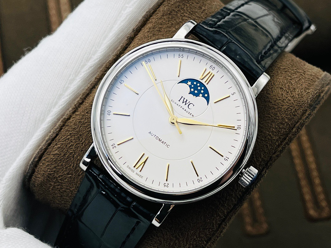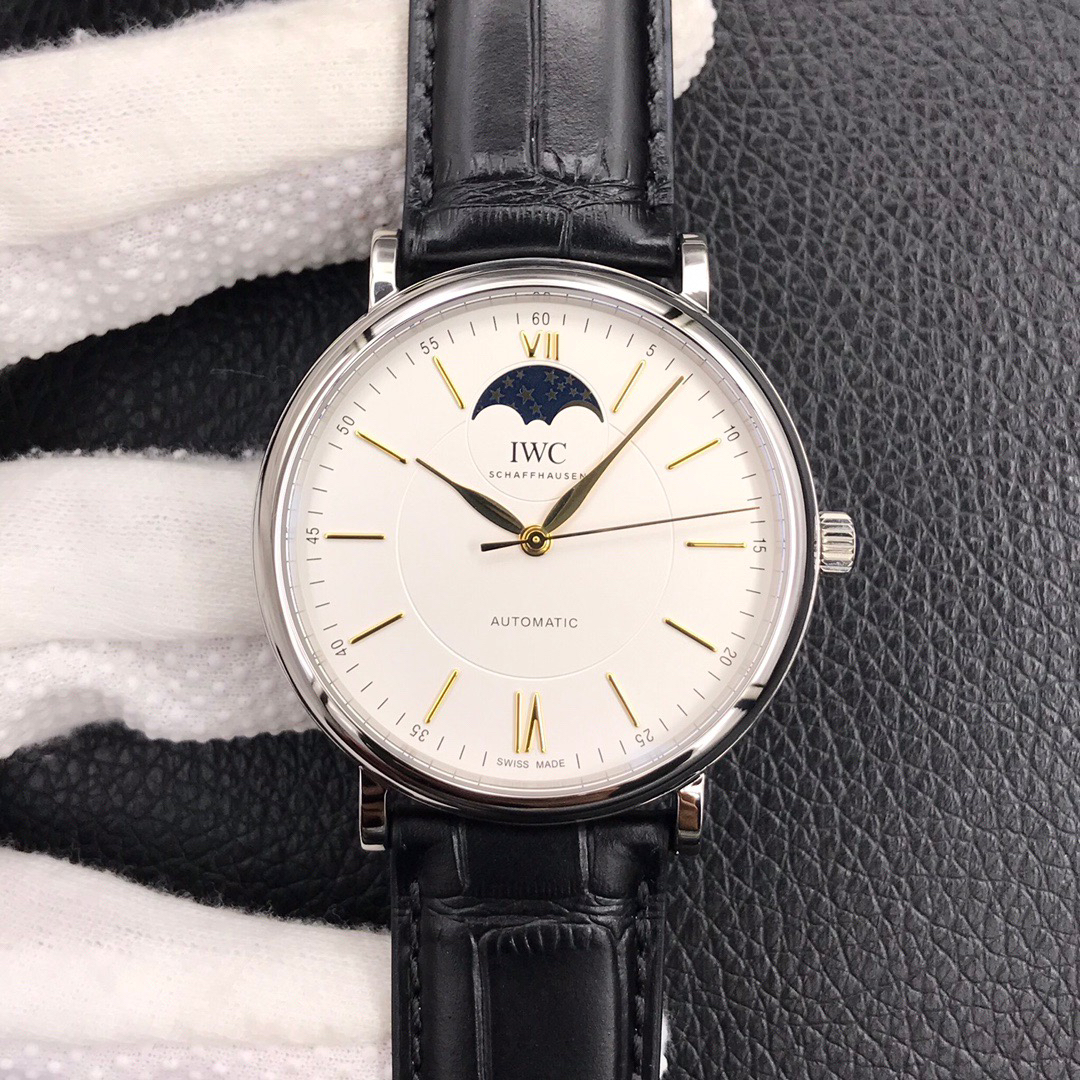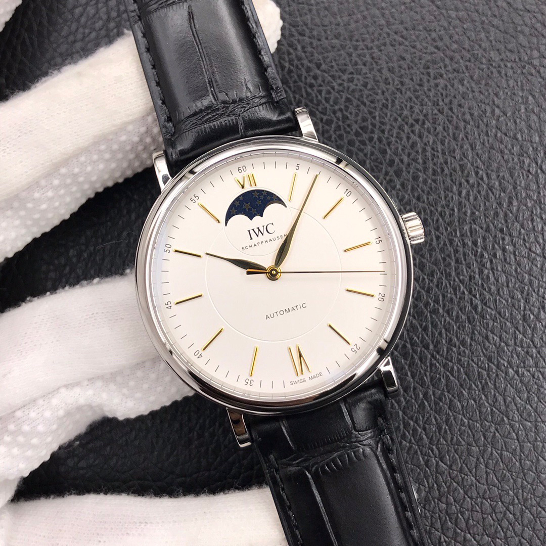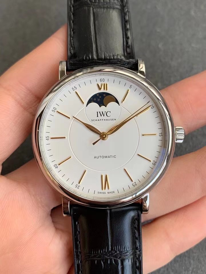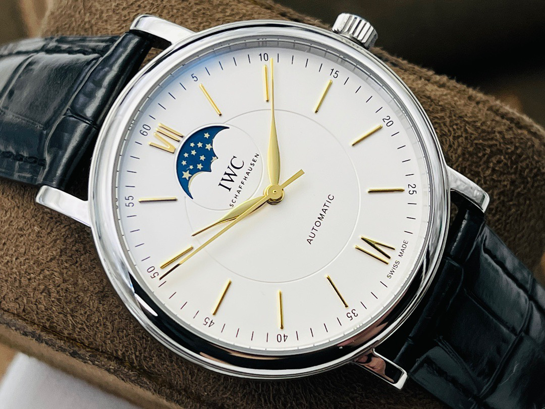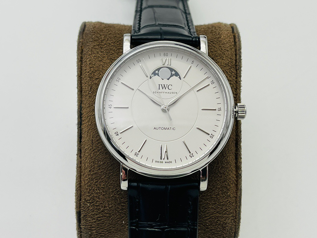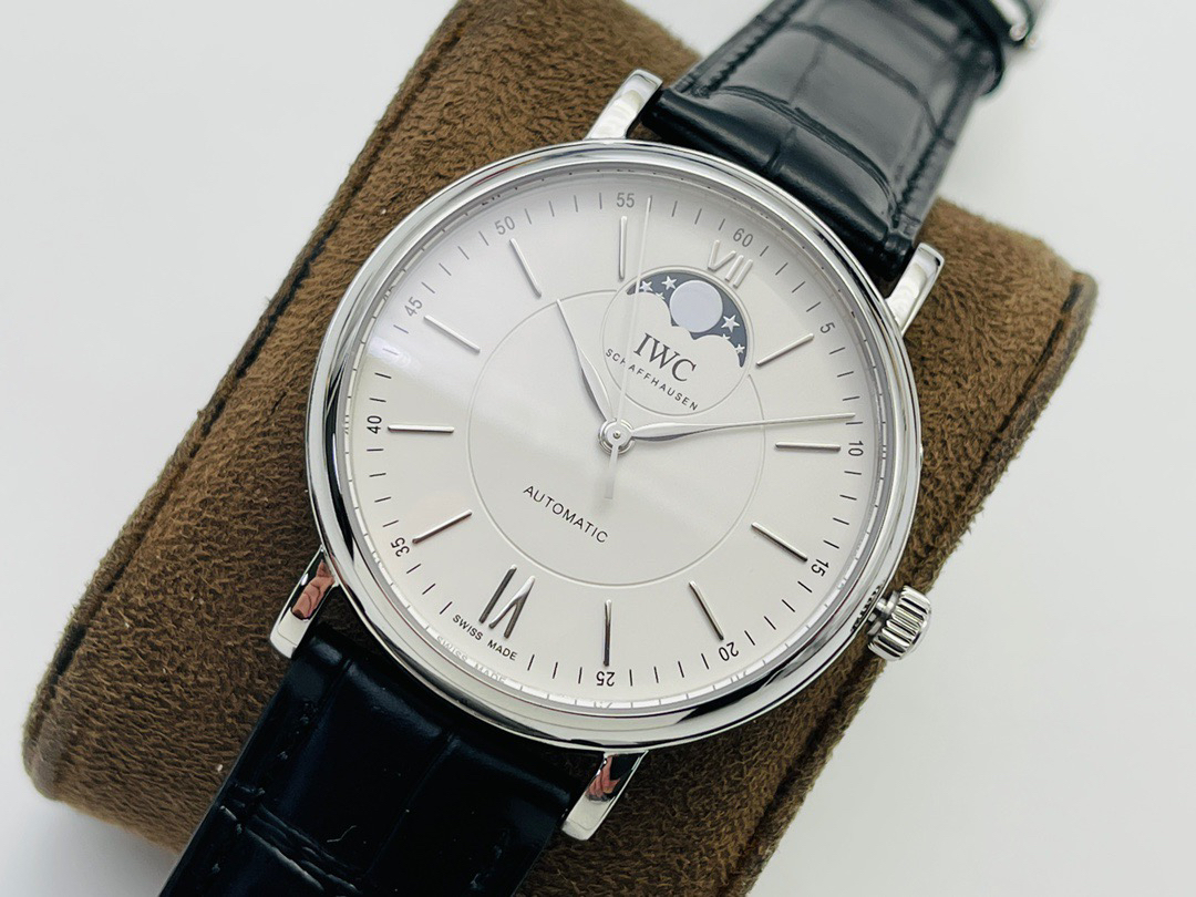 波涛真月相 一天跳一小格 一个月走一圈 同步正品功能 IWC万国推出全新波涛菲诺系列40mm月相精钢机械男表IW459401,IW459402。月相显示无疑是所有复杂功能中最梦幻美丽的月相显示设计成一面繁星密布的夜空,月亮和星星仿若悬浮在无边无际的苍穹之中。月相以不同场景呈现于人们眼前——月亮时而闪现于云朵之中,时而悬浮于繁星闪烁的夜空之下。柳叶形指针以优雅的姿态勾勒出时间的神韵全新定制版原装进口全自动机械机芯,走时精准、稳定、耐用 腕表采用一枚造型精美的穹形蓝宝石水晶玻璃表镜,表镜经双面防眩处理偷光光清晰,边缘处圆润的弧度透着典雅的气息。表冠侧面饰以简洁的三角坑纹,结合相对较为突出的表冠设计,上链手感非常舒适不锈钢表壳造型圆润、精巧,其表耳微微弯曲的弧度符合人体工程学,贴合手腕,佩戴舒适。柏涛菲诺腕表系列一直是万国家族中的谦谦君子,是含蓄气质与高雅品味的完美化身。它以简洁、永恒的设计成为万国表最热卖的腕表系列之一,受到男士和女士的一致青睐。万国糅合精准无比的性能和独一无二的设计,为我们呈现了一场美轮美奂的视觉享受。