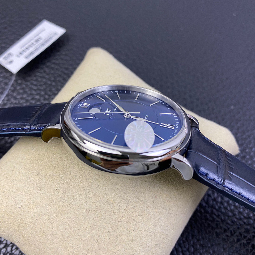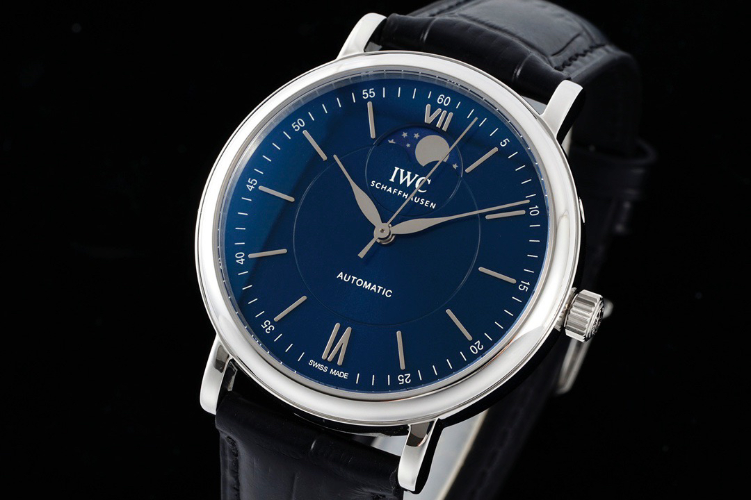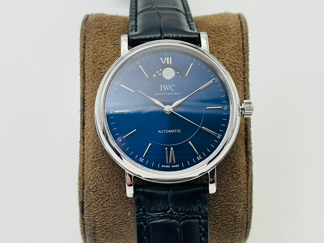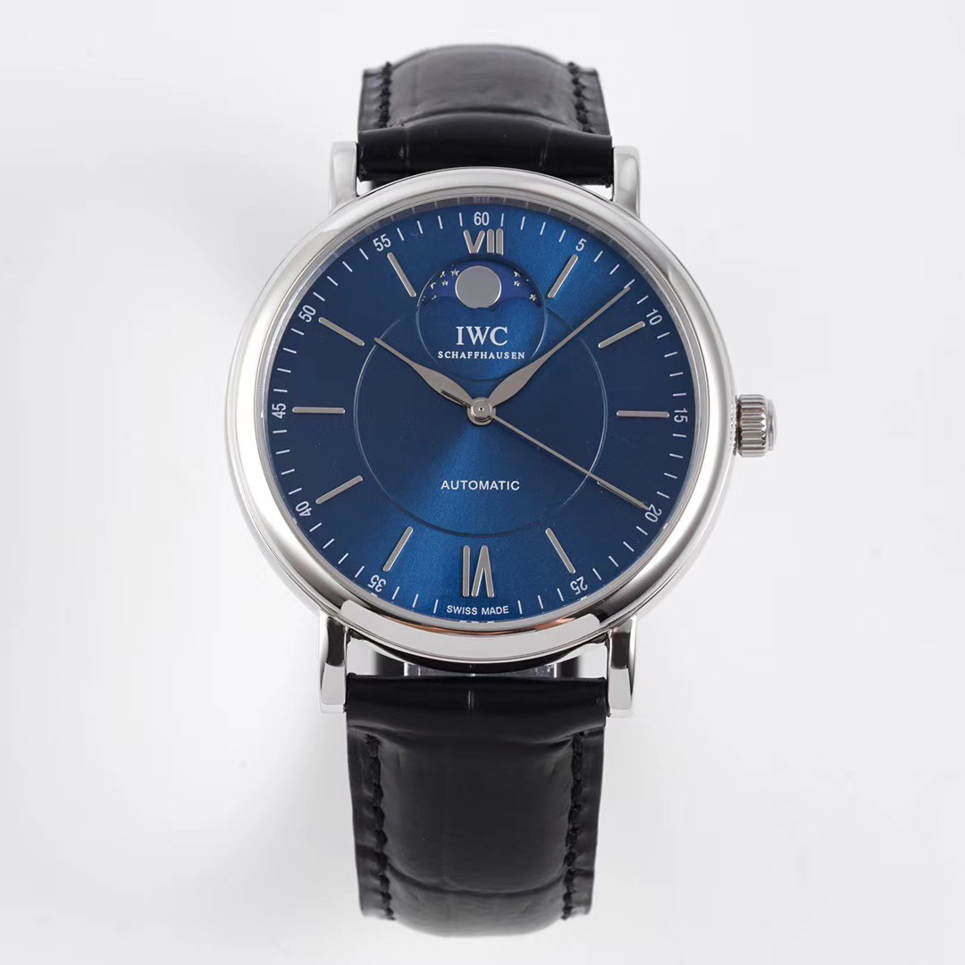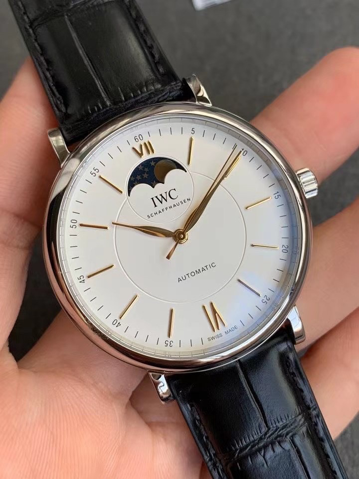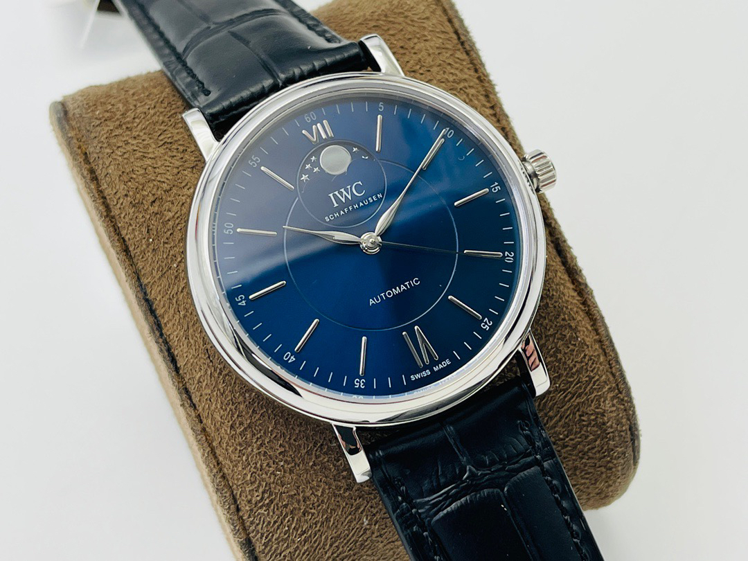 波涛真月相 一天跳一小格 一个月走一圈 同步正品功能 IWC万国推出全新波涛菲诺系列40mm月相精钢机械男表IW459401,IW459402。月相显示无疑是所有复杂功能中最梦幻美丽的月相显示设计成一面繁星密布的夜空,月亮和星星仿若悬浮在无边无际的苍穹之中。月相以不同场景呈现于人们眼前——月亮时而闪现于云朵之中,时而悬浮于繁星闪烁的夜空之下。柳叶形指针以优雅的姿态勾勒出时间的神韵全新定制版原装进口全自动机械机芯,走时精准、稳定、耐用 腕表采用一枚造型精美的穹形蓝宝石水晶玻璃表镜,表镜经双面防眩处理偷光光清晰,边缘处圆润的弧度透着典雅的气息。表冠侧面饰以简洁的三角坑纹,结合相对较为突出的表冠设计,上链手感非常舒适不锈钢表壳造型圆润、精巧,其表耳微微弯曲的弧度符合人体工程学,贴合手腕,佩戴舒适。柏涛菲诺腕表系列一直是万国家族中的谦谦君子,是含蓄气质与高雅品味的完美化身。它以简洁、永恒的设计成为万国表最热卖的腕表系列之一,受到男士和女士的一致青睐。万国糅合精准无比的性能和独一无二的设计,为我们呈现了一场美轮美奂的视觉享受。