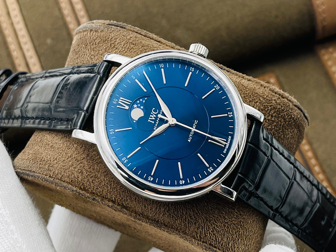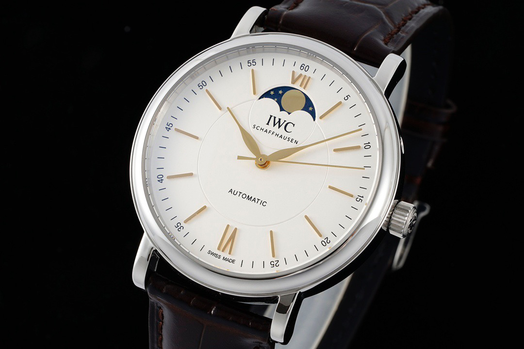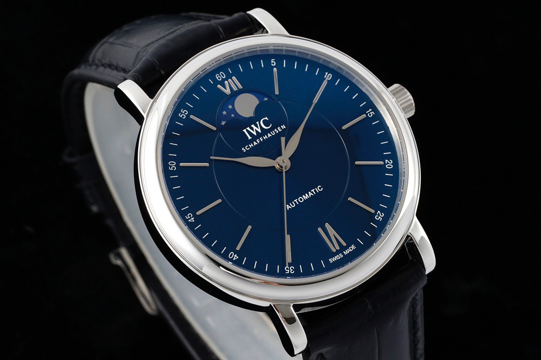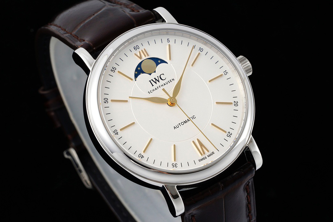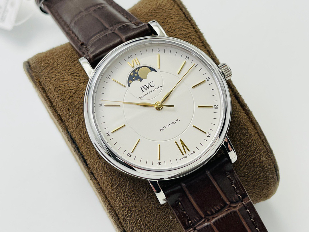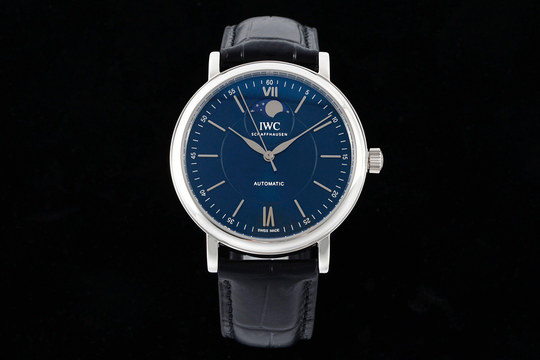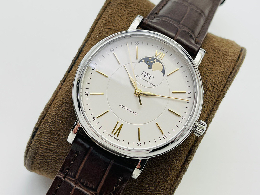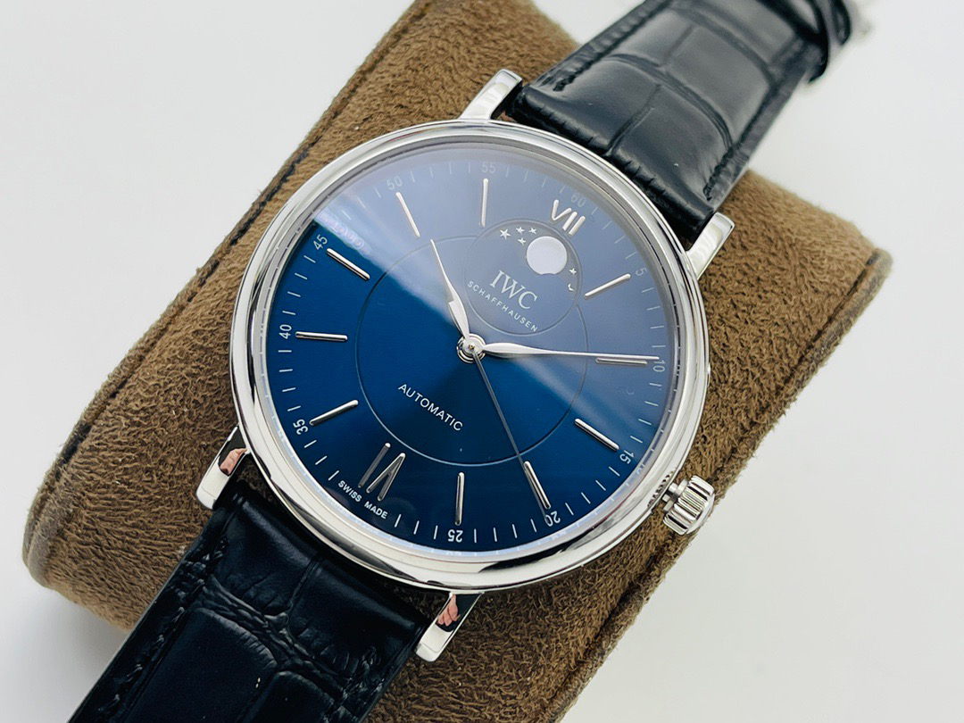 波涛真月相 一天跳一小格 一个月走一圈 同步正品功能 IWC万国推出全新波涛菲诺系列40mm月相精钢机械男表IW459401,IW459402。月相显示无疑是所有复杂功能中最梦幻美丽的月相显示设计成一面繁星密布的夜空,月亮和星星仿若悬浮在无边无际的苍穹之中。月相以不同场景呈现于人们眼前——月亮时而闪现于云朵之中,时而悬浮于繁星闪烁的夜空之下。柳叶形指针以优雅的姿态勾勒出时间的神韵全新定制版原装进口全自动机械机芯,走时精准、稳定、耐用 腕表采用一枚造型精美的穹形蓝宝石水晶玻璃表镜,表镜经双面防眩处理偷光光清晰,边缘处圆润的弧度透着典雅的气息。表冠侧面饰以简洁的三角坑纹,结合相对较为突出的表冠设计,上链手感非常舒适不锈钢表壳造型圆润、精巧,其表耳微微弯曲的弧度符合人体工程学,贴合手腕,佩戴舒适。柏涛菲诺腕表系列一直是万国家族中的谦谦君子,是含蓄气质与高雅品味的完美化身。它以简洁、永恒的设计成为万国表最热卖的腕表系列之一,受到男士和女士的一致青睐。万国糅合精准无比的性能和独一无二的设计,为我们呈现了一场美轮美奂的视觉享受。