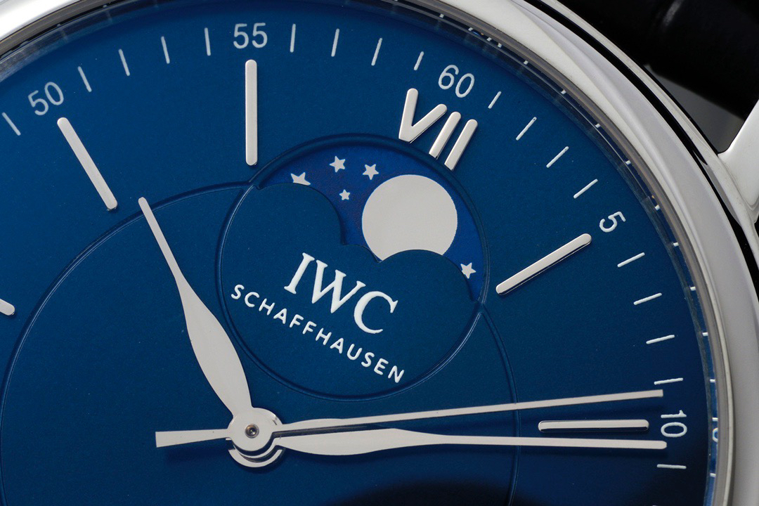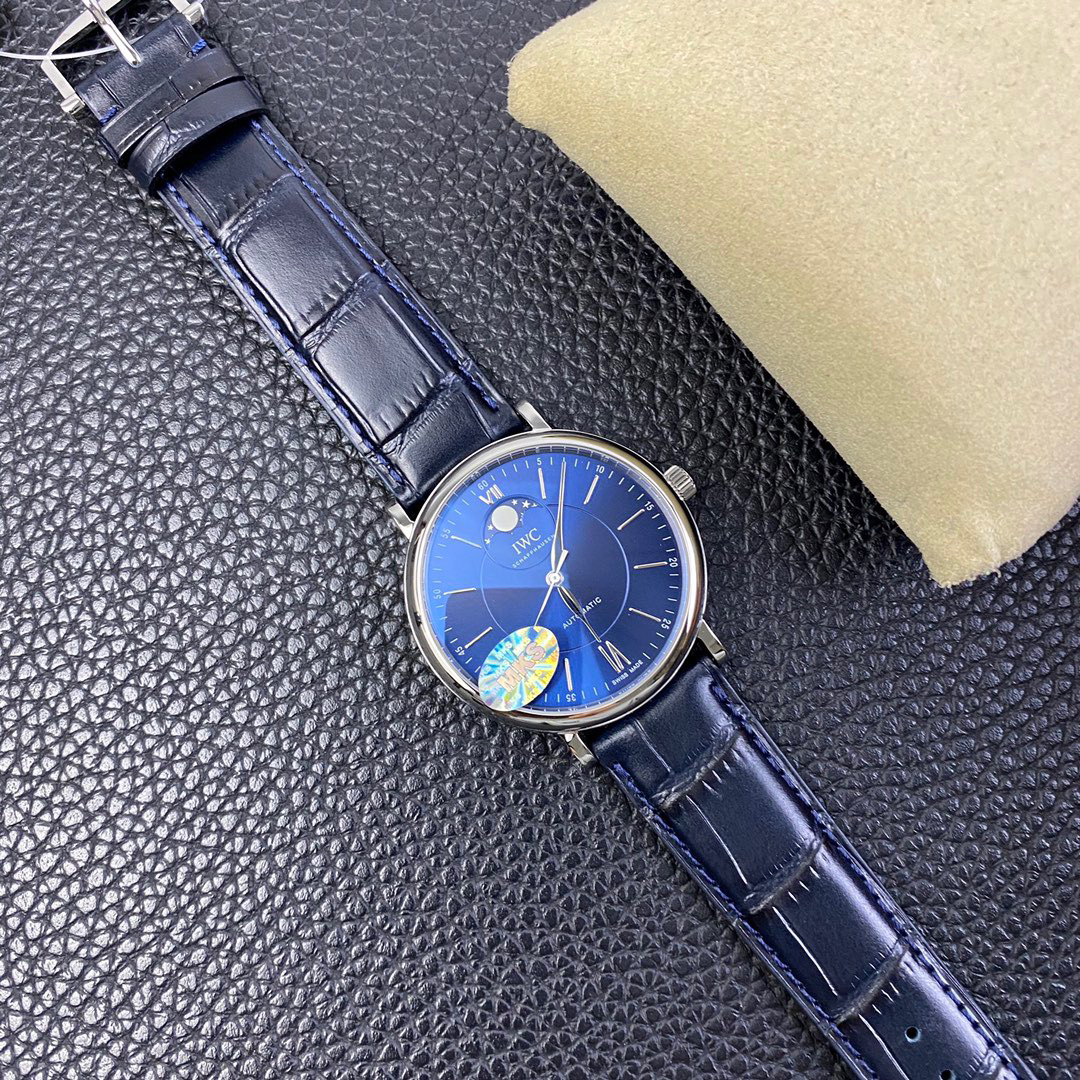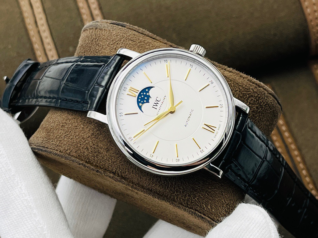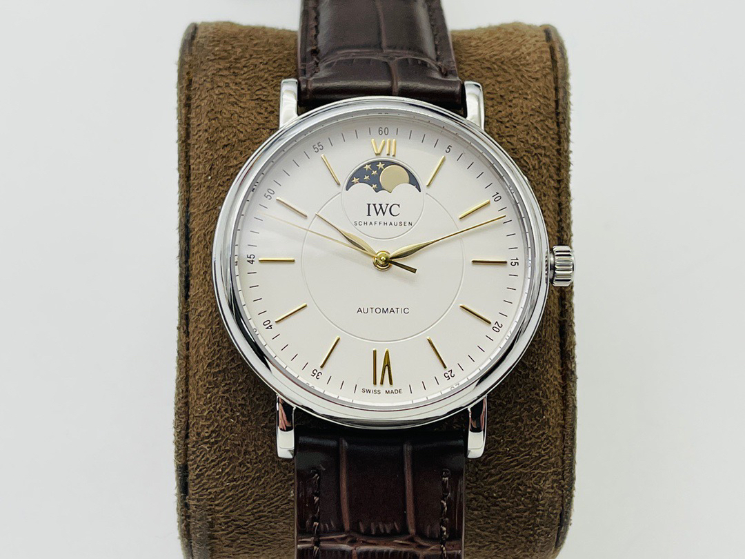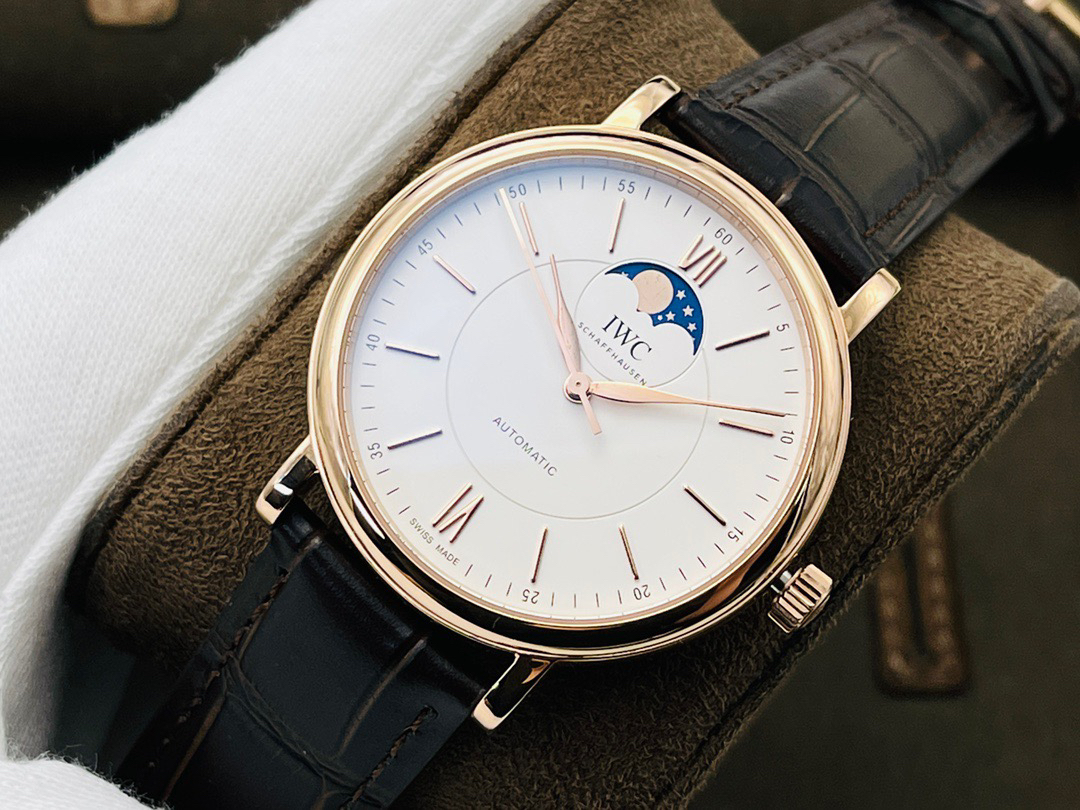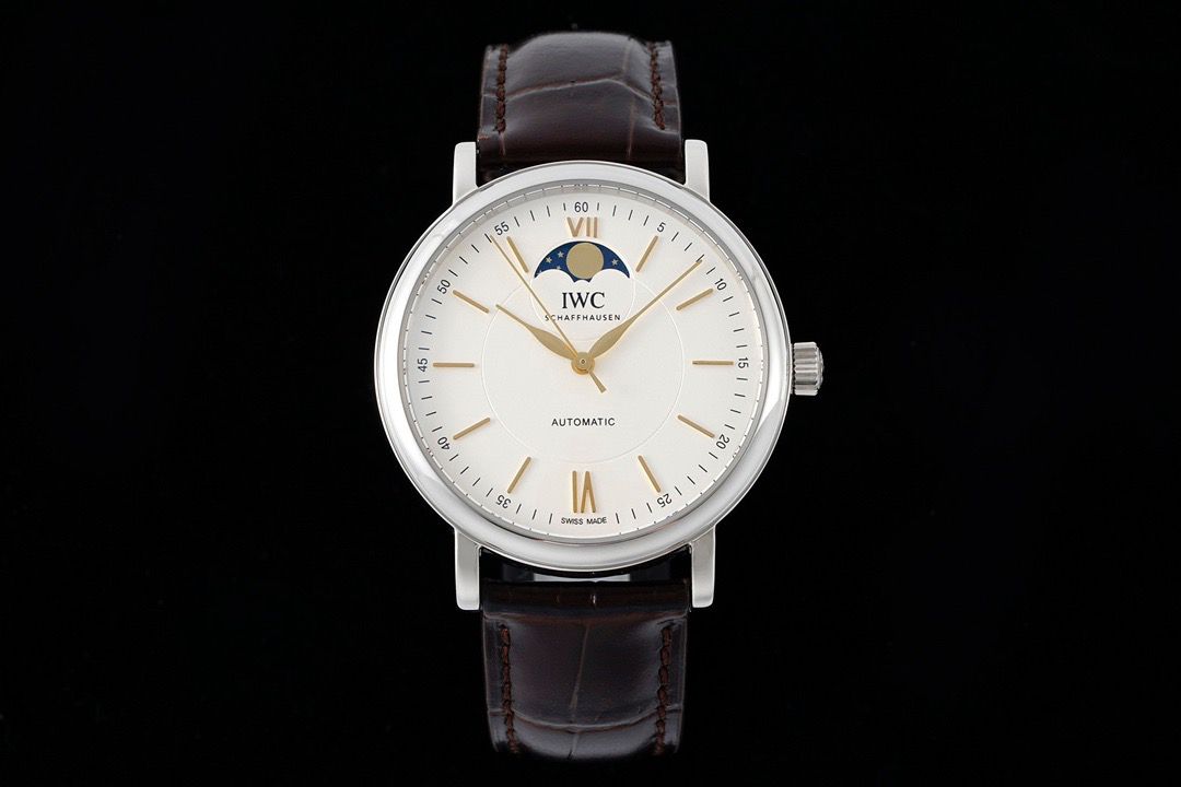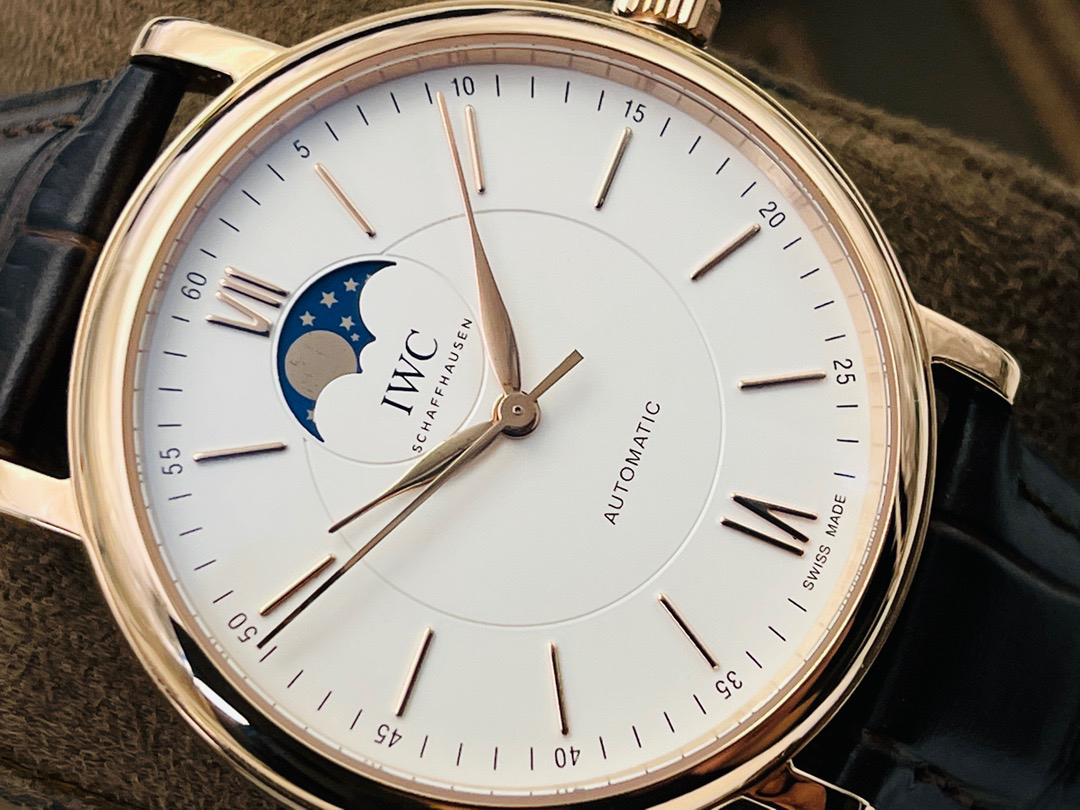 波涛真月相 一天跳一小格 一个月走一圈 同步正品功能 IWC万国推出全新波涛菲诺系列40mm月相精钢机械男表IW459401,IW459402。月相显示无疑是所有复杂功能中最梦幻美丽的月相显示设计成一面繁星密布的夜空,月亮和星星仿若悬浮在无边无际的苍穹之中。月相以不同场景呈现于人们眼前——月亮时而闪现于云朵之中,时而悬浮于繁星闪烁的夜空之下。柳叶形指针以优雅的姿态勾勒出时间的神韵全新定制版原装进口全自动机械机芯,走时精准、稳定、耐用 腕表采用一枚造型精美的穹形蓝宝石水晶玻璃表镜,表镜经双面防眩处理偷光光清晰,边缘处圆润的弧度透着典雅的气息。表冠侧面饰以简洁的三角坑纹,结合相对较为突出的表冠设计,上链手感非常舒适不锈钢表壳造型圆润、精巧,其表耳微微弯曲的弧度符合人体工程学,贴合手腕,佩戴舒适。柏涛菲诺腕表系列一直是万国家族中的谦谦君子,是含蓄气质与高雅品味的完美化身。它以简洁、永恒的设计成为万国表最热卖的腕表系列之一,受到男士和女士的一致青睐。万国糅合精准无比的性能和独一无二的设计,为我们呈现了一场美轮美奂的视觉享受。