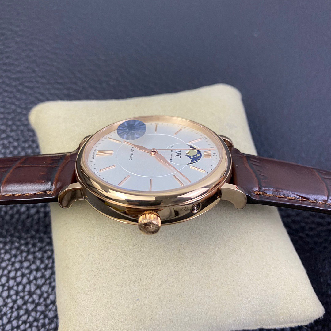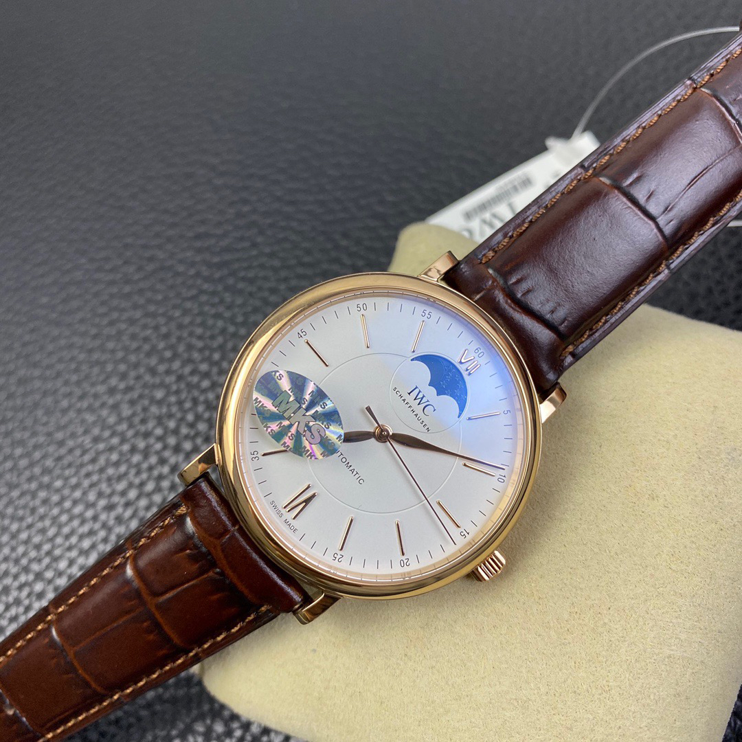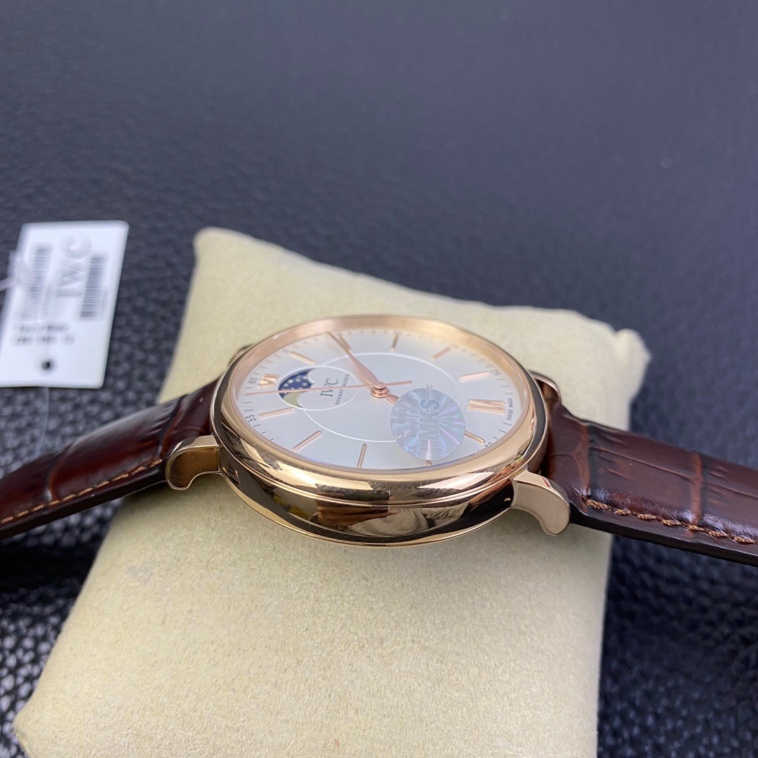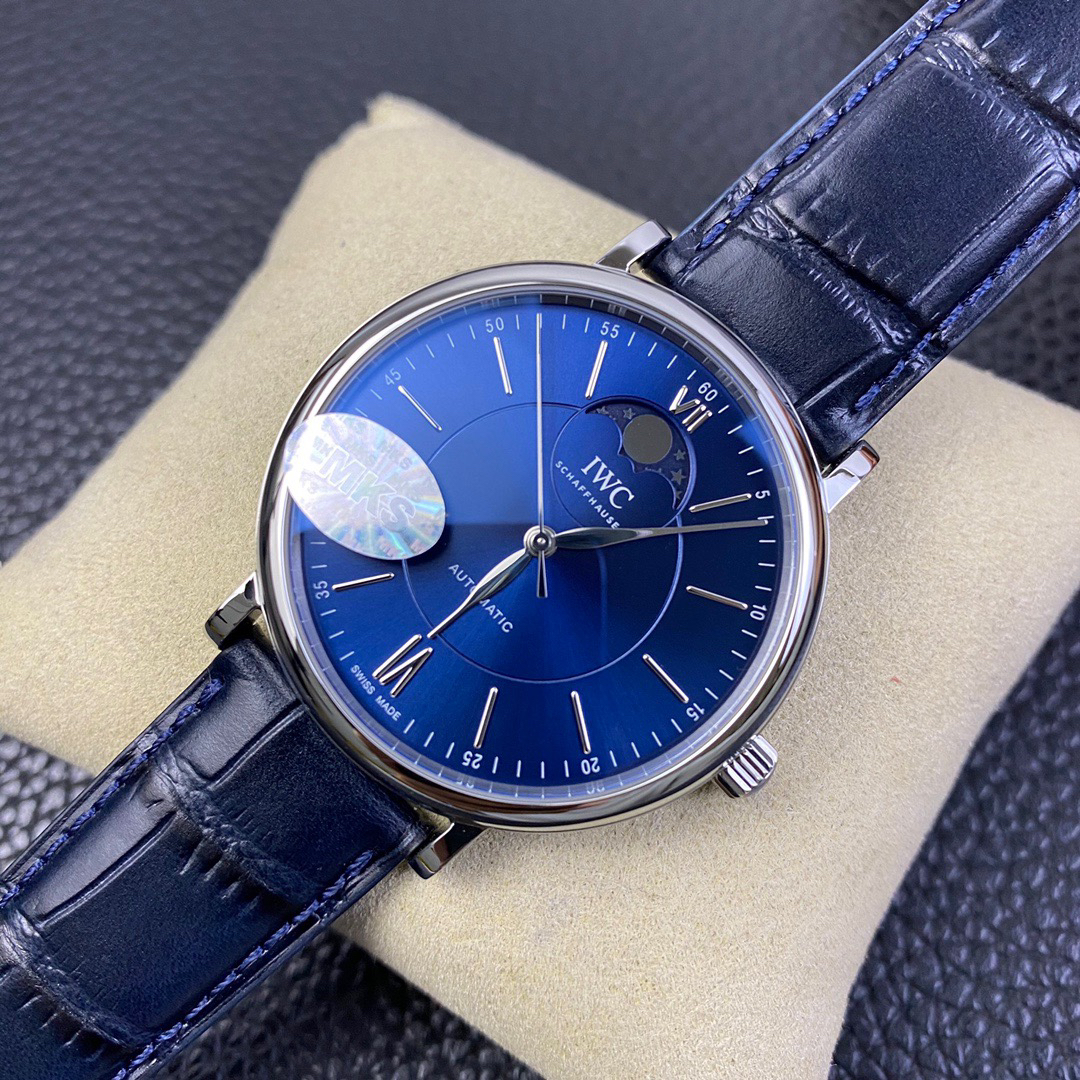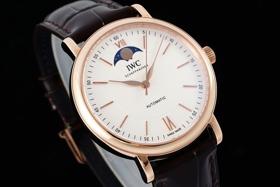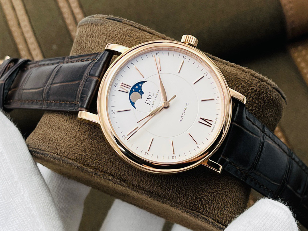 波涛真月相 一天跳一小格 一个月走一圈 同步正品功能 IWC万国推出全新波涛菲诺系列40mm月相精钢机械男表IW459401,IW459402。月相显示无疑是所有复杂功能中最梦幻美丽的月相显示设计成一面繁星密布的夜空,月亮和星星仿若悬浮在无边无际的苍穹之中。月相以不同场景呈现于人们眼前——月亮时而闪现于云朵之中,时而悬浮于繁星闪烁的夜空之下。柳叶形指针以优雅的姿态勾勒出时间的神韵全新定制版原装进口全自动机械机芯,走时精准、稳定、耐用 腕表采用一枚造型精美的穹形蓝宝石水晶玻璃表镜,表镜经双面防眩处理偷光光清晰,边缘处圆润的弧度透着典雅的气息。表冠侧面饰以简洁的三角坑纹,结合相对较为突出的表冠设计,上链手感非常舒适不锈钢表壳造型圆润、精巧,其表耳微微弯曲的弧度符合人体工程学,贴合手腕,佩戴舒适。柏涛菲诺腕表系列一直是万国家族中的谦谦君子,是含蓄气质与高雅品味的完美化身。它以简洁、永恒的设计成为万国表最热卖的腕表系列之一,受到男士和女士的一致青睐。万国糅合精准无比的性能和独一无二的设计,为我们呈现了一场美轮美奂的视觉享受。