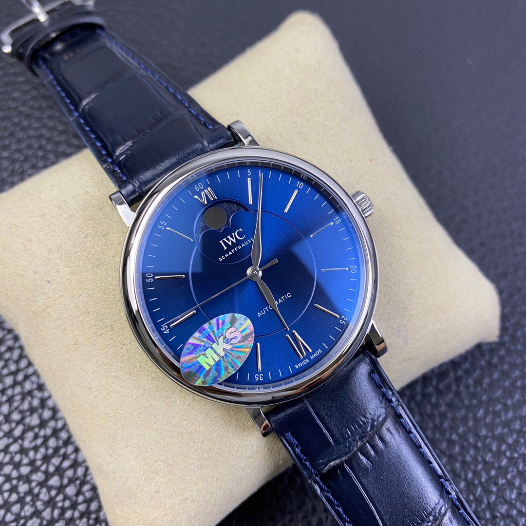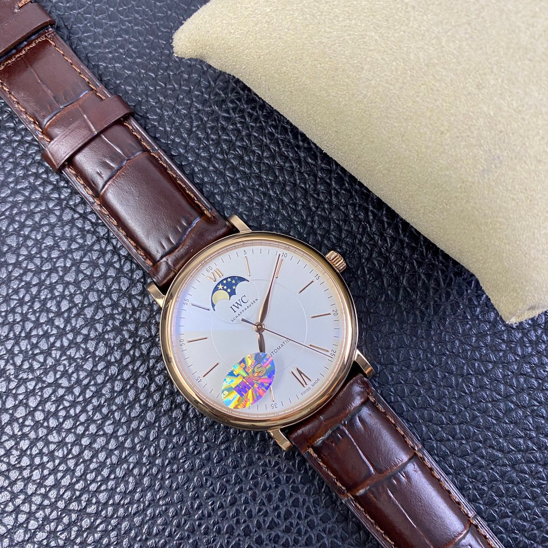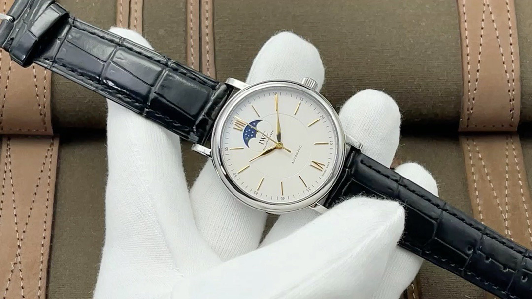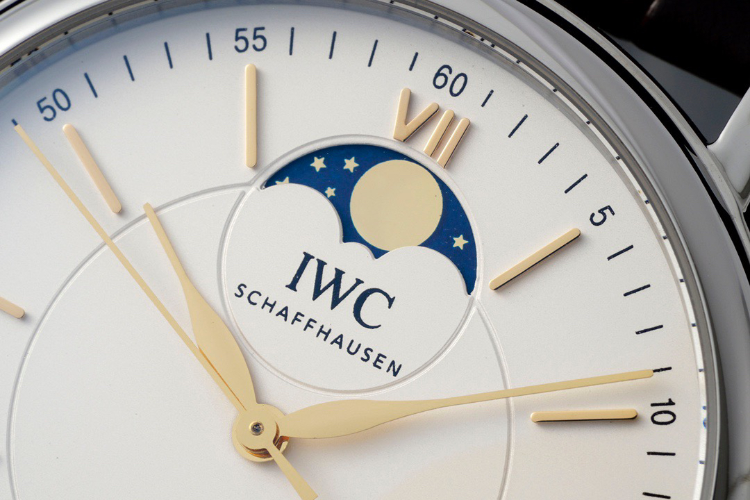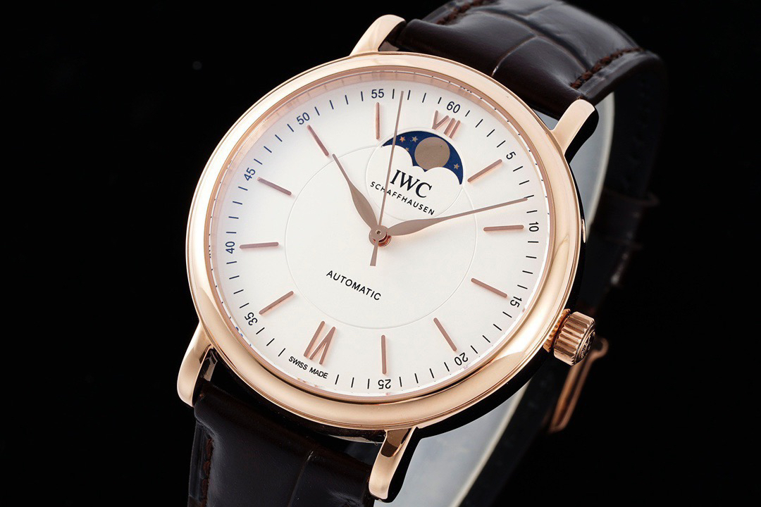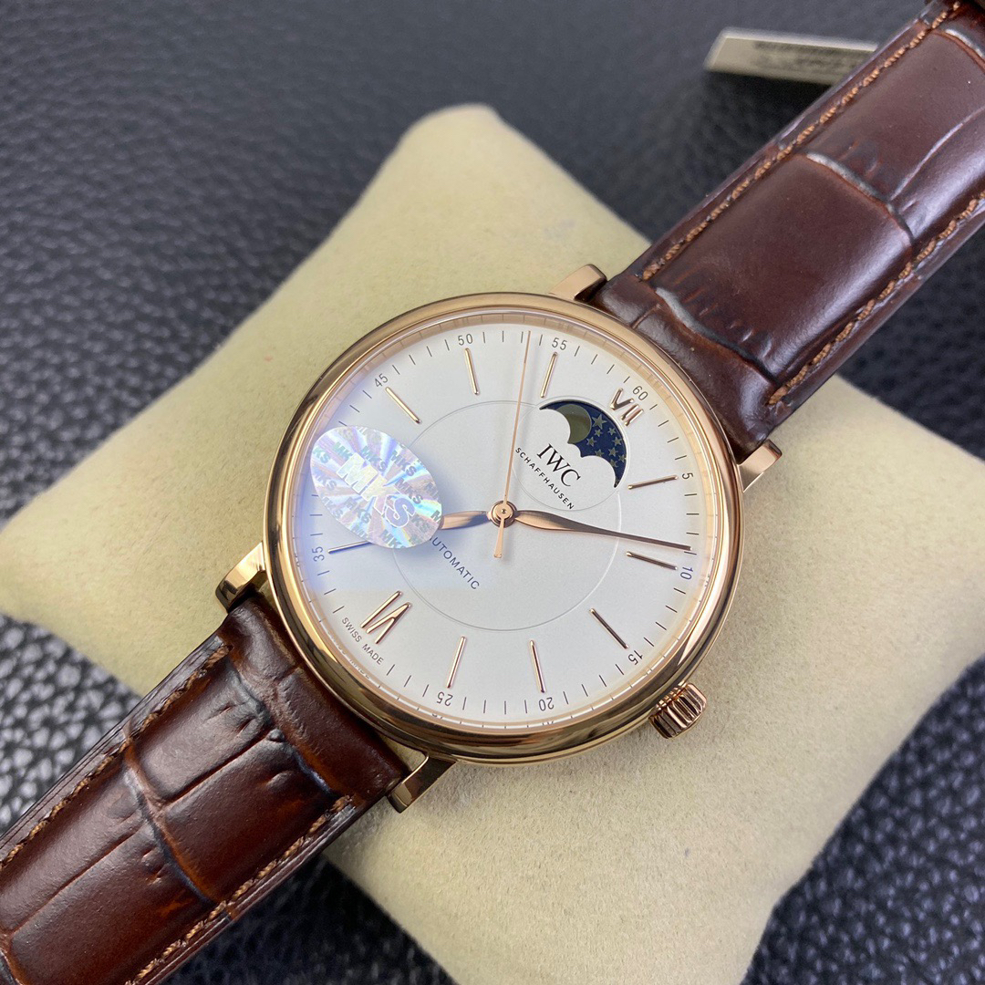 波涛真月相 一天跳一小格 一个月走一圈 同步正品功能 IWC万国推出全新波涛菲诺系列40mm月相精钢机械男表IW459401,IW459402。月相显示无疑是所有复杂功能中最梦幻美丽的月相显示设计成一面繁星密布的夜空,月亮和星星仿若悬浮在无边无际的苍穹之中。月相以不同场景呈现于人们眼前——月亮时而闪现于云朵之中,时而悬浮于繁星闪烁的夜空之下。柳叶形指针以优雅的姿态勾勒出时间的神韵全新定制版原装进口全自动机械机芯,走时精准、稳定、耐用 腕表采用一枚造型精美的穹形蓝宝石水晶玻璃表镜,表镜经双面防眩处理偷光光清晰,边缘处圆润的弧度透着典雅的气息。表冠侧面饰以简洁的三角坑纹,结合相对较为突出的表冠设计,上链手感非常舒适不锈钢表壳造型圆润、精巧,其表耳微微弯曲的弧度符合人体工程学,贴合手腕,佩戴舒适。柏涛菲诺腕表系列一直是万国家族中的谦谦君子,是含蓄气质与高雅品味的完美化身。它以简洁、永恒的设计成为万国表最热卖的腕表系列之一,受到男士和女士的一致青睐。万国糅合精准无比的性能和独一无二的设计,为我们呈现了一场美轮美奂的视觉享受。