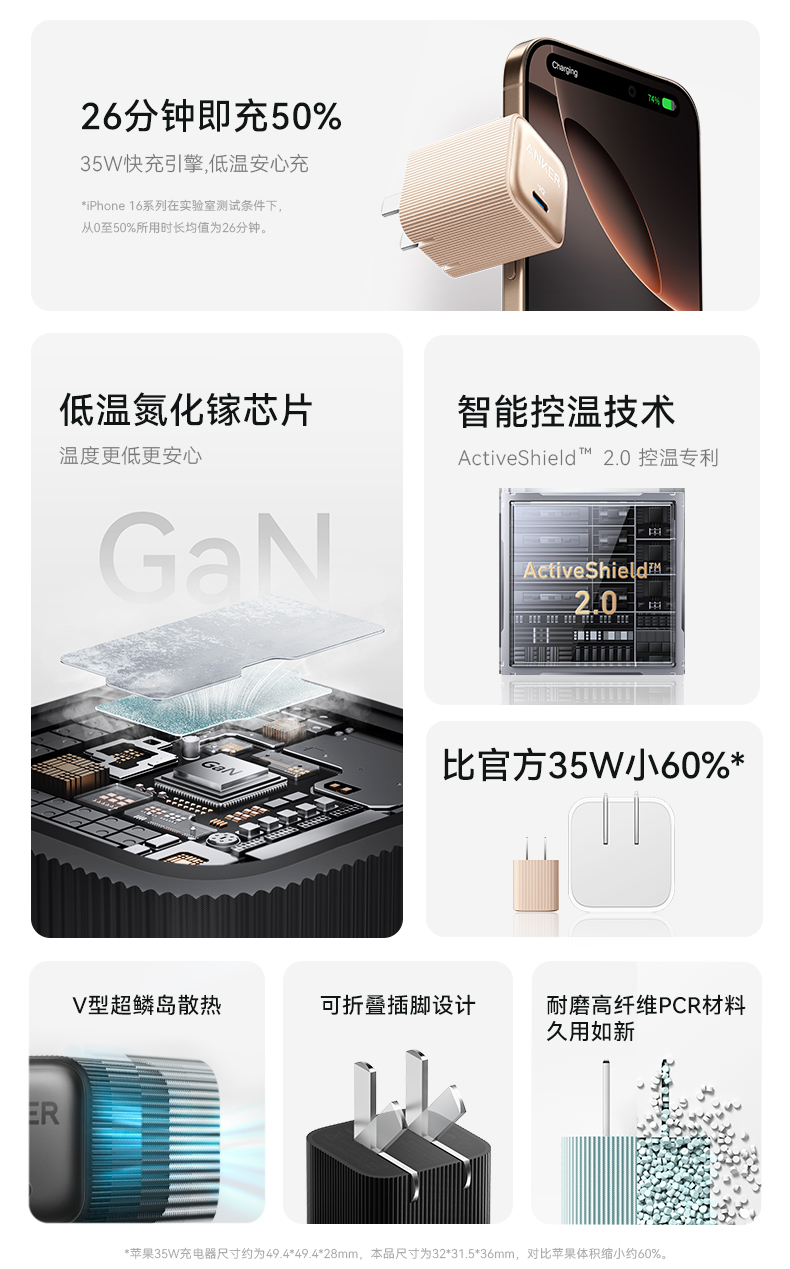 Anker安克 35W可折叠脚插 充电器 氮化镓