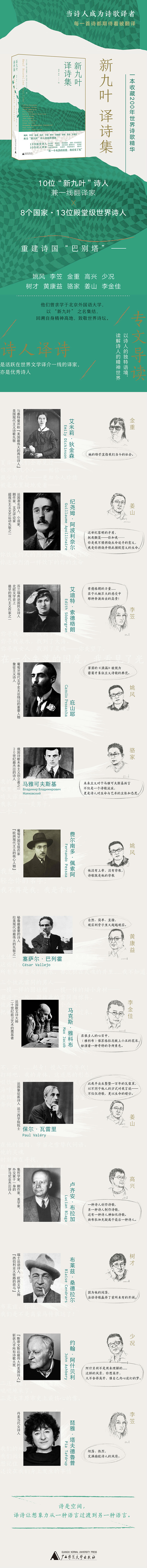 法语诗中,有被誉为“西伯利亚大铁路上的荷马”的瑞士法语诗人桑德拉尔,著名象征派诗人保尔·瓦雷里,超现实主义文艺运动先驱之一阿波利奈尔,散文诗大师马克斯·雅科布。葡语诗有对象征主义影响深远的庇山耶,“欧洲现代主义的核心人物”佩索阿。来自美国的有“与惠特曼并称美国最伟大的两位诗人”的艾米莉·狄金森、“斯蒂文斯后最伟大的美国诗人”阿什贝利。此外还有芬兰瑞典语国民女诗人索德格朗,丹麦当代女诗人琵雅·塔夫德鲁普,集哲学家、剧作家、外交家于一身的罗马尼亚诗人布拉加,秘鲁最重要的诗人巴列霍,俄国诗歌未来主义创立者马雅可夫斯基......