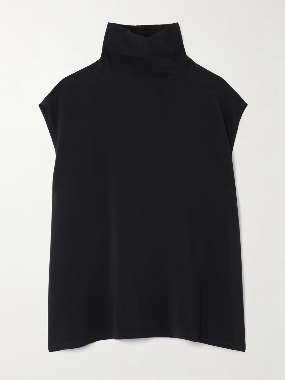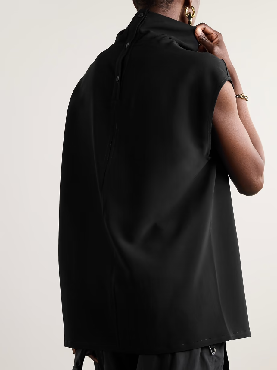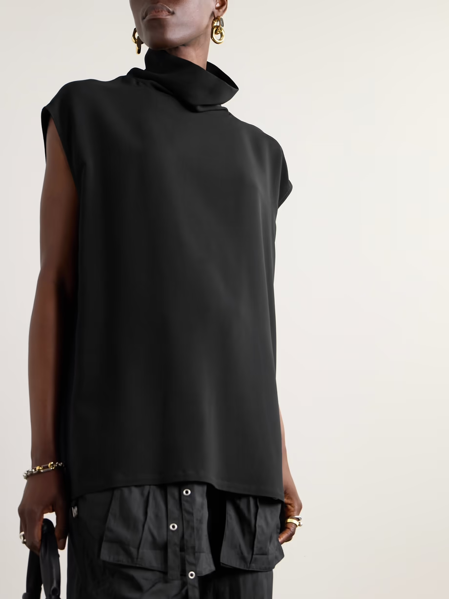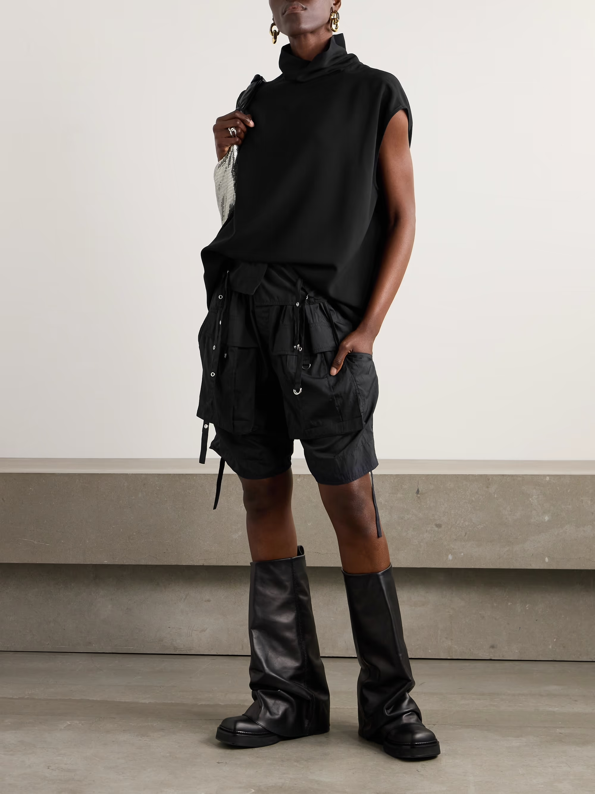 Rick Owens 的“Edfu”上衣体现了该品牌的粗犷风格。它采用绉纱剪裁而成,配有厚实的高领毛衣和短袖。将它塞进皮夹克里看起来很不错。
