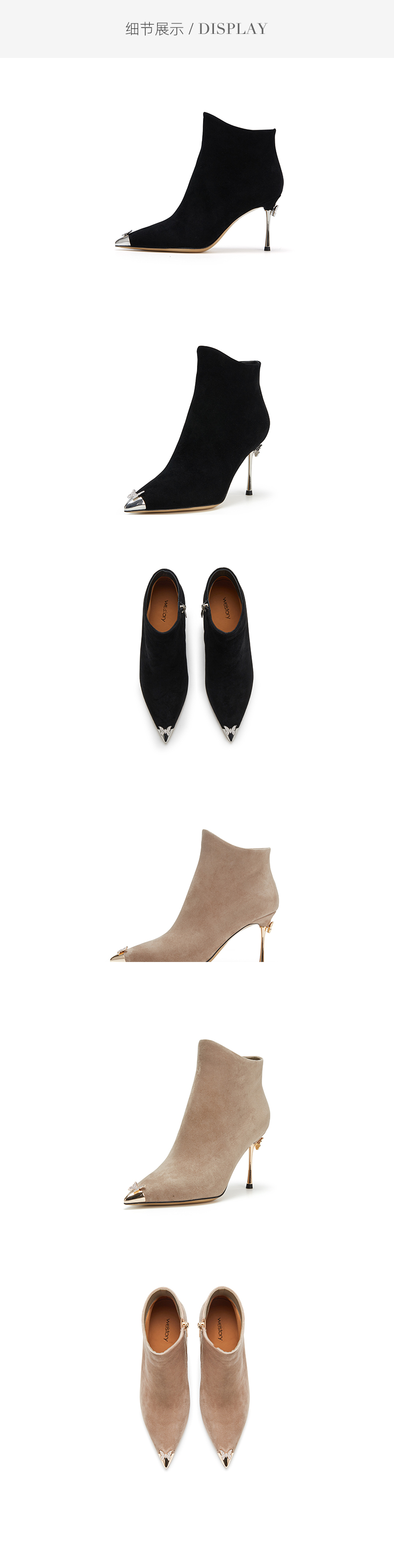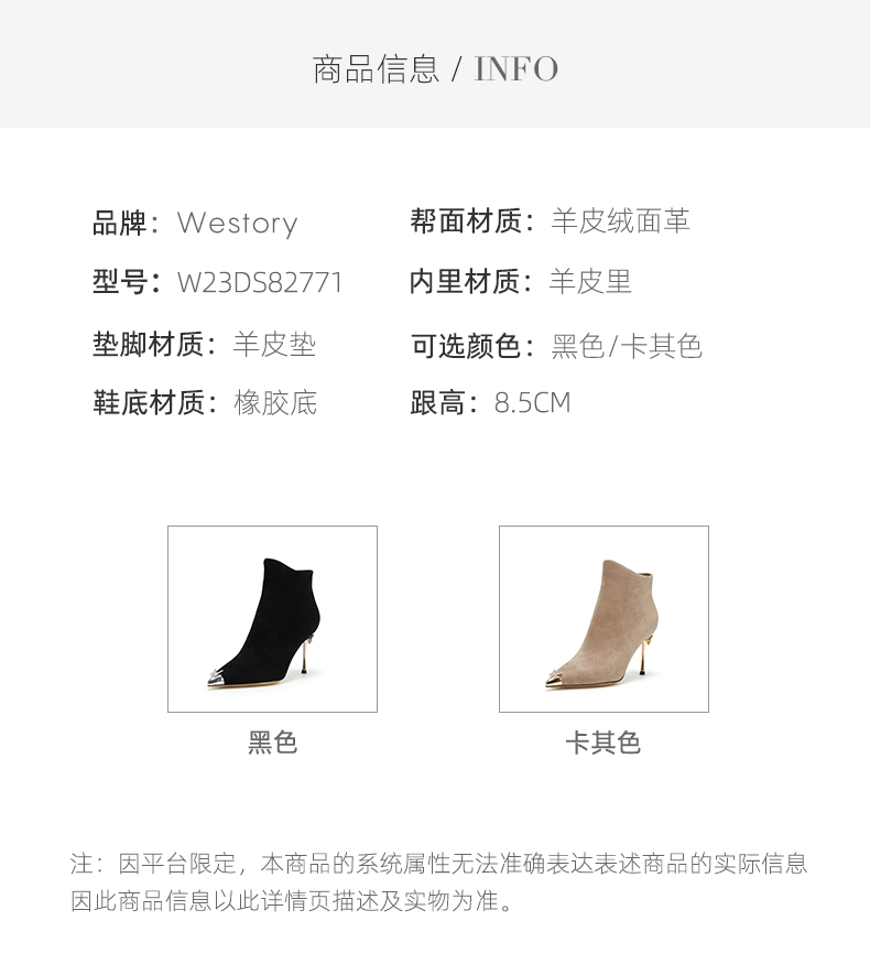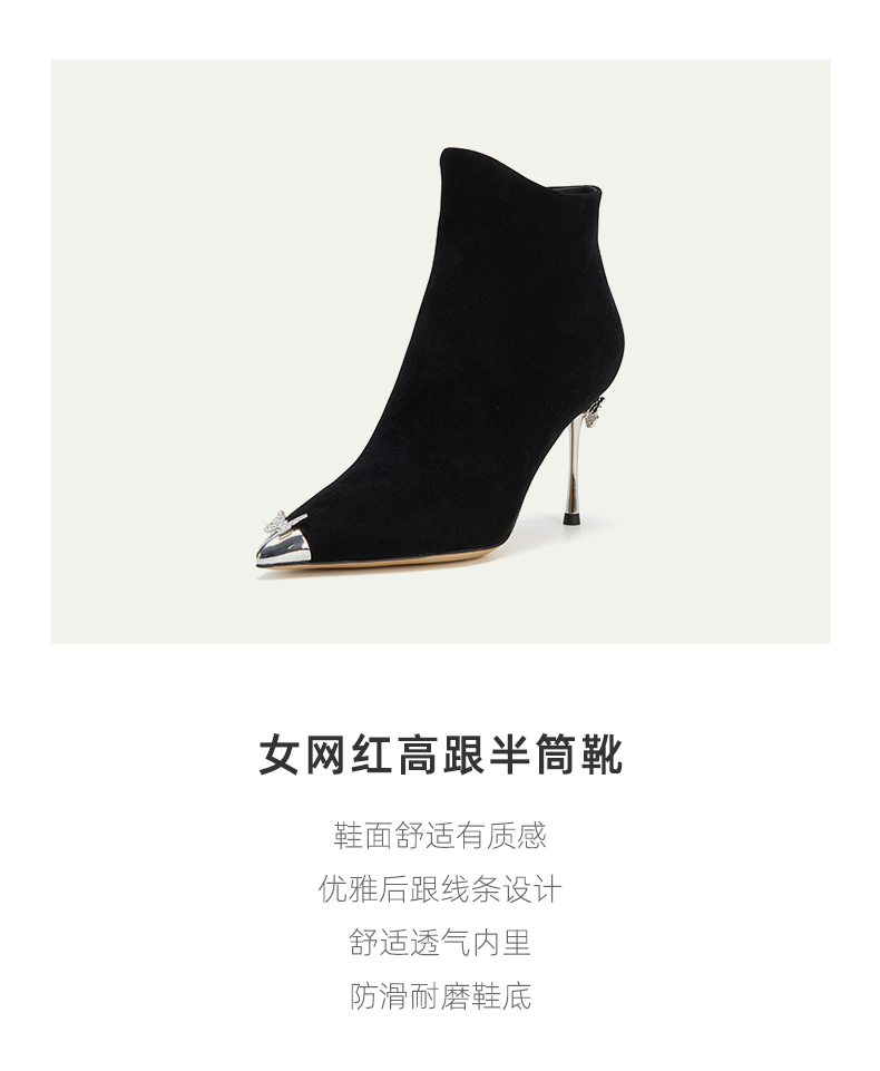 westory2023秋季新品女网红高跟半筒靴金属尖头细跟脚踝靴W23DS82771