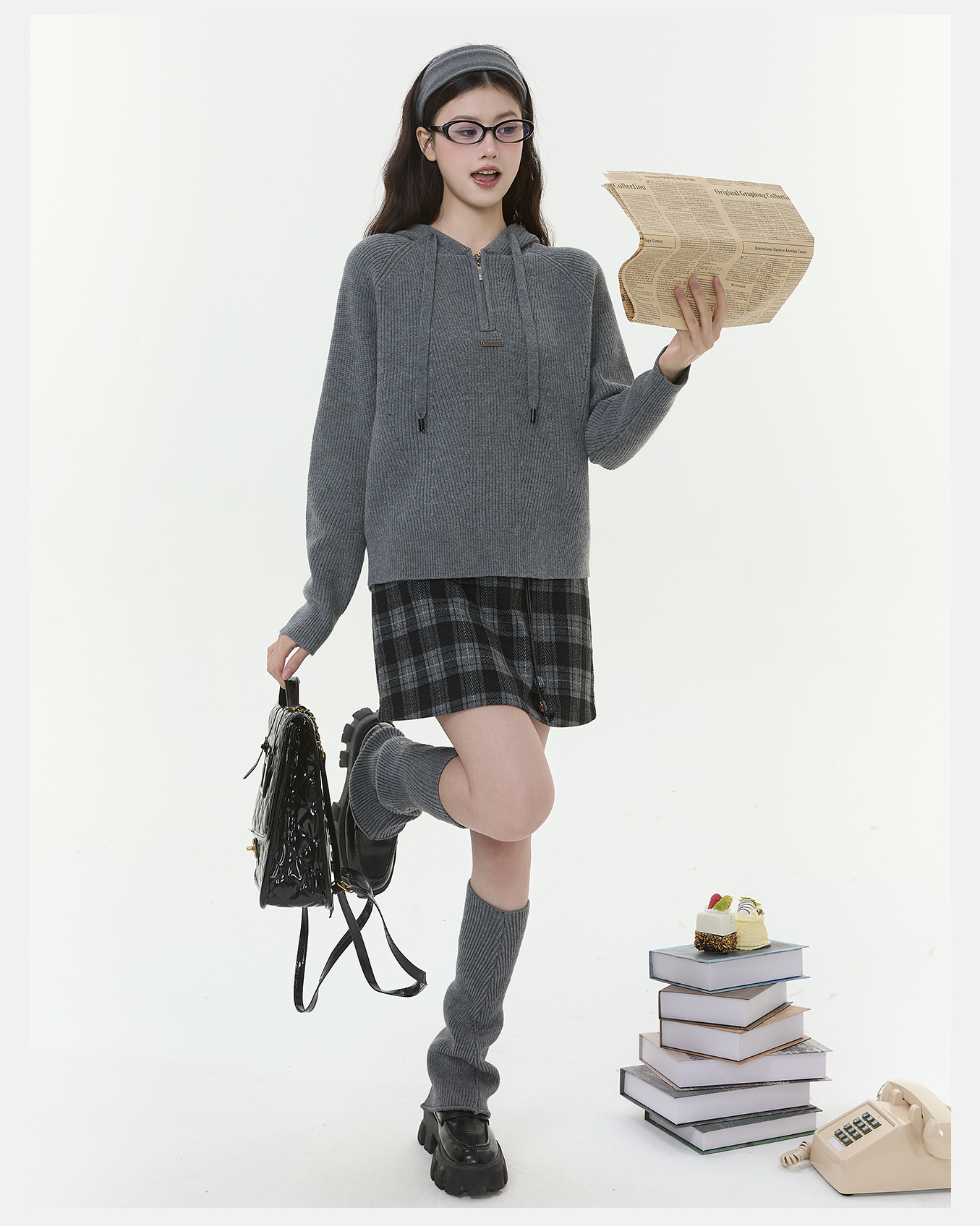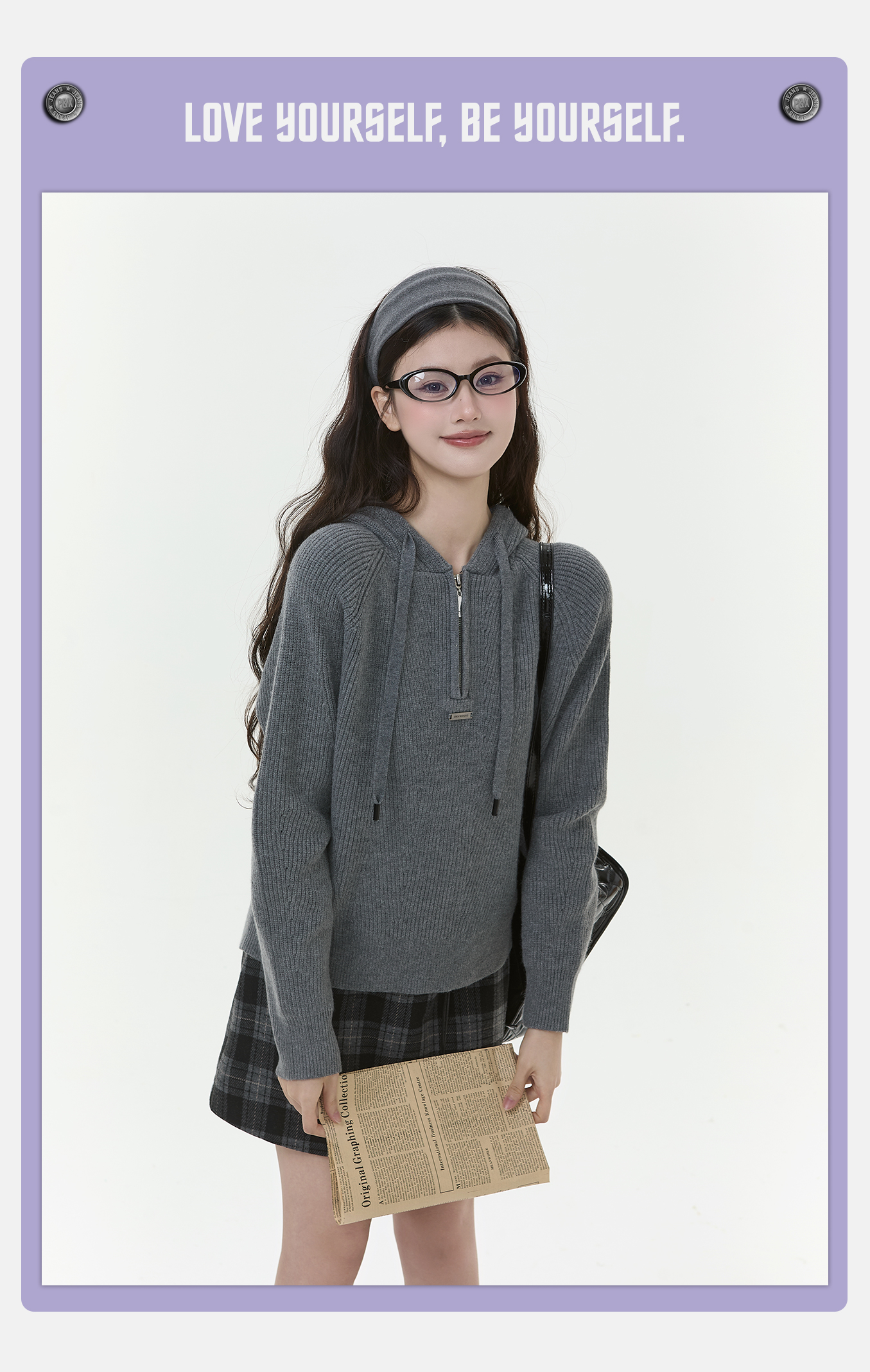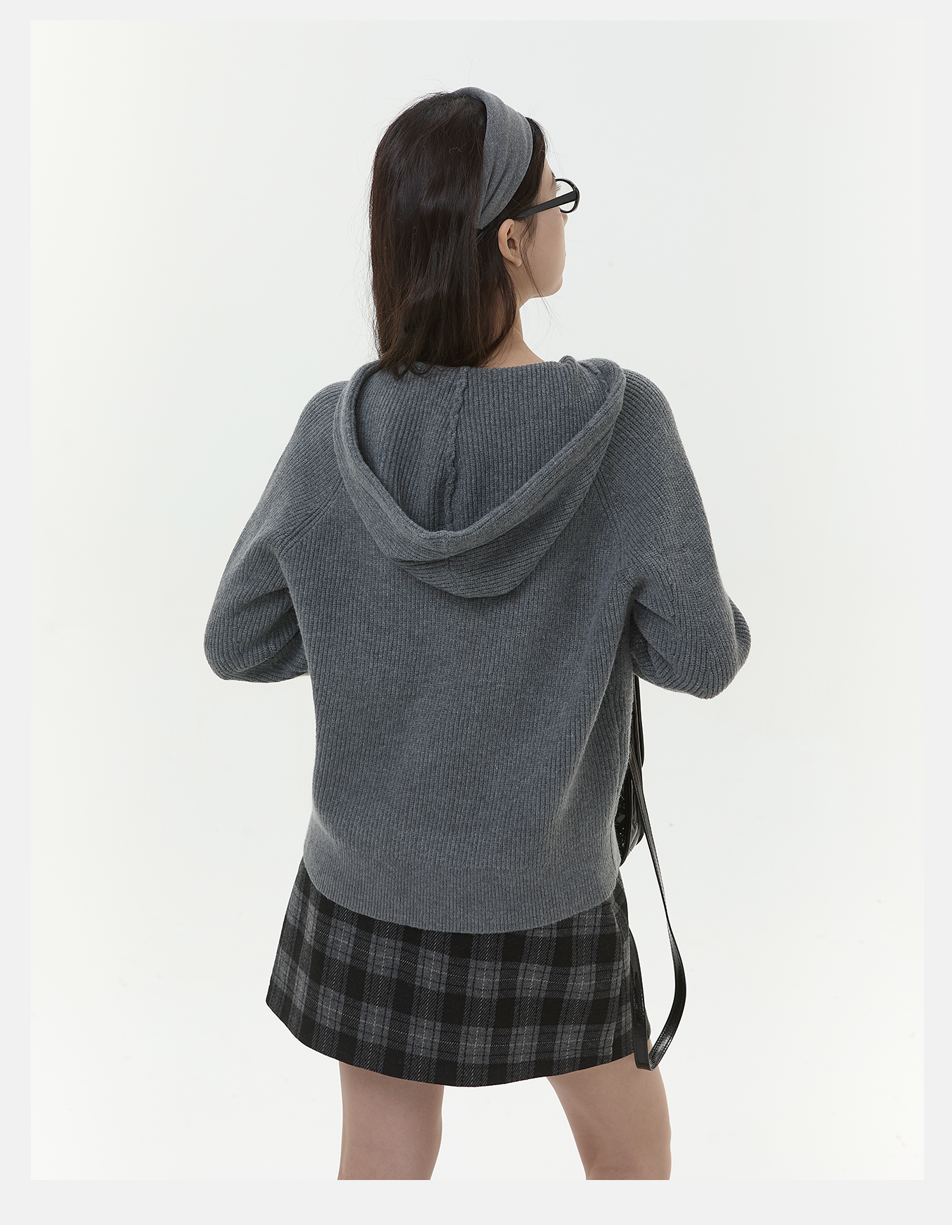 P&X设计师女装2025冬季半拉链连帽宽松短款毛衣825418175 灰色