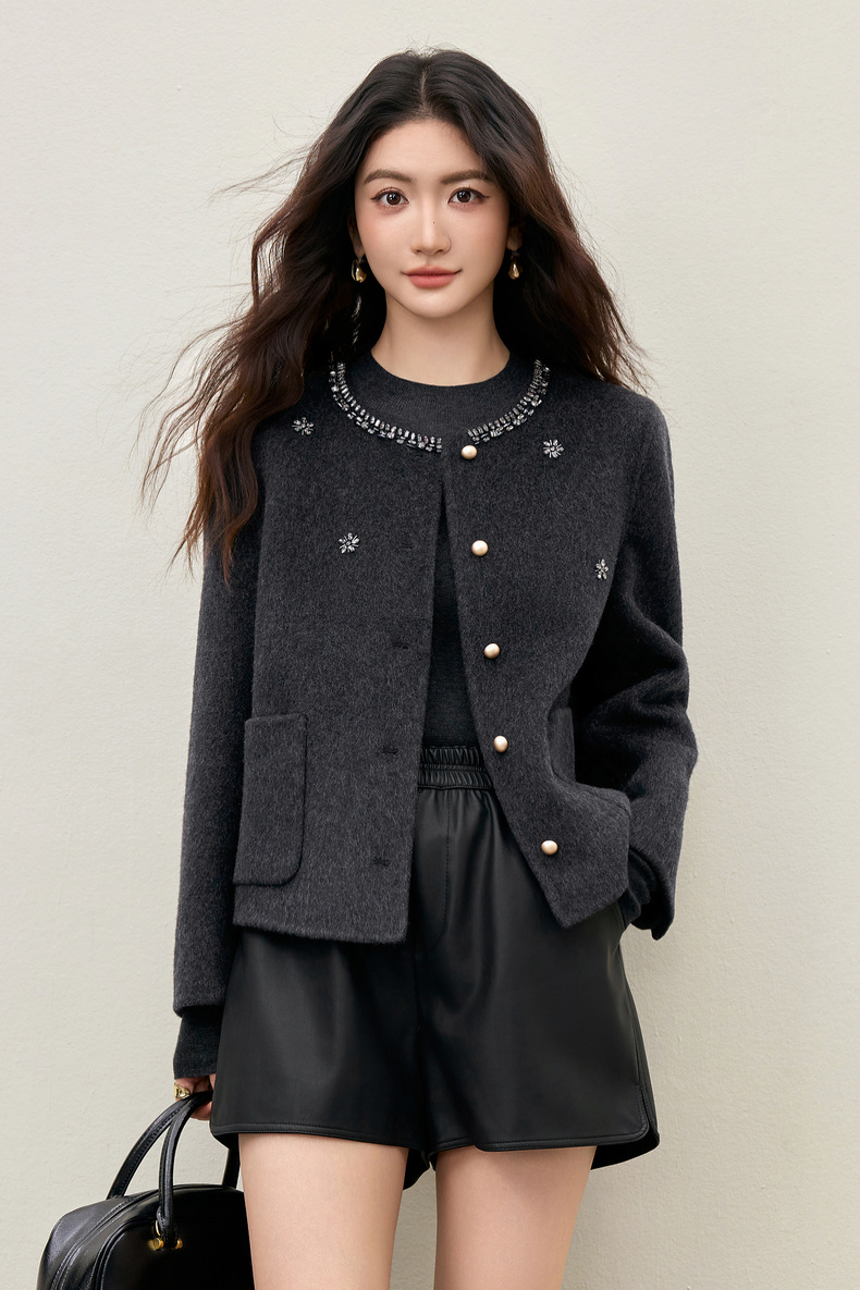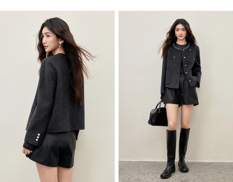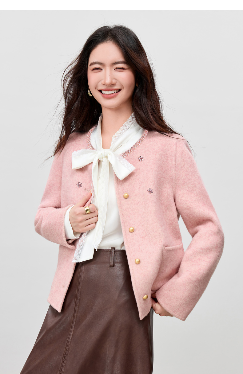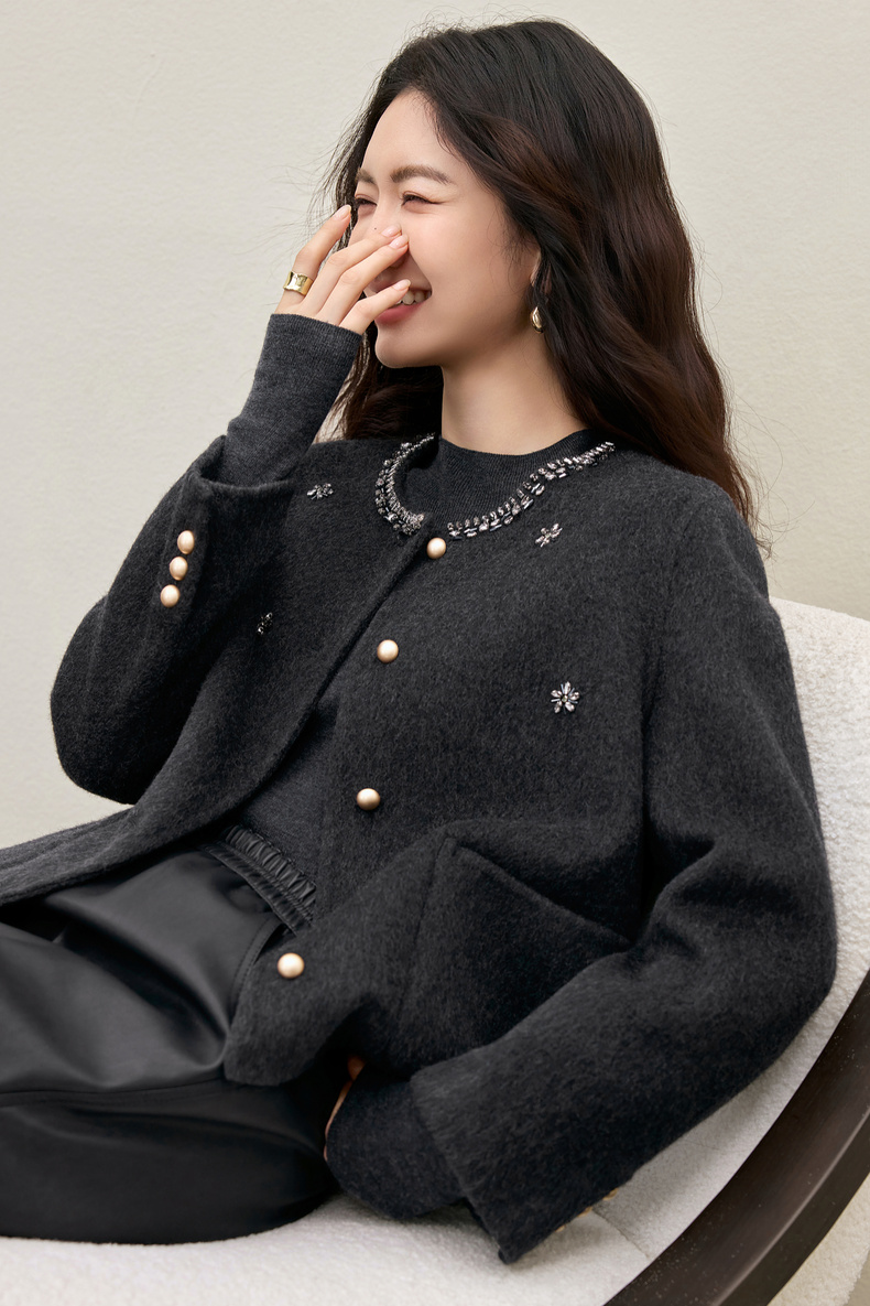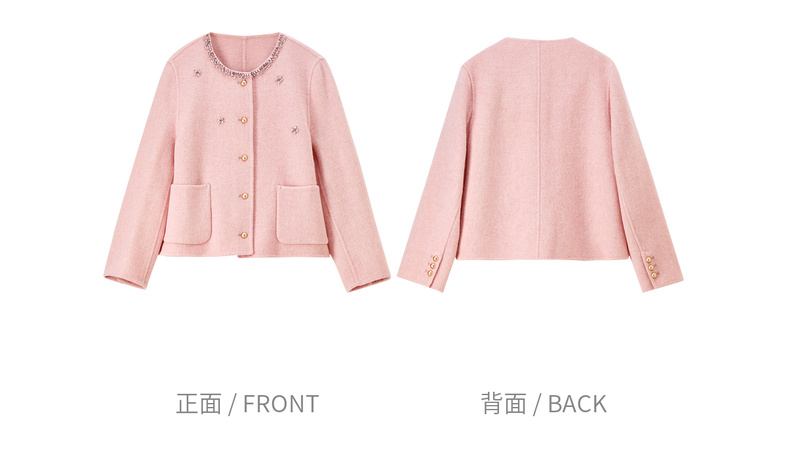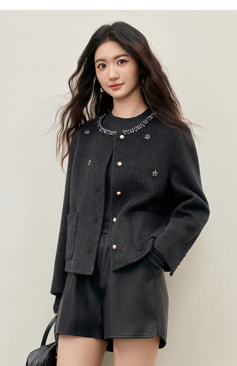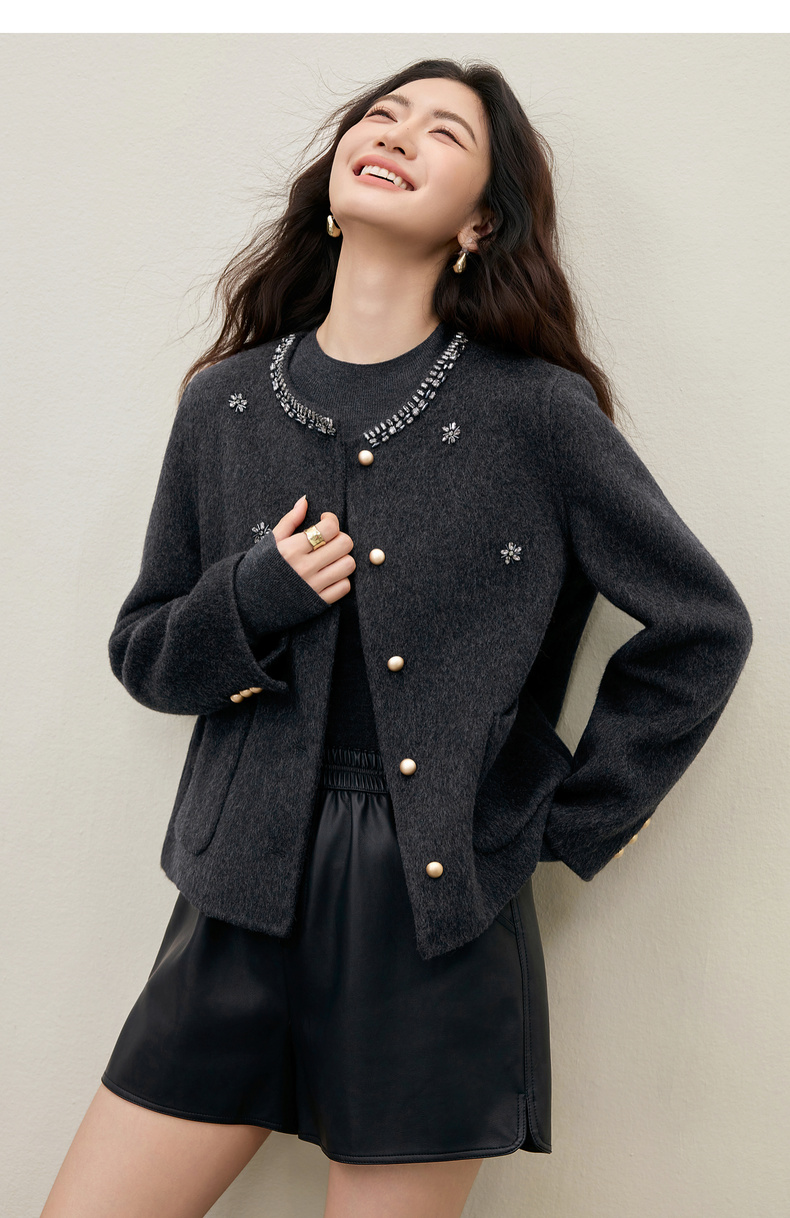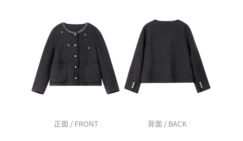 【内购】【绵羊毛】优雅手工钉珠圆领撞色蘑菇扣厚实保暖短款双面呢外套-W54OG4828