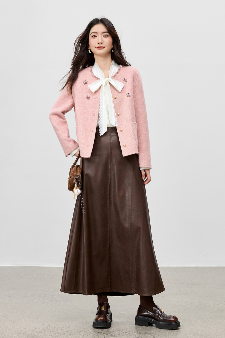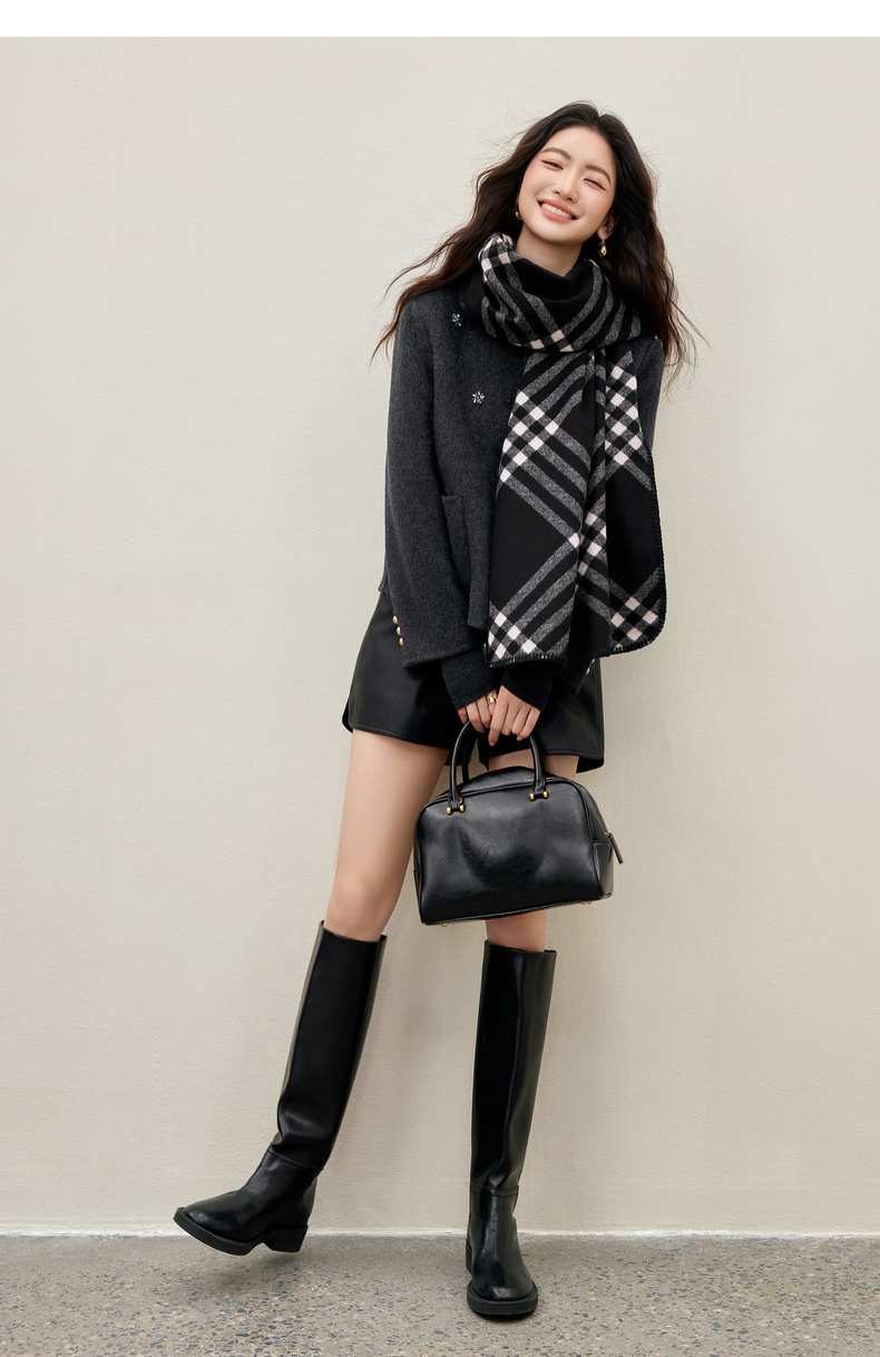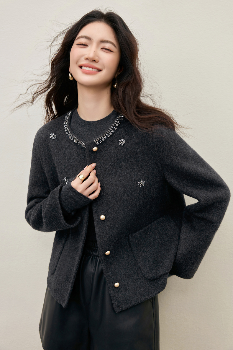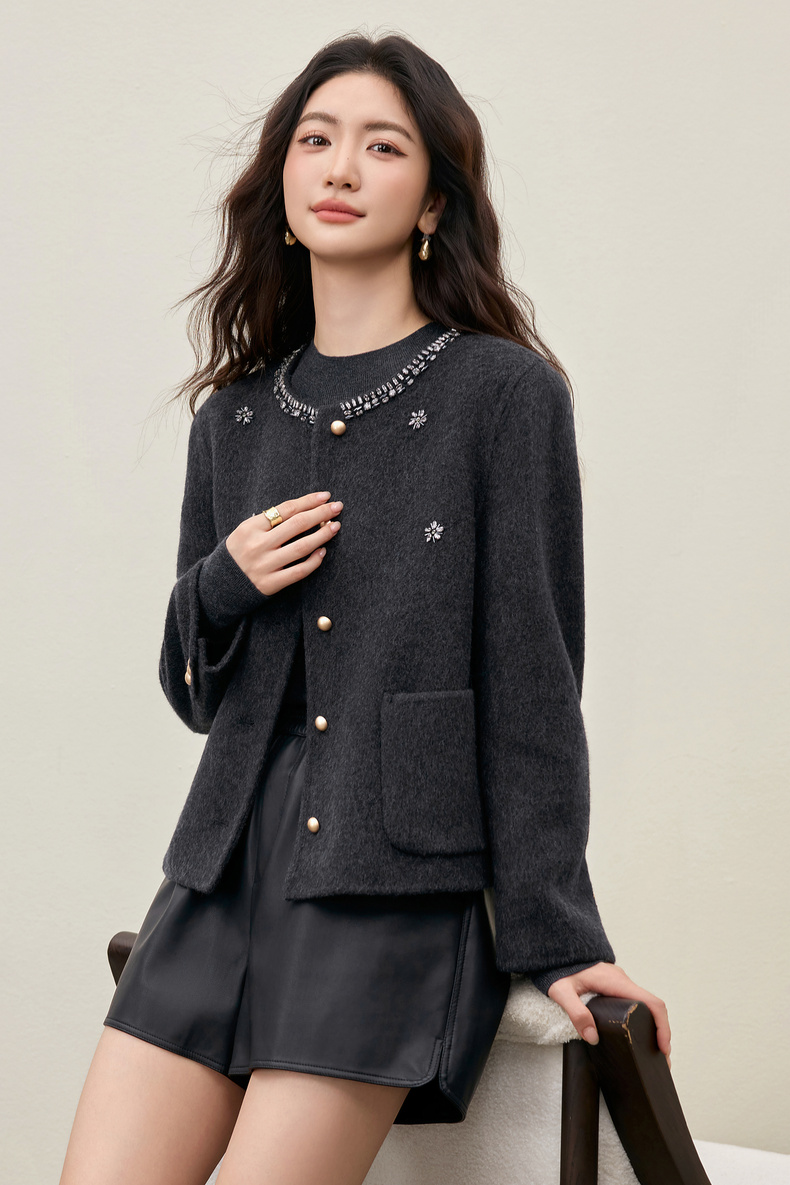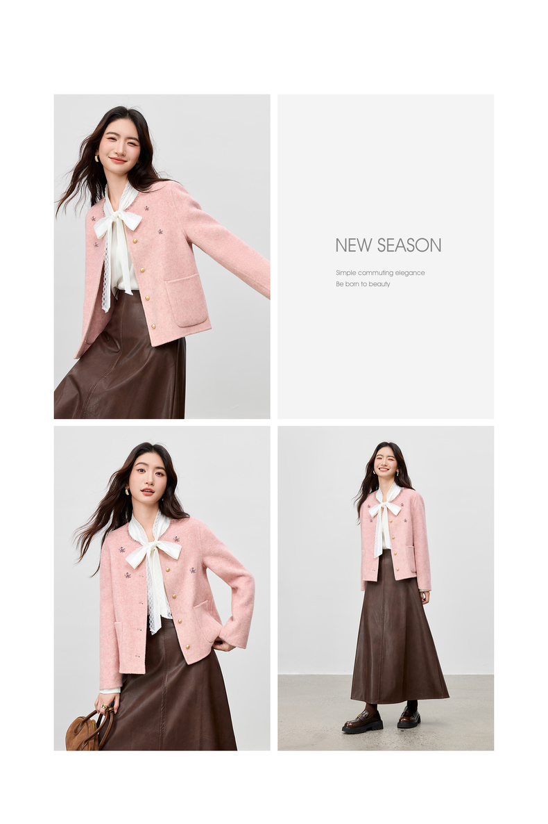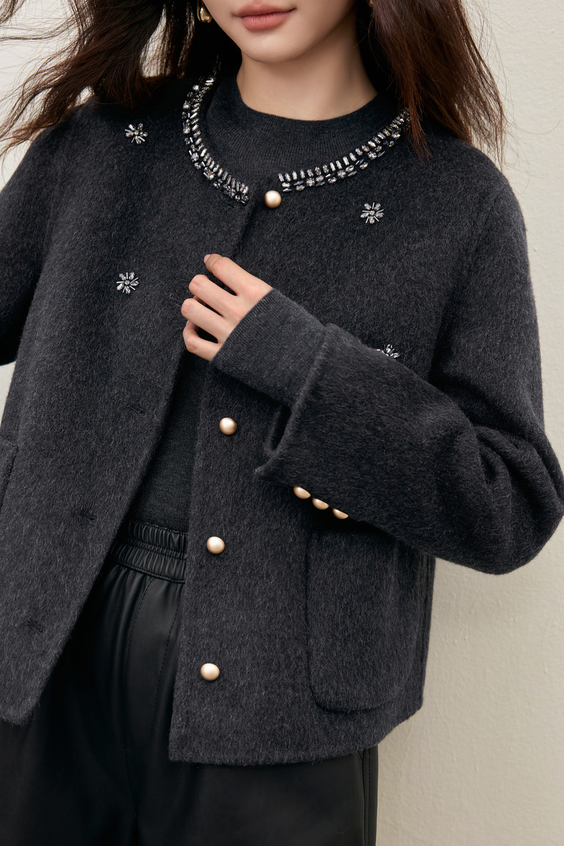 【内购】【绵羊毛】优雅手工钉珠圆领撞色蘑菇扣厚实保暖短款双面呢外套-W54OG4828