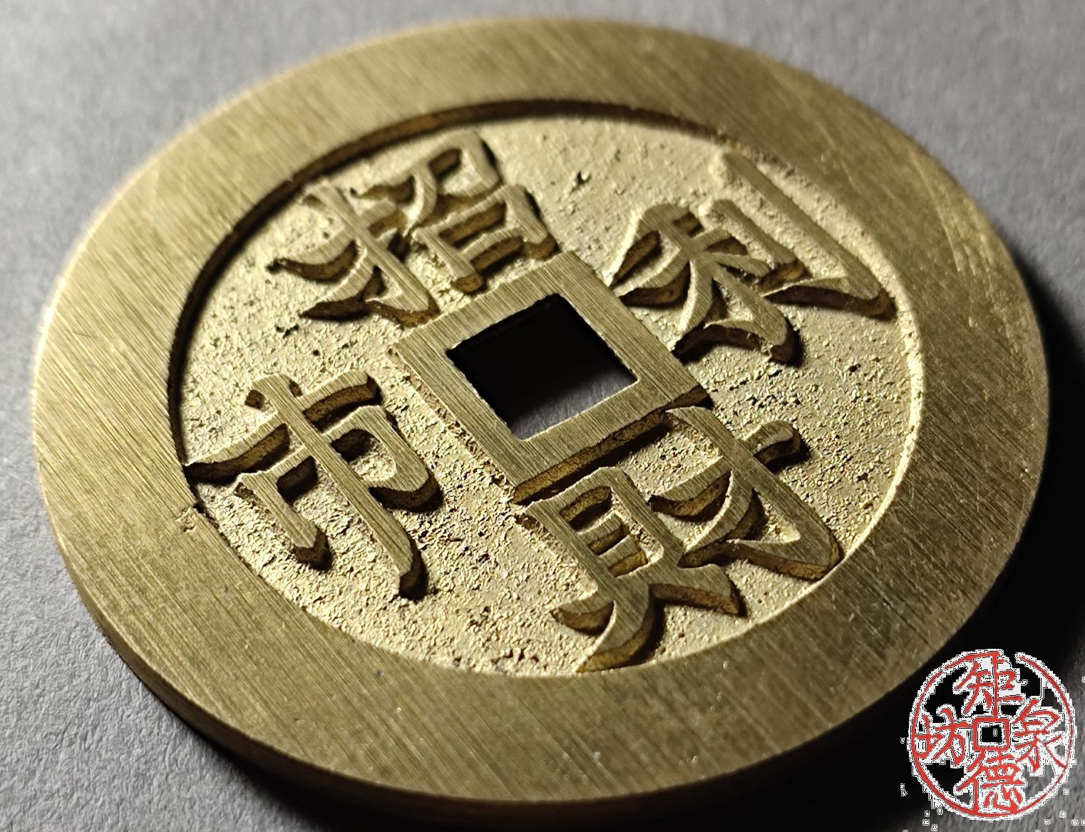 为了尽量还原古代钱币的文字神韵与时代铸造特征,每一枚都进行手工修刀、打磨。会有打磨痕迹、刻刀痕迹,铸造气孔或者微小沙眼,这正是手工与机器制作的区别,并非瑕疵。