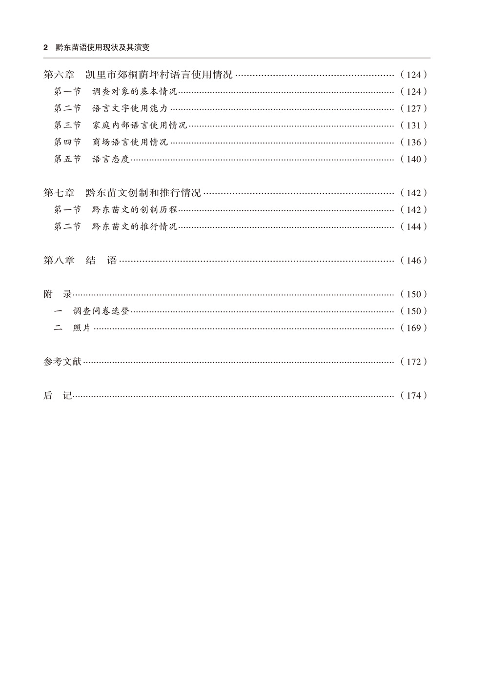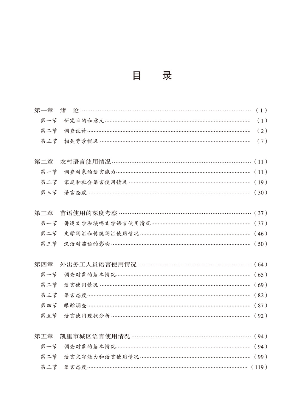 《黔东苗语使用现状及其演变》调查了黔东苗语的使用情况。调查点包括黔东南苗族侗族自治州凯里市湾水镇鱼良村的上下鱼良、凯里市洗马河街道桐荫坪村、凯里市市区机关、台江县台拱镇报恩村下寨、麻江县白午村、雷山县西江镇开觉村、三都水族自治县普安镇总奖村等7个点。基本体现出目前黔东苗语的使用情况,为有关政府部门制定语言政策、语言规划提供有价值的依据。