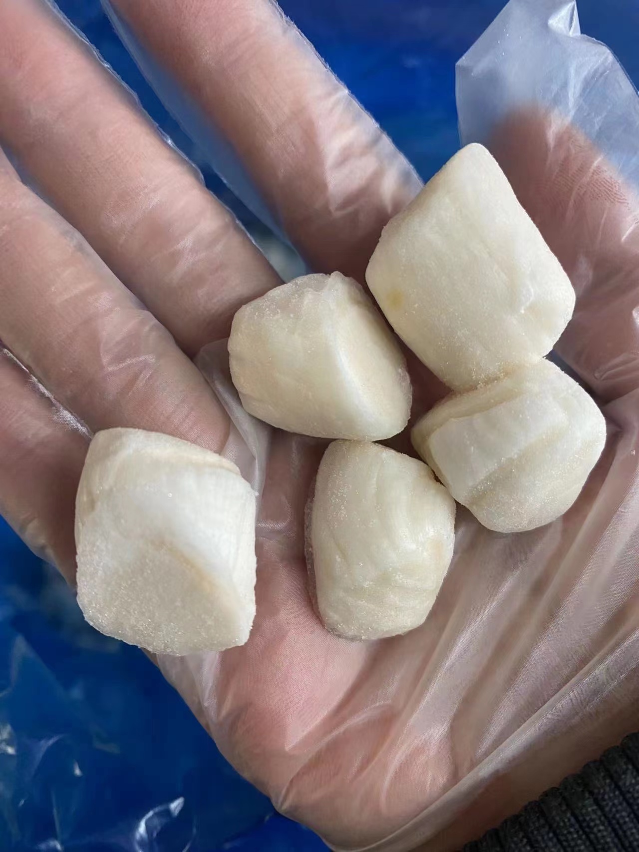 大部分人买的是这种湿哒哒的泡水丁每粒瑶柱粒上挂着冰渣