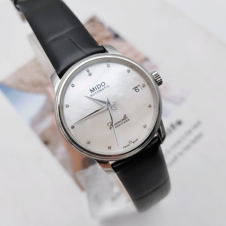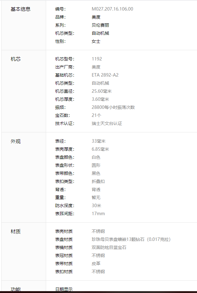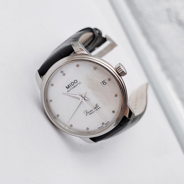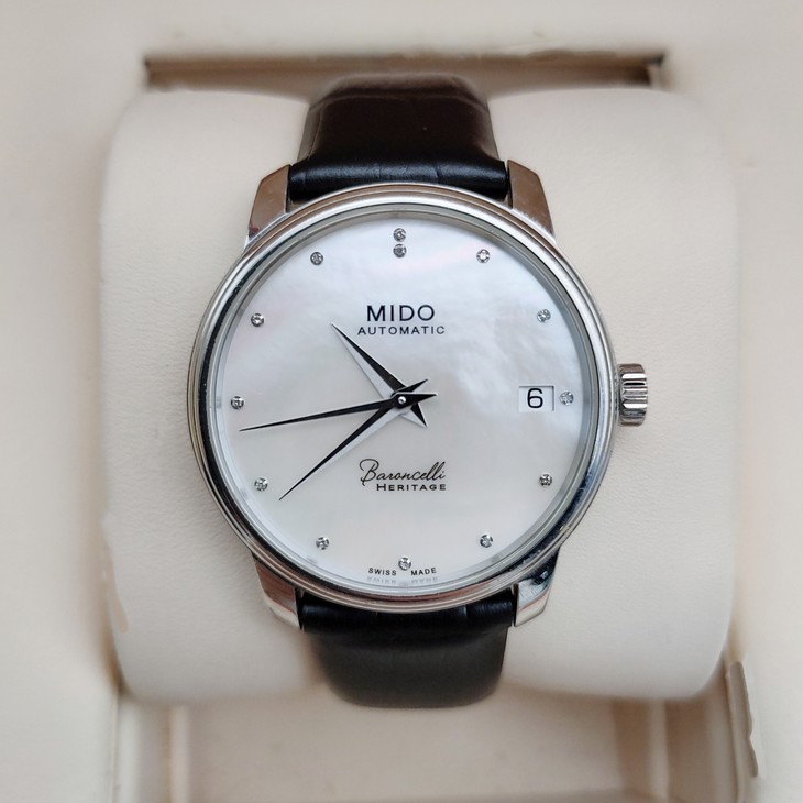 美度贝伦赛丽系列M027.207.16.106.00女款机械表,33mm表径,白色贝母盘面,精钢表壳皮带,钻石刻度,日期显示,单表9成新,专柜价8000,现好价