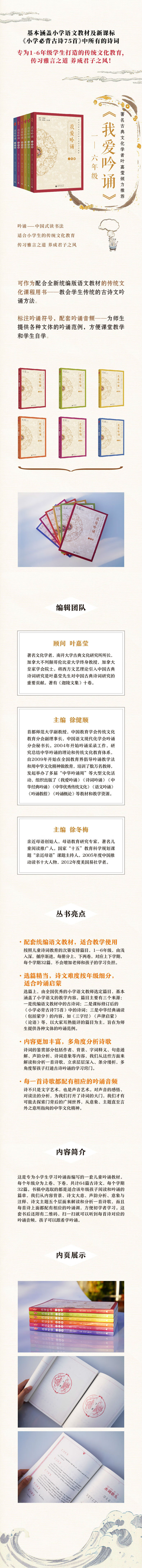 1.配套统编语文教材,方便老师和学生使用。按照儿童诗词教育的次第安排篇目,1—6年级,由浅入深,循序渐进。每册分上、下两卷,对应上下学期,每个学期32篇,不会增加老师和孩子的学习负担。